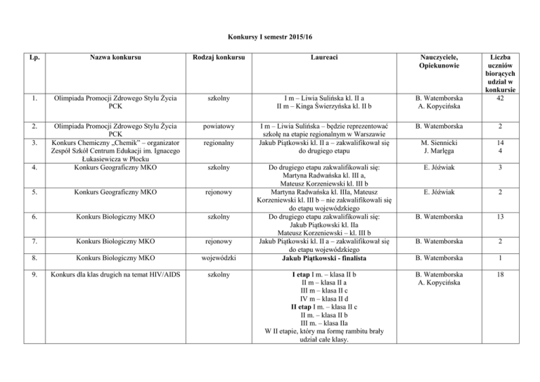 Konkursy I semestr 2015/16 Lp. Nazwa konkursu Rodzaj konkursu