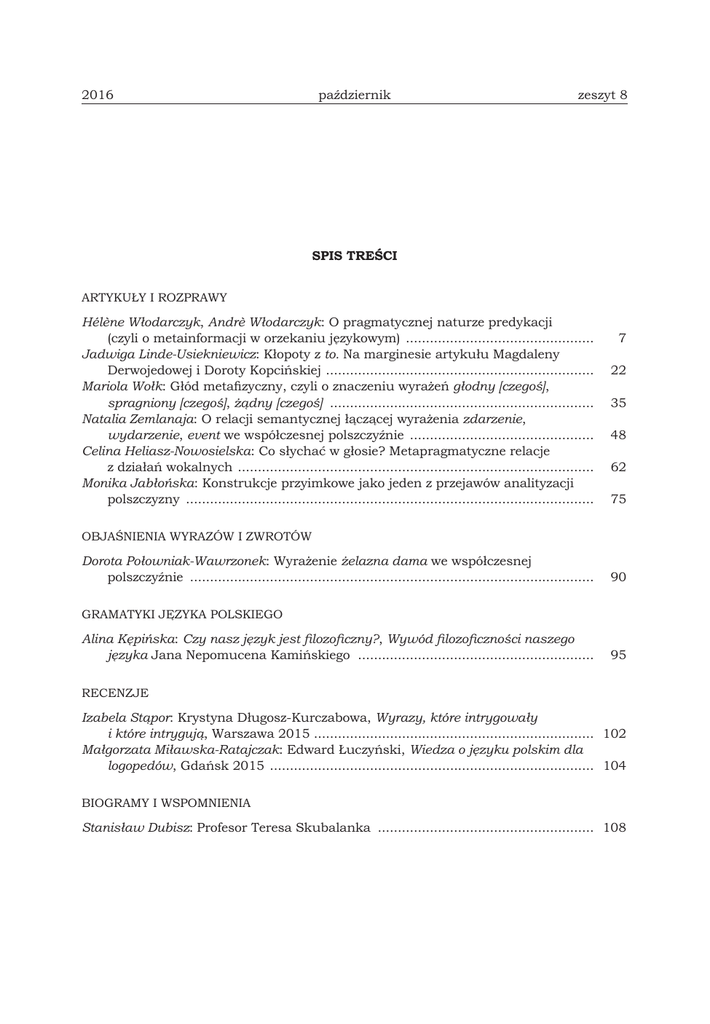 Poradnik Językowy NR 8/2016 - SPIS TREŚCI