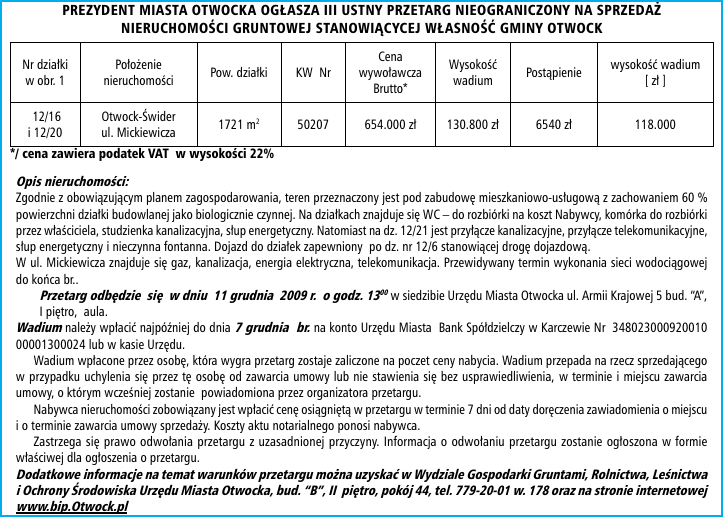 PREZYDENT MIASTA OTWOCKA OGŁASZA III USTNY PRZETARG NIEOGRANICZONY NA SPRZEDAŻ NIERUCHOMOŚCI GRUNTOWEJ STANOWIĄCYCEJ WŁASNOŚĆ GMINY OTWOCK Nr działki w obr. 1 Położenie nieruchomości Pow. działki KW Nr Cena wywoławcza Brutto* Wysokość wadium Postąpienie wysokość wadium [ zł ] 12/16 i 12/20 Otwock-Świder ul. Mickiewicza 1721 m2 50207 654.000 zł 130.800 zł 6540 zł 118.000 */ cena zawiera podatek VAT w wysokości 22% Opis nieruchomości: Zgodnie z obowiązującym planem zagospodarowania, teren przeznaczony jest pod zabudowę mieszkaniowo-usługową z zachowaniem 60 % powierzchni działki budowlanej jako biologicznie czynnej. Na działkach znajduje się WC – do rozbiórki na koszt Nabywcy, komórka do rozbiórki przez właściciela, studzienka kanalizacyjna, słup energetyczny. Natomiast na dz. 12/21 jest przyłącze kanalizacyjne, przyłącze telekomunikacyjne, słup energetyczny i nieczynna fontanna. Dojazd do działek zapewniony po dz. nr 12/6 stanowiącej drogę dojazdową. W ul. Mickiewicza znajduje się gaz, kanalizacja, energia elektryczna, telekomunikacja. Przewidywany termin wykonania sieci wodociągowej do końca br.. Przetarg odbędzie się w dniu 11 grudnia 2009 r. o godz. 1300 w siedzibie Urzędu Miasta Otwocka ul. Armii Krajowej 5 bud. “A”, I piętro, aula. Wadium należy wpłacić najpóźniej do dnia 7 grudnia br. na konto Urzędu Miasta Bank Spółdzielczy w Karczewie Nr 348023000920010 00001300024 lub w kasie Urzędu. Wadium wpłacone przez osobę, która wygra przetarg zostaje zaliczone na poczet ceny nabycia. Wadium przepada na rzecz sprzedającego w przypadku uchylenia się przez tę osobę od zawarcia umowy lub nie stawienia się bez usprawiedliwienia, w terminie i miejscu zawarcia umowy, o którym wcześniej zostanie powiadomiona przez organizatora przetargu. Nabywca nieruchomości zobowiązany jest wpłacić cenę osiągniętą w przetargu w terminie 7 dni od daty doręczenia zawiadomienia o miejscu i o terminie zawarcia umowy sprzedaży. Koszty aktu notarialnego ponosi nabywca. Zastrzega się prawo odwołania przetargu z uzasadnionej przyczyny. Informacja o odwołaniu przetargu zostanie ogłoszona w formie właściwej dla ogłoszenia o przetargu. Dodatkowe informacje na temat warunków przetargu można uzyskać w Wydziale Gospodarki Gruntami, Rolnictwa, Leśnictwa i Ochrony Środowiska Urzędu Miasta Otwocka, bud. “B”, II piętro, pokój 44, tel. 779-20-01 w. 178 oraz na stronie internetowej www.bip.Otwock.pl