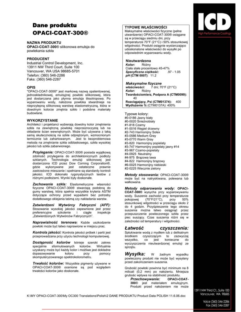 Dane produktu OPACI-COAT-300® TYPOWE WŁAŚCIWOŚCI Maksymalne właściwości fizyczne (pełne utwardzenie) OPACI-COAT-300® osiągane są w przeciągu siedmiu dni, przy temperaturze 70°F (21°C) i 50% stosunkowej wilgotności. Produkt osiągnie wystarczająco udoskonalone właściwości do wysyłki po odpowiednim wyparowaniu wody. NAZWA PRODUKTU OPACI-COAT-300® silikonowa emulsja do powlekania szkła PRODUCENT Industrial Control Development, Inc. 13911 NW Third Court, Suite 100 Vancouver, WA USA 98685-5701 Telefon: (360) 546-2286 Faks: (360) 546-2287 Nieutwardzona Kolor: Różny Ciała stałe procentowo: 45-47% Specyficzna ciężkość: .97 - 1.05 pH (CTM 0007): 11.2 Maksymalne fizyczne OPIS "OPACI-COAT-300®" jest markową nazwą opatentowanej, jednoskładnikowej, emulsyjnej powłoki silikonowej, która jest dostarczana jako płynna emulsja tiksotropowa. Po wyparowaniu wody, nałożona powłoka stwardnieje na nieprzylepną silikonową warstwę elastometryczną, która w dowolnym kolorze zmętnia szkło i podobne materiały budowlane. WYKORZYSTANIE Architekci i projektanci wybierają dowolny kolor zmętnienia szkła na zewnętrzną powłokę nieprzezroczystą lub na okładanie ścian wewnętrznych. Może być używana z taką samą skutecznością na szkle odprężonym, wzmocnionym termicznie lub zahartowanym. Jest to bezproblemowa metoda na zmętnianie szkła odblaskowego, szkła wysokiej jakości lub szkła zabarwionego. Przyleganie: OPACI-COAT-300® posiada wyjątkową zdolność przylegania do architektonicznych podłoży szklanych. Technologia emulsji silikonowej jest dostarczona ICD przez Dow Corning Corporation®, gdzie wykonywane jest ostateczne prawnie zastrzeżone mieszanie i spełniane są standardy kontroli jakości. ICD dokonało rygorystycznych testów z różnymi podłożami. Wyniki były doskonałe. Zachowanie szkła: Elastometryczne własności fizyczne OPACI-COAT-300® stwarzają podobną do gumy warstwę, która spełnia wszystkie kryteria ASTM dotyczące ochrony przed wypadami bez potrzeby dodatkowego oklejania taśmą czy nakładania warstw. Zatwierdzeni Wytwórcy Fabryczni (AFF): Stosowanie wysokiej jakości zapewnione jest przez preferencyjne szkolenie i ciągłe inspekcje „Zatwierdzonych Wytwórców Fabrycznych”. Naprawialność terenowa: Każde uszkodzenie powłoki może być łatwo naprawione w miejscu prac. Kontrola jakości: Kontrola jakości próbek i partii jest przeprowadzana przy użyciu technologii komputerowej. Dostępność kolorów Istnieje szeroki zakres specjalnie sformułowanych kolorów. Wirtualnie uzyskany może być każdy kolor i możliwe jest dokładne dopasowywanie koloru przy pomocy skomputeryzowanego spektrokolorometru. Trwałość kolorów: Wszystkie pigmenty używane w OPACI-COAT-300® ocenione są pod względem trwałości kolorów jako doskonałe. właściwości: 7 dni; 70°F (21°C) Kolor: Różny Twardościomierz, Podpora A (CTM0099): 40 Rozciągający, Psi (CTM01374): 400 Wydłużenie % (CTM0137A): 400% Typowe kolory: #0-0186 Jasny biały #0-0020 Śnieżnobiały #1-818 Czarny #1-0016 Węgiel drzewny #2-743 Harmonijny Solex #3-0586 Medium Gray #3-0770 Warm Gray #3-820 Harmonijny popielaty #3-747 Harmonijny popielaty jasny #14 #3-967 Czarno-popielaty #4-0925 Neutralny #4-975 Brązowa lawa #4-822 Harmonijny brązowy #6-0025 Harmonijny niebieski #2-0225 Wiecznie zielony Metody stosowania: OPACI-COAT-300® może być na natryskiwana, polewana lub wałkowana. Metody odparowania wody: OPACICOAT-300® wysycha przy wyparowywaniu wody. Suszenie zachodzi przy temperaturze pokojowej (70°F/21°C), przy 50% stosunkowej wilgotności w przeciągu około 2 do 4 godzin. Przyśpieszenie tego okresu suszenia można łatwo osiągnąć przez przepuszczenie powleczonego szkła przez piec suszący. Czas suszenia różni się w zależności od temperatury i wilgotności. Łatwość czyszczenia: Spłukiwanie wodą z mydłem lub z delikatnym środkiem czyszczącym to zazwyczaj wszystko, co jest konieczne do wyczyszczenia nieutwardzonej emulsji ze sprzętu. Wysyłka: W żadnym wypadku powleczony produkt nie może być wysyłany przed zakończeniem suszenia. Grubość powłoki powinna być minimum na 8 milicali (0,2 mm) po nałożeniu. Mniejsza grubośc wpływa na stabilność produktu. Przechowywanie: OPACI-COAT300® jest materiałem emulsyjnym. Produkt przed nałożeniem nie może K:\MY OPACI-COAT-300\My OC300 Translations\Polish\2 DANE PRODUKTU Product Data POLISH 11.6.06.doc zamarznąć! Temperatura przechowywania powinna wynosić pomiędzy 32°F (0°C) a 72°F (22°C). Termin ważności: Termin ważności płynu wynosi 6 miesięcy od daty wysyłki. Wyczyszczenie krawędzi wymagane jest do wyprodukowania izolowanych jednostek szklanych. OGRANICZENIA Dostępność: OPACI-COAT-300® jest dostępna do wysyłki w każde miejsce na świecie z naszego zakładu w Vancouver w stanie Washington w USA do Zatwierdzonych Wytwórców Fabrycznych ICD. W Europie zgromadzone są ograniczone kolory. Koszt: Proszę skontaktować się z Zatwierdzonymi Wytwórcami fabrycznymi ICD. GWARANCJA OPACI-COAT-300® jest zatwierdzona tylko jako uszczelnienie przed warunkami pogodowymi. Krawędzie muszą być wyczyszczone do zastosowań strukturalnych chyba że projekt jest wstępnie zatwierdzony. Skontaktować się z ICD. Uszczelki z kauczuku neoprenowego oraz/lub bloki ustawiające nie mogą być używane bezpośrednio przy powierzchni powleczonej silikonem. Zgodnośc z innymi produktami powinna być zatwierdzona przez ICD. W żadnych okolicznościach nie wolno używać materiałów wiążących z rozpuszczalnikami na bazie kwasowego węglowodoru. Aby pozwolić na maksymalne zabezpieczenie, niektóre zastosowania mogą wymagać różnej grubości. Powłoka powinna być nakładana przy temperaturze 60ºF (16ºC) lub wyższej. Podłoże musi być czyste i suche. Powłoka nie może zamarznąć przed stwardnieniem. Nie rekomenduje się użycia tego produktu w obszarach widocznych. 