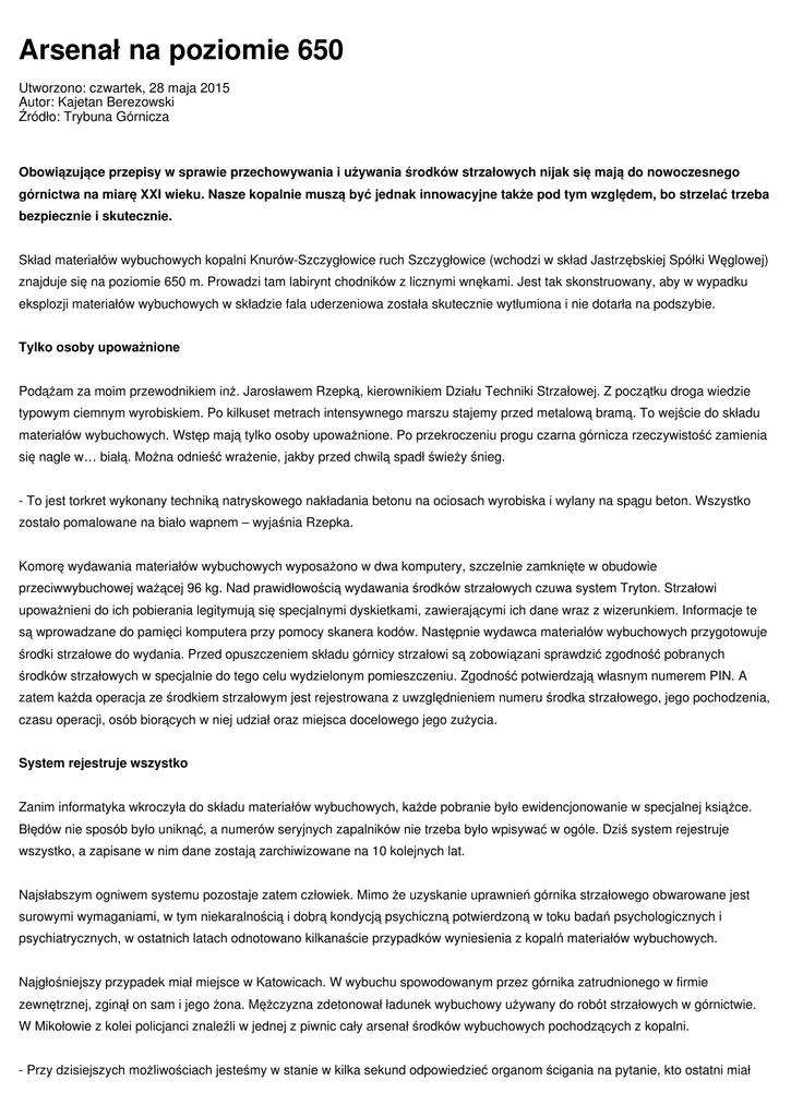 Arsenał na poziomie 650 Utworzono: czwartek, 28 maja 2015 Autor: Kajetan Berezowski Źródło: Trybuna Górnicza Obowiązujące przepisy w sprawie przechowywania i używania środków strzałowych nijak się mają do nowoczesnego górnictwa na miarę XXI wieku. Nasze kopalnie muszą być jednak innowacyjne także pod tym względem, bo strzelać trzeba bezpiecznie i skutecznie. Skład materiałów wybuchowych kopalni Knurów-Szczygłowice ruch Szczygłowice (wchodzi w skład Jastrzębskiej Spółki Węglowej) znajduje się na poziomie 650 m. Prowadzi tam labirynt chodników z licznymi wnękami. Jest tak skonstruowany, aby w wypadku eksplozji materiałów wybuchowych w składzie fala uderzeniowa została skutecznie wytłumiona i nie dotarła na podszybie. Tylko osoby upoważnione Podążam za moim przewodnikiem inż. Jarosławem Rzepką, kierownikiem Działu Techniki Strzałowej. Z początku droga wiedzie typowym ciemnym wyrobiskiem. Po kilkuset metrach intensywnego marszu stajemy przed metalową bramą. To wejście do składu materiałów wybuchowych. Wstęp mają tylko osoby upoważnione. Po przekroczeniu progu czarna górnicza rzeczywistość zamienia się nagle w… białą. Można odnieść wrażenie, jakby przed chwilą spadł świeży śnieg. - To jest torkret wykonany techniką natryskowego nakładania betonu na ociosach wyrobiska i wylany na spągu beton. Wszystko zostało pomalowane na biało wapnem – wyjaśnia Rzepka. Komorę wydawania materiałów wybuchowych wyposażono w dwa komputery, szczelnie zamknięte w obudowie przeciwwybuchowej ważącej 96 kg. Nad prawidłowością wydawania środków strzałowych czuwa system Tryton. Strzałowi upoważnieni do ich pobierania legitymują się specjalnymi dyskietkami, zawierającymi ich dane wraz z wizerunkiem. Informacje te są wprowadzane do pamięci komputera przy pomocy skanera kodów. Następnie wydawca materiałów wybuchowych przygotowuje środki strzałowe do wydania. Przed opuszczeniem składu górnicy strzałowi są zobowiązani sprawdzić zgodność pobranych środków strzałowych w specjalnie do tego celu wydzielonym pomieszczeniu. Zgodność potwierdzają własnym numerem PIN. A zatem każda operacja ze środkiem strzałowym jest rejestrowana z uwzględnieniem numeru środka strzałowego, jego pochodzenia, czasu operacji, osób biorących w niej udział oraz miejsca docelowego jego zużycia. System rejestruje wszystko Zanim informatyka wkroczyła do składu materiałów wybuchowych, każde pobranie było ewidencjonowanie w specjalnej książce. Błędów nie sposób było uniknąć, a numerów seryjnych zapalników nie trzeba było wpisywać w ogóle. Dziś system rejestruje wszystko, a zapisane w nim dane zostają zarchiwizowane na 10 kolejnych lat. Najsłabszym ogniwem systemu pozostaje zatem człowiek. Mimo że uzyskanie uprawnień górnika strzałowego obwarowane jest surowymi wymaganiami, w tym niekaralnością i dobrą kondycją psychiczną potwierdzoną w toku badań psychologicznych i psychiatrycznych, w ostatnich latach odnotowano kilkanaście przypadków wyniesienia z kopalń materiałów wybuchowych. Najgłośniejszy przypadek miał miejsce w Katowicach. W wybuchu spowodowanym przez górnika zatrudnionego w firmie zewnętrznej, zginął on sam i jego żona. Mężczyzna zdetonował ładunek wybuchowy używany do robót strzałowych w górnictwie. W Mikołowie z kolei policjanci znaleźli w jednej z piwnic cały arsenał środków wybuchowych pochodzących z kopalni. - Przy dzisiejszych możliwościach jesteśmy w stanie w kilka sekund odpowiedzieć organom ścigania na pytanie, kto ostatni miał kontakt ze znalezionym środkiem wybuchowym o konkretnym numerze ewidencyjnym – zwraca uwagę inż. Jarosław Rzepka. Urzędnicy znów zaspali Zdaniem wielu ekspertów do przeprowadzenia serii zamachów terrorystycznych w Hiszpanii w 2004 r., w których zginęło 191 osób, użyto m.in. materiałów wybuchowych stosowanych w górnictwie. W efekcie Unia Europejska rozpoczęła prace nad przepisami, które obligują przedsiębiorców górniczych do większej kontroli nad środkami wybuchowymi. Dwukrotnie - w latach 2008 i 2012, uchwalono dyrektywy Komisji Europejskiej dotyczące ewidencji materiałów wybuchowych. Przepisy w nich zawarte obowiązują od 5 kwietnia br. To dobre i przejrzyste rozwiązania. Szkoda tylko, że rodzime Prawo górnicze i geologiczne, które weszło w życie 1 stycznia 2012 r., nie doczekało się do dziś dnia przepisów wykonawczych. Obowiązują zatem stare z 2002 i 2003 r., które nijak się mają do obecnej rzeczywistości. Aby system informatyczny mógł rozpocząć pracę w śląskich kopalniach, nadzór górniczy musiał wydać zgodę na kilkanaście odstępstw od obowiązującego prawa, które na domiar złego wymienia rodzaje materiałów wybuchowych dawno już wyparte przez nowe, skuteczniejsze i bezpieczniejsze. Zorganizowanie nowoczesnych składów materiałów wybuchowych m.in. w Jastrzębskiej Spółce Węglowej, to kolejny efekt determinacji kierownictw zakładów górniczych i pracowników działów strzelniczych, dla których innowacyjność to nie tylko czcze słowo. A urzędniczej opieszałości nie da się w tym przypadku niczym usprawiedliwić.