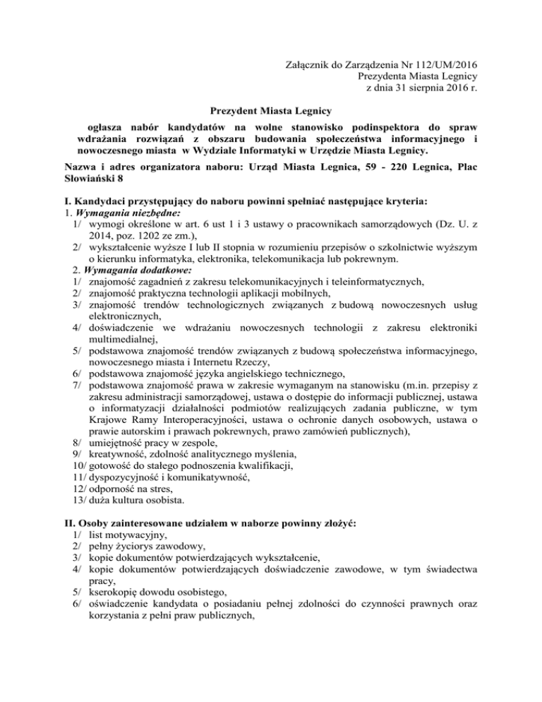 Załącznik do Zarządzenia Nr 112/UM/2016 Prezydenta Miasta Legnicy z dnia 31 sierpnia 2016 r. Prezydent Miasta Legnicy ogłasza nabór kandydatów na wolne stanowisko podinspektora do spraw wdrażania rozwiązań z obszaru budowania społeczeństwa informacyjnego i nowoczesnego miasta w Wydziale Informatyki w Urzędzie Miasta Legnicy. Nazwa i adres organizatora naboru: Urząd Miasta Legnica, 59 - 220 Legnica, Plac Słowiański 8 I. Kandydaci przystępujący do naboru powinni spełniać następujące kryteria: 1. Wymagania niezbędne: 1/ wymogi określone w art. 6 ust 1 i 3 ustawy o pracownikach samorządowych (Dz. U. z 2014, poz. 1202 ze zm.), 2/ wykształcenie wyższe I lub II stopnia w rozumieniu przepisów o szkolnictwie wyższym o kierunku informatyka, elektronika, telekomunikacja lub pokrewnym. 2. Wymagania dodatkowe: 1/ znajomość zagadnień z zakresu telekomunikacyjnych i teleinformatycznych, 2/ znajomość praktyczna technologii aplikacji mobilnych, 3/ znajomość trendów technologicznych związanych z budową nowoczesnych usług elektronicznych, 4/ doświadczenie we wdrażaniu nowoczesnych technologii z zakresu elektroniki multimedialnej, 5/ podstawowa znajomość trendów związanych z budową społeczeństwa informacyjnego, nowoczesnego miasta i Internetu Rzeczy, 6/ podstawowa znajomość języka angielskiego technicznego, 7/ podstawowa znajomość prawa w zakresie wymaganym na stanowisku (m.in. przepisy z zakresu administracji samorządowej, ustawa o dostępie do informacji publicznej, ustawa o informatyzacji działalności podmiotów realizujących zadania publiczne, w tym Krajowe Ramy Interoperacyjności, ustawa o ochronie danych osobowych, ustawa o prawie autorskim i prawach pokrewnych, prawo zamówień publicznych), 8/ umiejętność pracy w zespole, 9/ kreatywność, zdolność analitycznego myślenia, 10/ gotowość do stałego podnoszenia kwalifikacji, 11/ dyspozycyjność i komunikatywność, 12/ odporność na stres, 13/ duża kultura osobista. II. Osoby zainteresowane udziałem w naborze powinny złożyć: 1/ list motywacyjny, 2/ pełny życiorys zawodowy, 3/ kopie dokumentów potwierdzających wykształcenie, 4/ kopie dokumentów potwierdzających doświadczenie zawodowe, w tym świadectwa pracy, 5/ kserokopię dowodu osobistego, 6/ oświadczenie kandydata o posiadaniu pełnej zdolności do czynności prawnych oraz korzystania z pełni praw publicznych, 7/ oświadczenie kandydata o wyrażeniu zgody na przetwarzanie danych osobowych do celów rekrutacji, 8/ oświadczenie kandydata o niekaralności za przestępstwa popełnione umyślnie ścigane z oskarżenia publicznego lub za umyślne przestępstwa skarbowe (w przypadku zatrudnienia, kandydat zobowiązany zostanie do dostarczenia zaświadczenia Krajowego Rejestru Karnego), 9/ kandydaci, którzy zamierzają skorzystać z uprawnienia, o którym mowa w art. 13a ust. 2 ustawy o pracownikach samorządowych – zobowiązani są do złożenia wraz z dokumentami kopii dokumentu potwierdzającego niepełnosprawność. III. Zakres zadań na stanowisku podinspektora do spraw wdrażania rozwiązań z obszaru budowania społeczeństwa informacyjnego i nowoczesnego miasta w Wydziale Informatyki w Urzędzie Miasta Legnicy: 1/ wdrażanie i koordynowanie wprowadzanych rozwiązań z obszaru budowania społeczeństwa informacyjnego i nowoczesnego miasta; 2/ koordynowanie działań jednostek miejskich w obszarze planowania i wdrażania nowoczesnych projektów z obszaru IT i nowoczesnego miasta; 3/ wdrażanie nowoczesnych technologii z zakresu elektroniki multimedialnej na potrzeby jednostek i miasta; 4/ planowanie i koordynowanie wdrożeń z zakresu integracji i upowszechnienia usług telekomunikacyjnych opartych o sieci konwergentne (w tym rozwiązania VoIP, CallCenter itp.); 5/ uczestniczenie w projektach i wdrożeniach z obszaru infrastruktury teletechnicznej i nowoczesnych technologii na poziomie miejskim; 6/ analiza trendów i kierunków rozwoju technologii informacyjnych oraz planowanie ich wykorzystania na potrzeby miasta. IV. Warunki pracy na stanowisku podinspektora do spraw wdrażania rozwiązań z obszaru budowania społeczeństwa informacyjnego i nowoczesnego miasta w Wydziale Informatyki w Urzędzie Miasta Legnicy: 1/ stanowisko pracy znajduje się na II piętrze budynku Urzędu przy pl. Słowiańskim 8, 2/ budynek wyposażony jest w windę, 3/ praca jednozmianowa, 4/ oświetlenie naturalne i sztuczne, 5/ praca wykonywana jest w warunkach biurowych z wykorzystaniem komputera i innych urządzeń biurowych. Wskaźnik zatrudnienia osób niepełnosprawnych w Urzędzie Miasta Legnicy, w rozumieniu przepisów o rehabilitacji zawodowej i społecznej oraz zatrudnianiu osób niepełnosprawnych za lipiec 2016 roku wynosi powyżej 6%. Oferty należy składać w zamkniętych kopertach z dopiskiem "Nabór na stanowisko podinspektora do spraw wdrażania rozwiązań z obszaru budowania społeczeństwa informacyjnego i nowoczesnego miasta w Wydziale Informatyki” do dnia 16 września 2016r. w kancelarii Urzędu Miasta Legnicy przy pl. Słowiańskim 8 w Legnicy. Oferty złożone po terminie nie będą rozpatrywane. Oferty kandydatów po trzech miesiącach od dnia ogłoszenia wyniku naboru zostaną zniszczone.