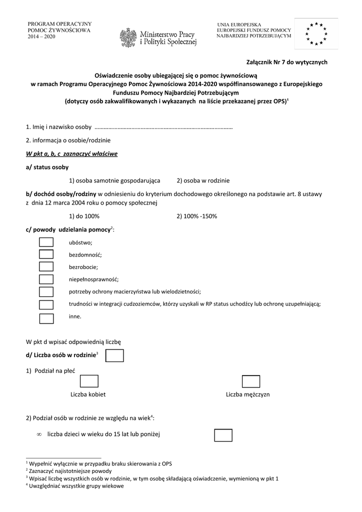PROGRAM OPERACYJNY POMOC ŻYWNOŚCIOWA 2014 – 2020 UNIA EUROPEJSKA EUROPEJSKI FUNDUSZ POMOCY NAJBARDZIEJ POTRZEBUJĄCYM Załącznik Nr 7 do wytycznych Oświadczenie osoby ubiegającej się o pomoc żywnościową w ramach Programu Operacyjnego Pomoc Żywnościowa 2014-2020 współfinansowanego z Europejskiego Funduszu Pomocy Najbardziej Potrzebującym (dotyczy osób zakwalifikowanych i wykazanych na liście przekazanej przez OPS)1 1. Imię i nazwisko osoby ……………………………………………………………………………… 2. informacja o osobie/rodzinie W pkt a, b, c zaznaczyć właściwe a/ status osoby 1) osoba samotnie gospodarująca 2) osoba w rodzinie b/ dochód osoby/rodziny w odniesieniu do kryterium dochodowego określonego na podstawie art. 8 ustawy z dnia 12 marca 2004 roku o pomocy społecznej 1) do 100% 2) 100% -150% c/ powody udzielania pomocy2: ubóstwo; bezdomność; bezrobocie; niepełnosprawność; potrzeby ochrony macierzyństwa lub wielodzietności; trudności w integracji cudzoziemców, którzy uzyskali w RP status uchodźcy lub ochronę uzupełniającą; inne. W pkt d wpisać odpowiednią liczbę d/ Liczba osób w rodzinie3 1) Podział na płeć Liczba kobiet Liczba mężczyzn 2) Podział osób w rodzinie ze względu na wiek 4: • 1 liczba dzieci w wieku do 15 lat lub poniżej Wypełnić wyłącznie w przypadku braku skierowania z OPS Zaznaczyć najistotniejsze powody 3 Wpisać liczbę wszystkich osób w rodzinie, w tym osobę składającą oświadczenie, wymienioną w pkt 1 4 Uwzględniać wszystkie grupy wiekowe 2 PROGRAM OPERACYJNY POMOC ŻYWNOŚCIOWA 2014 – 2020 • liczba osób w wieku 65 lat lub powyżej • liczba pozostałych osób UNIA EUROPEJSKA EUROPEJSKI FUNDUSZ POMOCY NAJBARDZIEJ POTRZEBUJĄCYM 3) Podział osób w rodzinie ze względu na grupy docelowe: • liczba bezdomnych • liczba bezrobotnych • liczba migrantów, osób obcego pochodzenia, mniejszości narodowych (w tym społeczności marginalizowanych) • • • liczba niepełnosprawnych liczba pozostałych osób e/ Uczestnictwo osoby/członków rodziny w działaniach finansowanych ze środków Europejskiego Funduszu Społecznego TAK NIE Należy podać rodzaj działań oraz wskazać osoby objęte działaniami realizowanymi w ramach EFS f/ termin obowiązywania oświadczenia (wpisać właściwą datę z listy OPS) ………………………………………………………… g/ Oświadczenie Oświadczam, że nie otrzymuję pomocy żywnościowej w ramach PO PŻ z innej organizacji. Wyrażam zgodę na przetwarzanie moich danych osobowych dla potrzeb realizacji Programu Operacyjnego Pomoc Żywnościowa 2014-2020 zgodnie z obowiązującymi przepisami prawa (Ustawa z dnia 29.08.1997 roku o Ochronie Danych Osobowych; tekst jednolity: Dz. U. z 2002 r. Nr 101, poz. 926 ze zm.) oraz na przekazywanie danych osobowych do innych podmiotów uczestniczących w realizacji Programu Operacyjnego Pomoc Żywnościowa 2014-2020. Mam prawo wglądu i poprawiania swoich danych. Data i podpis osoby składającej oświadczenie …………………………………………………………
