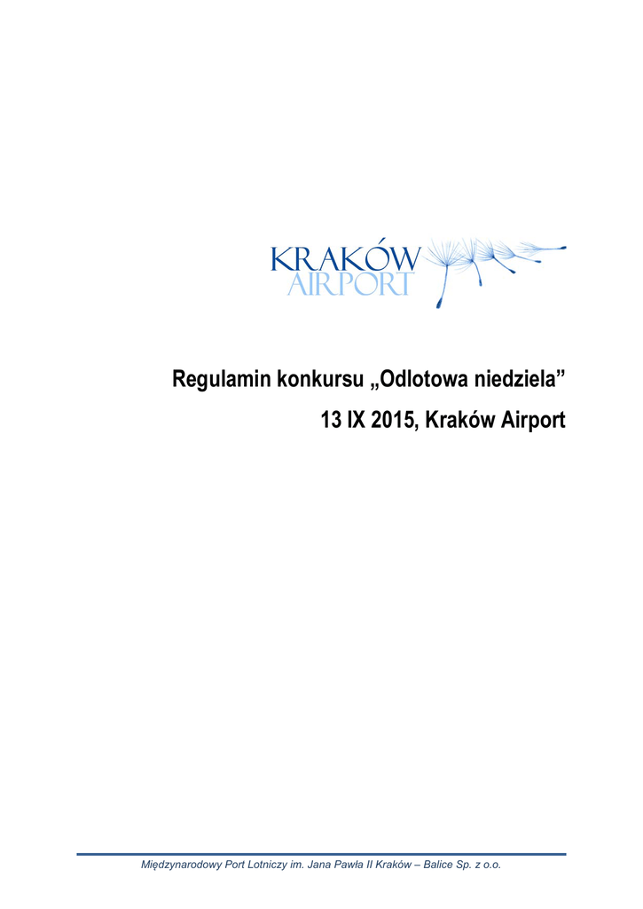 Regulamin konkursu „Odlotowa niedziela” 13 IX 2015, Kraków Airport Międzynarodowy Port Lotniczy im. Jana Pawła II Kraków – Balice Sp. z o.o. §1 Przepisy ogólne 1. Organizatorem konkursu pod nazwą „Odlotowa niedziela” (zwanym dalej: „Konkurs”) jest Międzynarodowy Port Lotniczy im. Jana Pawła II Kraków-Balice Sp. z o. o., z siedzibą w Balicach, 32-083 Balice, ul. kpt. M. Medweckiego 1, wpisaną do rejestru przedsiębiorców pod numerem KRS: 0000008522 (akta rejestrowe w Sądzie Rejonowym dla Krakowa - Śródmieścia w Krakowie Wydział XI Gospodarczy KRS), NIP 676-13-36-952, zwany dalej „Kraków Airport”. 2. Konkurs jest organizowany dla osób biorących udział w akcji „Dzień otwarty nowego terminala pasażerskiego Kraków Airport”, która odbędzie się 13. września 2015. 3. Uczestnictwo w konkursie jest dobrowolne dla każdej z powyższych osób. 4. Osoby opisane w §1.pkt.2., a biorące udział w Konkursie będą dalej nazywane „Uczestnikami”. 5. Konkurs jest organizowany na zasadach określonych w niniejszym Regulaminie oraz zgodnie z powszechnie obowiązującymi przepisami prawa. 6. Treść niniejszego Regulaminu dostępna jest w siedzibie Organizatora oraz na stronie internetowej krakowairport.pl. 7. Celem Konkursu jest promocja Kraków Airport. §2 Zasady udziału w Konkursie i zadania Uczestnika 1. Aby móc przystąpić do konkursu, należy wziąć udział w akcji „Dzień otwarty nowego terminala pasażerskiego Kraków Airport”, która odbędzie się 13. września 2015. 2. Zasady wzięcia udziału w opisanej wyżej akcji określają odrębne przepisy Organizatora, w tym informacje zawarte w dedykowanym systemie rejestracji. 3. Zadaniem Uczestnika Konkursu jest: a. pobranie kuponu konkursowego (wyznaczeni pracownicy Kraków Airport będą wręczać kupony przy wejściu do terminala pasażerskiego oraz w punkcie Visitor’s Center - parter terminala pasażerskiego) b. poprawne wypełnienie kuponu konkursowego c. wrzucenie wypełnionego kuponu do urny konkursowej (punkt Visitor’s Center) 4. W ramach poprawnego wypełnienia kuponu konkursowego Uczestnik czytelnym pismem wpisuje swoje imię i nazwisko, adres e-mail oraz numer telefonu, a następnie zakreśla właściwą odpowiedź „TAK” lub „NIE” na podane na kuponie pytanie konkursowe. Uczestnik potwierdza również zapoznanie się z Regulaminem Konkursu, a także potwierdza poprawność wszystkich w/w informacji własnoręcznym czytelnym podpisem (imię i nazwisko) wraz z podaniem bieżącej daty. 5. Kupony niewypełnione w pełnym zakresie określonym powyżej lub wypełnione pismem nieczytelnym nie będą brane pod uwagę, tj. zostaną usunięte z konkursu. 6. Każdy Uczestnik ma prawo wziąć udział w Konkursie (tj. wypełnić kupon konkursowy) tylko raz. Wypełnienie więcej niż jednego kuponu konkursowego przez tego samego Uczestnika spowoduje usunięcie Uczestnika z konkursu. Regulamin Konkursu „Odlotowa niedziela” 13 IX 2015 w Kraków Airport S t r o n a |2 7. Działania Organizatora w zakresie określonym w §2.pkt.5. i pkt.6. nie wymagają dla swej ważności przesłania do Uczestnika jakiegokolwiek oświadczenia. §3 Wyłonienie zwycięzców 1. Wypełnione zgodnie z §2 pkt.4. kupony konkursowe Kraków Airport zgromadzi w wyznaczonym w tym celu miejscu, a następnie wyznaczeni przedstawiciele Kraków Airport wyłonią spośród wszystkich kuponów 14 zwycięzców, kolejno od miejsca 1. do miejsca 14. 2. Każdorazowo po wyłonieniu zwycięzcy przedstawiciel Kraków Airport odczyta z kuponu imię i nazwisko zwycięzcy. 3. Zwycięzca odbierając nagrodę zobowiązany jest do udokumentowania swojej tożsamości oraz wypełnienia stosownych dokumentów konkursowych przedłożonych przez przedstawicieli Kraków Airport. 4. W przypadku niestawienia się wyłonionego zwycięzcy po odczytaniu jego imienia i nazwiska uznaje się danego zwycięzcę za nieobecnego. W takim przypadku Organizator poinformuje nieobecnego zwycięzcę o wygranej drogą telefoniczną lub za pośrednictwem poczty elektronicznej. Zwycięzca będzie wówczas poproszony o niezwłoczne wypełnienie stosownych dokumentów konkursowych i przesłanie ich do Kraków Airport za pośrednictwem poczty elektronicznej lub pocztą tradycyjną. §4 Terminarz 1. Konkurs odbędzie się w dniu 13 września 2015, o godz. 15:45 w nowej części terminala pasażerskiego Kraków Airport. Organizator zastrzega sobie możliwość zmiany godziny przeprowadzenia konkursu bez uprzedniego informowania Uczestników. 2. Wyniki Konkursu będą ogłaszane w dniu 13 września 2015, w miejscu realizacji konkursu, bezpośrednio po zakończeniu wyłaniania zwycięzców. §5 Nagrody 1. Organizator przewidział łącznie 14 (czternaście) nagród w Konkursie: a. za miejsce 1. i 2.: voucher na bilet lotniczy linii Ryanair. Bilet w dwie strony, dla Posiadacza wraz z osobą towarzyszącą, do wyboru jeden z trzech kierunków podanych na voucherze. b. za miejsce 3. i 4.: walizka lotnicza (bagaż podręczny). c. za miejsca od 5 do 14: kosmetyki od firmy Aelia. 2. Uzupełnieniem niniejszego Regulaminu na zasadach równorzędnych są: a. zapisy stanowiące zasady korzystania z vouchera na bilet linii lotniczej Ryanair podane na voucherze, opisanym w §5 pkt.1.a. 3. W przypadku każdej z nagród wymienionych w §5 pkt.1.a-c., nagrodę stanowi również nagroda pieniężna w wysokości należnego podatku dochodowego, który zostanie uiszczony przez Kraków Airport. 4. Żadna z nagród wymienionych w §5 pkt.1.a-c. nie podlega wymianie na gotówkę. Regulamin Konkursu „Odlotowa niedziela” 13 IX 2015 w Kraków Airport S t r o n a |3 §6 Zakres odpowiedzialności Organizatora 1. Organizator Konkursu nie ponosi żadnej odpowiedzialności za jakiekolwiek następstwa podania przez Uczestnika nieprawdziwych danych osobowych. Uczestnik ponosi pełną odpowiedzialność za podanie informacji niezgodnych ze stanem faktycznym. 2. Organizator Konkursu nie