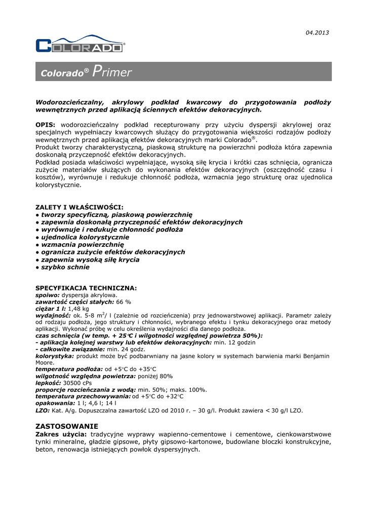 04.2013 Colorado® Primer Wodorozcieńczalny, akrylowy podkład kwarcowy do przygotowania wewnętrznych przed aplikacją ściennych efektów dekoracyjnych. podłoży OPIS: wodorozcieńczalny podkład recepturowany przy użyciu dyspersji akrylowej oraz specjalnych wypełniaczy kwarcowych służący do przygotowania większości rodzajów podłoży wewnętrznych przed aplikacją efektów dekoracyjnych marki Colorado®. Produkt tworzy charakterystyczną, piaskową strukturę na powierzchni podłoża która zapewnia doskonałą przyczepność efektów dekoracyjnych. Podkład posiada właściwości wypełniające, wysoką siłę krycia i krótki czas schnięcia, ogranicza zużycie materiałów służących do wykonania efektów dekoracyjnych (oszczędność czasu i kosztów), wyrównuje i redukuje chłonność podłoża, wzmacnia jego strukturę oraz ujednolica kolorystycznie. ZALETY I WŁAŚCIWOŚCI: ● tworzy specyficzną, piaskową powierzchnię ● zapewnia doskonałą przyczepność efektów dekoracyjnych ● wyrównuje i redukuje chłonność podłoża ● ujednolica kolorystycznie ● wzmacnia powierzchnię ● ogranicza zużycie efektów dekoracyjnych ● zapewnia wysoką siłę krycia ● szybko schnie SPECYFIKACJA TECHNICZNA: spoiwo: dyspersja akrylowa. zawartość części stałych: 66 % ciężar 1 l: 1,48 kg wydajność: ok. 5-8 m2/ l (zależnie od rozcieńczenia) przy jednowarstwowej aplikacji. Parametr zależy od rodzaju podłoża, jego struktury i chłonności, wybranego efektu i tynku dekoracyjnego oraz metody aplikacji. Wykonać próbę w celu określenia wydajności dla danego podłoża. czas schnięcia (w temp. + 25C i wilgotności względnej powietrza 50%): - aplikacja kolejnej warstwy lub efektów dekoracyjnych: min. 12 godzin - całkowite związanie: min. 24 godz. kolorystyka: produkt może być podbarwniany na jasne kolory w systemach barwienia marki Benjamin Moore. temperatura podłoża: od +5°C do +35°C wilgotność względna powietrza: poniżej 80% lepkość: 30500 cPs proporcje rozcieńczania z wodą: min. 50%; maks. 100%. temperatura przechowywania: od +5°C do +32°C opakowania: 1 l; 4,6 l; 14 l LZO: Kat. A/g. Dopuszczalna zawartość LZO od 2010 r. – 30 g/l. Produkt zawiera < 30 g/l LZO. ZASTOSOWANIE Zakres użycia: tradycyjne wyprawy wapienno-cementowe i cementowe, cienkowarstwowe tynki mineralne, gładzie gipsowe, płyty gipsowo-kartonowe, budowlane bloczki konstrukcyjne, beton, renowacja istniejących powłok dyspersyjnych. Przygotowanie podłoża: ● powierzchnie niemalowane: Powierzchnie nowych wypraw cementowo-wapiennych, cementowych i podłoży betonowych sezonować przez okres min. 4 tygodni. Gładzie gipsowe pozostawić do całkowitego wyschnięcia i związania. Należy usunąć zalęgający brud, kurz, tłuste plamy i luźne fragmenty podłoża. Nierówności i spękania podłoża wyrównać materiałem zbliżonym składem do pierwotnie użytego. Występujące na powierzchni mikroorganizmy (pleśń i grzyby) należy usunąć stosując odpowiednie preparaty. Podłoże zagruntować podkładem kwarcowym Colorado® PRIMER. W przypadku podłoży gipsowych oraz osłabionych wypraw tynkarskich przed aplikacją podkładu Colorado® PRIMER należy zastosować preparat gruntujący SUPER SPEC HP™ CLEAR ACRYLIC SEALER P27 marki Benjamin Moore. Problematyczne podłoża z uciążliwymi plamami lub zaciekami zagruntować izolującą farbą gruntującą FRESH START® HIGH-HIDING ALL PURPOSE PRIMER 046 marki Benjamin Moore. Uwaga: w przypadku niemalowanych podłoży czynność gruntowania stanowi absolutny wymóg technologiczny. ● powierzchnie malowane (istniejące powłoki malarskie): Usunąć zalęgający brud, kurz, tłuste plamy, wszystkie istniejące powłoki malarskie oraz luźne fragmenty podłoża. Powierzchnie błyszczące zmatowić. Nierówności i spękania podłoża wyrównać materiałem zbliżonym składem do pierwotnie użytego. Występujące na powierzchni mikroorganizmy (pleśń i grzyby) należy usunąć stosując odpowiednie preparaty. Uwaga: w przypadku renowacji starych powłok malarskich wykonać gruntowanie próbne. Uzyskanie pozytywnego wyniku decyduje o ostatecznym zastosowaniu produktu. Czynność gruntowania może zostać pominięta jedynie pod warunkiem doskonałego zachowania istniejącej powłoki malarskiej. Odsłonięte fragmenty podłoża (również te po reperacjach, np. szpachlowaniu) zagruntować preparatem gruntującym SUPER SPEC HP™ CLEAR ACRYLIC SEALER P27 marki Benjamin Moore. Wspomniany preparat zastosować także w przypadku osłabionej warstwy malarskiej w celu jej przesączenia i wzmocnienia. APLIKACJA Podłoże musi być nośne, suche, czyste i odpylone. Produkt przeznaczony do stosowania w postaci rozcieńczonej czystą wodą w ilości 50-100% (objętościowo). Przed użyciem dokładnie wymieszać. Podkład aplikować w 1-2 warstwach pędzlem lub wałkiem malarskim, nie wcześniej niż po 12 godzinach od gruntowania SUPER SPEC HP™ CLEAR ACRYLIC SEALER P27 oraz po 24 godzinach w przypadku zastosowania FRESH START® HIGHHIDING ALL PURPOSE PRIMER 046 marki Benjamin Moore. Pracować metodą „mokre w mokre” unikając powstania śladów od narzędzia malarskiego. Kolejną warstwę lub efekty i tynki dekoracyjne marki Colorado® aplikować po min. 12 godzinach od naniesienia Colorado® PRIMER. Przerwy technologiczne zaplanować na krawędziach ścian i elementów oraz w narożnikach pomieszczeń. Nie nanosić na powłoki farb wapiennych i klejowych (należy je bezwarunkowo usunąć z podłoża). Zaleca się użycie narzędzi malarskich marki BENJAMIN MOORE lub RICHARD. Warunki klimatyczne w trakcie i po aplikacji: Prace prowadzić przy temperaturze powietrza i podłoża nie niższej niż +5 0C. Optymalne warunki atmosferyczne: + 200C i wilgotność względna powietrza 50%. Nie zaleca się gruntowania przy wilgotności względnej powietrza powyżej 80%. Czyszczenie narzędzi: Narzędzia należy czyścić wodą z myd