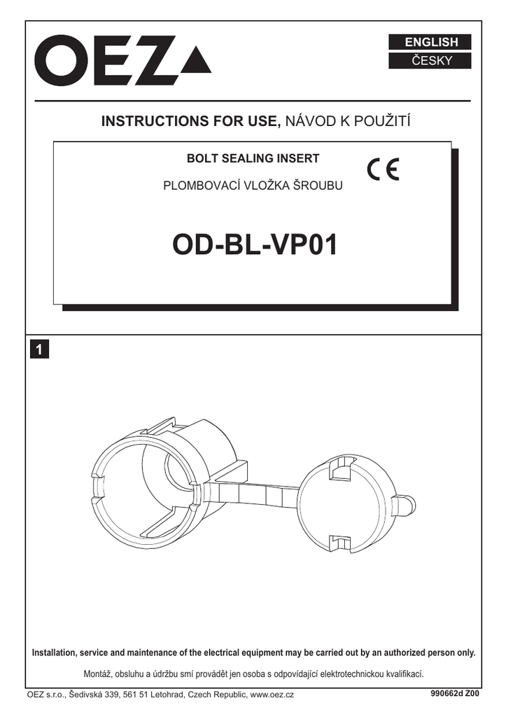 ENGLISH ČESKY INSTRUCTIONS FOR USE, NÁVOD K POUŽITÍ BOLT SEALING INSERT PLOMBOVACÍ VLOŽKA ŠROUBU OD-BL-VP01 1 1 Installation, service and maintenance of the electrical equipment may be carried out by an authorized person only. Montáž, obsluhu a údržbu smí provádět jen osoba s odpovídající elektrotechnickou kvalifikací. OEZ s.r.o., Šedivská 339, 561 51 Letohrad, Czech Republic, www.oez.cz 990662d Z00 2 SEALING PLOMBOVÁNÍ 2Nm 2Nm 3 Only materials which have low adverse environmental impact and which do not contain dangerous substances as specified in ROHS directive have been used in the product. Ve výrobku jsou použity materiály s nízkým negativním dopadem na životní prostředí, které neobsahují zakázané nebezpečné látky dle ROHS. -2- 990662d Z00 ESPAÑOL SLOVENSKY ПО-РУССКИ PO POLSKU DEUTSCH OD-BL-VP01 -1- 990662d Z00 Návod k použitiu SLOVENSKY Plombovacia vložka - OD-BL-VP01 Montáž, obsluhu a údržbu môže vykonávať iba osoba s odpovedajúcou elektrotechnickou 1 2 3 kvalifikáciou. Plombovanie Vo výrobku sú použite materiály s nízkym negatívnym dopadom na životné prostredie, ktoré neobsahujú zakázané látky podľa ROHS. Инструкция по эксплуатации ПО-РУССКИ Пломбирующий вкладыш - OD-BL-VP01 Установку, обслуживание и уход может проводить только лицо с соответствующей 1 2 3 электротехнической квалификацией. Пломбирование В изделии применены материалы с малым негативным влиянием на окружающую среду, которые не содержат запрещенные опасные вещества, указанные в директиве ROHS. Instrukcja obsługi PO POLSKU Wkładka do plombowania - OD-BL-VP01 Montaż, obsługę i konserwację wykonywać może wyłącznie odpowiednio wykwalifikowana 1 2 3 osoby z branży elektrotechnicznej. Plombowanie W wyrobie zastosowane zostały materiały z niskim negatywnym oddziaływaniem na środowisko naturalne, które nie zawierają zakazanych niebezpiecznych substancji zgodnie z ROHS. Gebrauchsanweisung DEUTSCH Plombierungseinlage - OD-BL-VP01 Die Montage, die Bedienung und Instandhaltung kann nur der Arbeiter mit der 1 2 3 entsprechenden elektrotechnischen Qualifikation verrichten. Plombieren Für das Erzeugnis werden Stoffe mit niedrigen negativen Umweltauswirkungen angewandt, die keine verbotenen gefährlichen Stoffe nach ROHS enthalten. Instrucciones de uso ESPAÑOL Cartucho sellador - OD-BL-VP01 El montaje, servicio y mantenimiento puede realizar únicamente la persona con la 1 2 3 cualificación electrotécnica correspondiente. Selladura En el producto están usados los materiales que tienen incidencia negativa baja al medio ambiente, que no incluyen las materias peligrosas prohibidas según ROHS. -2- 990662d Z00