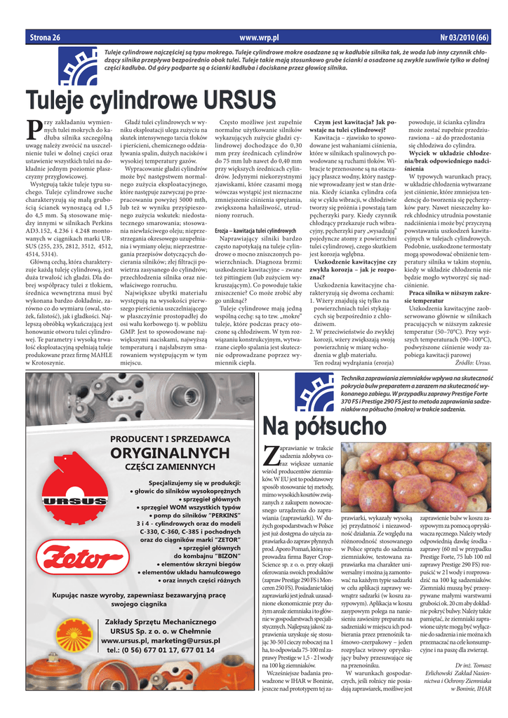 Strona 26 www.wrp.pl Nr 03/2010 (66) Tuleje cylindrowe najczęściej są typu mokrego. Tuleje cylindrowe mokre osadzane są w kadłubie silnika tak, że woda lub inny czynnik chłodzący silnika przepływa bezpośrednio obok tulei. Tuleje takie mają stosunkowo grube ścianki a osadzone są zwykle suwliwie tylko w dolnej części kadłuba. Od góry podparte są o ścianki kadłuba i dociskane przez głowicę silnika. Tuleje cylindrowe URSUS P rzy zakładaniu wymiennych tulei mokrych do kadłuba silnika szczególną uwagę należy zwrócić na uszczelnienie tulei w dolnej części oraz ustawienie wszystkich tulei na dokładnie jednym poziomie płaszczyzny przygłowicowej. Występują także tuleje typu suchego. Tuleje cylindrowe suche charakteryzują się małą grubością ścianek wynoszącą od 1,5 do 4,5 mm. Są stosowane między innymi w silnikach Perkins AD3.152, 4.236 i 4.248 montowanych w ciągnikach marki URSUS (255, 235, 2812, 3512, 4512, 4514, 5314). Główną cechą, która charakteryzuje każdą tuleję cylindrową, jest duża trwałość ich gładzi. Dla dobrej współpracy tulei z tłokiem, średnica wewnętrzna musi być wykonana bardzo dokładnie, zarówno co do wymiaru (owal, stożek, falistość), jak i gładkości. Najlepszą obróbką wykańczającą jest honowanie otworu tulei cylindrowej. Te parametry i wysoką trwałość eksploatacyjną spełniają tuleje produkowane przez firmę MAHLE w Krotoszynie. Gładź tulei cylindrowych w wyniku eksploatacji ulega zużyciu na skutek intensywnego tarcia tłoków i pierścieni, chemicznego oddziaływania spalin, dużych nacisków i wysokiej temperatury gazów. Wypracowanie gładzi cylindrów może być następstwem normalnego zużycia eksploatacyjnego, które następuje zazwyczaj po przepracowaniu powyżej 5000 mth, lub też w wyniku przyśpieszonego zużycia wskutek: niedostatecznego smarowania; stosowania niewłaściwego oleju; nieprzestrzegania okresowego uzupełniania i wymiany oleju; nieprzestrzegania przepisów dotyczących docierania silników; złej filtracji powietrza zasysanego do cylindrów; przechłodzenia silnika oraz niewłaściwego rozruchu. Największe ubytki materiału występują na wysokości pierwszego pierścienia uszczelniającego w płaszczyźnie prostopadłej do osi wału korbowego tj. w pobliżu GMP. Jest to spowodowane największymi naciskami, najwyższą temperaturą i najsłabszym smarowaniem występującym w tym miejscu. Często możliwe jest zupełnie normalne użytkowanie silników wykazujących zużycie gładzi cylindrowej dochodzące do 0,30 mm przy średnicach cylindrów do 75 mm lub nawet do 0,40 mm przy większych średnicach cylindrów. Jedynymi niekorzystnymi zjawiskami, które czasami mogą wówczas wystąpić jest nieznaczne zmniejszenie ciśnienia sprężania, zwiększona hałaśliwość, utrudniony rozruch. Erozja – kawitacja tulei cylindrowych Naprawiający silniki bardzo często napotykają na tuleje cylindrowe o mocno zniszczonych powierzchniach. Diagnoza brzmi: uszkodzenie kawitacyjne – zwane też pittingiem (lub zużyciem wykruszającym). Co powoduje takie zniszczenie? Co może zrobić aby go uniknąć? Tuleje cylindrowe mają jedną wspólną cechę: są to tzw. „mokre” tuleje, które podczas pracy otoczone są chłodziwem. W tym rozwiązaniu konstrukcyjnym, wytwarzane ciepło spalania jest skutecznie odprowadzane poprzez wymiennik ciepła. Czym jest kawitacja? Jak powstaje na tulei cylindrowej? Kawitacja – zjawisko to spowodowane jest wahaniami ciśnienia, które w silnikach spalinowych powodowane są ruchami tłoków. Wibracje te przenoszone są na otaczający płaszcz wodny, który następnie wprowadzany jest w stan drżenia. Kiedy ścianka cylindra cofa się w cyklu wibracji, w chłodziwie tworzy się próżnia i powstają tam pęcherzyki pary. Kiedy czynnik chłodzący przekazuje ruch wibracyjny, pęcherzyki pary „wysadzają” pojedyncze atomy z powierzchni tulei cylindrowej, czego skutkiem jest korozja wgłębna. Uszkodzenie kawitacyjne czy zwykła korozja – jak je rozpoznać? Uszkodzenia kawitacyjne charakteryzują się dwoma cechami: 1. Wżery znajdują się tylko na powierzchniach tulei stykających się bezpośrednio z chłodziwem. 2. W przeciwieństwie do zwykłej korozji, wżery zwiększają swoją powierzchnię w miarę wchodzenia w głąb materiału. Ten rodzaj wydrążania (erozja) powoduje, iż ścianka cylindra może zostać zupełnie przedziurawiona – aż do przedostania się chłodziwa do cylindra. Wyciek w układzie chłodzenia/brak odpowiedniego nadciśnienia W typowych warunkach pracy, w układzie chłodzenia wytwarzane jest ciśnienie, które zmniejsza tendencję do tworzenia się pęcherzyków pary. Nawet nieszczelny korek chłodnicy utrudnia powstanie nadciśnienia i może być przyczyną powstawania uszkodzeń kawitacyjnych w tulejach cylindrowych. Podobnie, uszkodzone termostaty mogą spowodować obniżenie temperatury silnika w takim stopniu, kiedy w układzie chłodzenia nie będzie mogło wytworzyć się nadciśnienie. Praca silnika w niższym zakresie temperatur Uszkodzenia kawitacyjne zaobserwowano głównie w silnikach pracujących w niższym zakresie temperatur (50–70°C). Przy wyższych temperaturach (90–100°C), podwyższone ciśnienie wody zapobiega kawitacji parowej Źródło: Ursus. Technika zaprawiania ziemniaków wpływa na skuteczność pokrycia bulw preparatem a zarazem na skuteczność wykonanego zabiegu. W przypadku zaprawy Prestige Forte 370 FS i Prestige 290 FS jest to metoda zaprawiania sadzeniaków na półsucho (mokro) w trakcie sadzenia. Na półsucho Z aprawianie w trakcie sadzenia zdobywa coraz większe uznanie wśród producentów ziemniaków. W EU jest to podstawowy sposób stosowanie tej metody, mimo wysokich kosztów związanych z zakupem nowoczesnego urządzenia do zaprawiania (zaprawiarki). W dużych gospodarstwach w Polsce jest już dostępna do użycia zaprawiarka do zapraw płynnych prod. Aporo Po