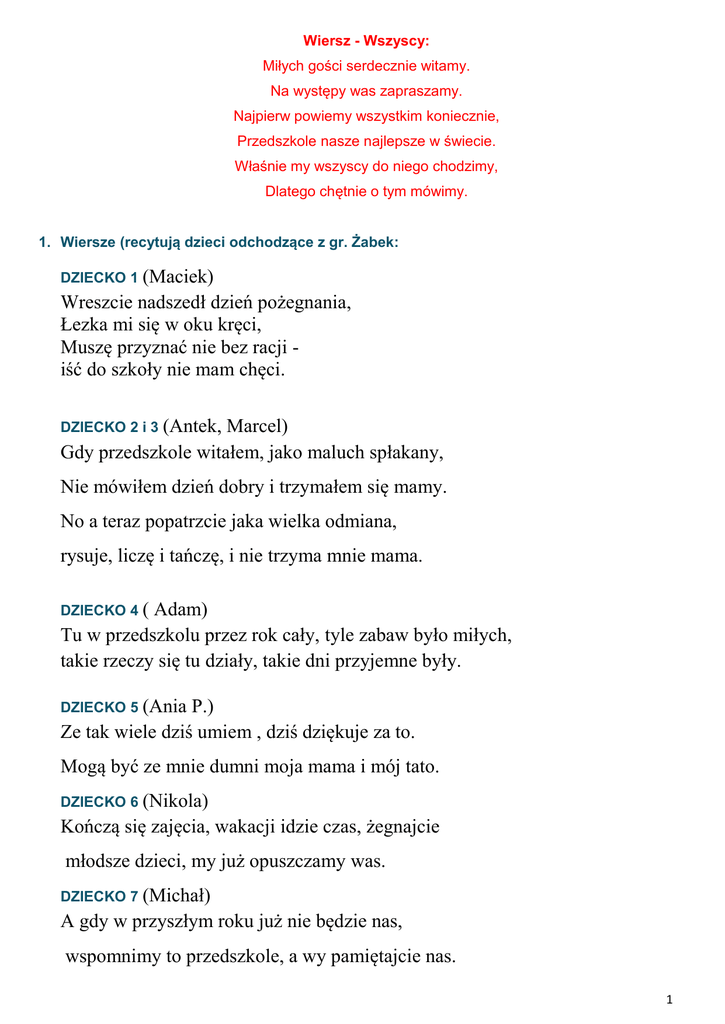 Wiersz - Wszyscy: Miłych gości serdecznie witamy. Na występy was zapraszamy. Najpierw powiemy wszystkim koniecznie, Przedszkole nasze najlepsze w świecie. Właśnie my wszyscy do niego chodzimy, Dlatego chętnie o tym mówimy. 1. Wiersze (recytują dzieci odchodzące z gr. Żabek: DZIECKO 1 (Maciek) Wreszcie nadszedł dzień pożegnania, Łezka mi się w oku kręci, Muszę przyznać nie bez racji iść do szkoły nie mam chęci. DZIECKO 2 i 3 (Antek, Marcel) Gdy przedszkole witałem, jako maluch spłakany, Nie mówiłem dzień dobry i trzymałem się mamy. No a teraz popatrzcie jaka wielka odmiana, rysuje, liczę i tańczę, i nie trzyma mnie mama. DZIECKO 4 ( Adam) Tu w przedszkolu przez rok cały, tyle zabaw było miłych, takie rzeczy się tu działy, takie dni przyjemne były. DZIECKO 5 (Ania P.) Ze tak wiele dziś umiem , dziś dziękuje za to. Mogą być ze mnie dumni moja mama i mój tato. DZIECKO 6 (Nikola) Kończą się zajęcia, wakacji idzie czas, żegnajcie młodsze dzieci, my już opuszczamy was. DZIECKO 7 (Michał) A gdy w przyszłym roku już nie będzie nas, wspomnimy to przedszkole, a wy pamiętajcie nas. 1 DZIECKO 8 (Sławek) Żegnamy się z przedszkolem, salami, zabawkami, ale z największym żalem żegnamy się z Paniami. DZIECKO 9 (Olivia) A już jutro na wakacjach, nad jeziorem lub nad morzem, będą różne tam atrakcje, ale nic to nie pomoże. DZIECKO 10 (Emilka) Bo w przedszkolu jest weselej, niż na wczasach, w parku, w lesie. Tu są nasi przyjaciele, każdy dzień przygody niesie. 2. Wiersze (recytują dzieci odchodzące z gr. Biedronek) Dziecko 1 i 2 (Michał i Antoś) Pani dyrektor nasza kochana Codziennie wita wszystkich od rana. Troszczy się o nas o każdej porze, I w trudnej chwili zawsze pomoże. DZIECKO 3 i 4 (Maks i Nikodem) Panie kucharki takie milutkie Wszystko gotują takie smaczniutkie Zupki, kotlety, pyzy racuszki Jakie to dobre- lizać paluszki DZIECKO 5 i 6 (Marcin i Igor) Panie woźne rzecz to jasna, Od początku są i basta. Ma być wszystko posprzątane, A ubranka poskładane DZIECKO 7 i 8 (Hania i Maja) Ja mam z sobą kwiatuszek, bo pani mi dała bym wszystkim tu obecnym ślicznie podziękowała Za to, że nieraz w wielkim trudzie, pracują nad nami, by byli z nas ludzie Dziecko 9 i 10 (Szymon i Filip) Ale kiedyś z nami skończą się kłopoty, już my panią, wszyscy zapewniamy o tym Niech pani nie myśli, że to puste słowa bo dziś między nami powstała umowa. Dziecko 11 i 12 (Staś i Bartek O.) 2 Gdy tylko od dzisiaj dwadzieścia lat minie wszyscy się zjawimy u pani w gościnie. A teraz niech pani tu cierpliwie czeka niedługo się zmienimy z dzieci w mądrego człowieka. DZIECKO 13 i 14 (Adaś i Bartek K.) Dziękujemy w imieniu wszystkich przedszkolaków, składamy wszystkim tysiące buziaków, Przepraszając równocześnie za nasze swawole, bo nie zawsze pociechę z nas miało nasze przedszkole. Dziecko 15 (Wiki) Zostawiamy swe zabawki, Które smutno spoglądają. Wiedzą wszystkie o tym dobrze, Że dziś z nami się żegnają. DZIECKO 16 i 17 (Ola R i Ola W) Niech żyją nasze panie I kraj dziecinnych lat. To nasze pożegnanie, Bo już nas wzywa świat. Żegnajcie! Już w przedszkolu zabawy kończą się, a po wakacjach w szkole, będziemy uczyć się. DZIECI WSZYSTKIE wszystkim paniom dziś składamy słoneczne życzenia zdrowia, szczęścia i marzeń spełnienia DZIECI WSZYSTKIE Weźmy wszyscy się za ręce Mali przyjaciele. Uśmiech w naszej jest piosence, Radość i wesele 3