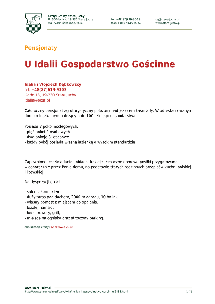 Urząd Gminy Stare Juchy Pl. 500-lecia 4, 19-330 Stare Juchy woj. warmińsko-mazurskie tel. +48(87)619-90-53 faks +48(87)619-90-53 [email protected] www.stare-juchy.pl Pensjonaty U Idalii Gospodarstwo Gościnne Idalia i Wojciech Dąbkowscy tel. +48(87)619-9303 Gorło 13, 19-330 Stare Juchy [email protected] Całoroczny pensjonat agroturystyczny położony nad jeziorem Łaśmiady. W odrestaurowanym domu mieszkalnym należącym do 100-letniego gospodarstwa. Posiada 7 pokoi noclegowych: - pięć pokoi 2-osobowych - dwa pokoje 3- osobowe - każdy pokój posiada własną łazienkę o wysokim standardzie Zapewnione jest śniadanie i obiado -kolacje - smaczne domowe posiłki przygotowane własnoręcznie przez Panią domu, na podstawie starych rodzinnych przepisów kuchni polskiej i litewskiej. Do dyspozycji gości: - salon z kominkiem - duży taras pod dachem, 2000 m ogrodu, 10 ha łąki - własny pomost z miejscem do opalania, - leżaki, hamaki, - łódki, rowery, grill, - miejsce na ognisko oraz strzeżony parking. Aktualizacja oferty: 12 czerwca 2010 www.stare-juchy.pl http://www.stare-juchy.pl/turystyka/i,u-idalii-gospodarstwo-goscinne,2883.html 1/1