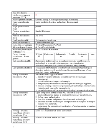Kod przedmiotu Liczba przyznanych punktów ECTS Nazwa przedmiotu (PL) Nazwa przedmiotu (EN) Język prowadzenia zajęć Poziom przedmiotu (PL) Poziom przedmiotu (EN) Profil studiów (PL) Profil studiów (EN) Jednostka prowadząca Kierownik przedmiotu Nazwiska pozostałych wykładowców Formy i metody kształcenia, liczba godzin Cele przedmiotu (PL) Cele przedmiotu (EN) Efekty kształcenia przedmiotu (PL) Efekty kształcenia przedmiotu (EN) Metody i kryteria weryfikacji efektów kształcenia (PL) Metody i kryteria weryfikacji efektów kształcenia (EN) 1 2 Główne trendy w rozwoju technologii chemicznej Main trends in chemical technology development polski Studia III stopnia 3rd level Technologia chemiczna Chemical technology Wydział Chemiczny PŁ (W3) dr Ewa Chrześcijańska dr inż. Elżbieta Kuśmierek Wykład Ćwiczenia 15 … Laboratoriu Projekt Seminariu Inne m … m … … … Zapoznanie doktorantów z kierunkami rozwoju współczesnych technologii w przemyśle chemicznym z uwzględnieniem zrównoważonego wykorzystania surowców, wody i energii. To acquaint PhD students with the trends in modern technology in chemical industry with special regard to sustainable usage of raw materials, water and energy. Po zakończeniu zajęć doktorant: 1. potrafi wymienić aktualne kierunki rozwoju technologii chemicznej, 2. potrafi definiować czyste technologie, 3. zna perspektywiczne nowoczesne czyste technologie węglowe, 4. posiada wiedzę z zakresu współczesnych technologii poszukiwania i eksploatacji surowców mineralnych, 5. rozumie konieczność stosowania technologii ochrony środowiska. Upon completion of the course PhD student is able to: 1. enumerate current trends in chemical technology development, 2. define clean technologies, 3. describe modern and perspective clean coal technologies, 4. describe modern technologies of exploration and deposit mining of mineral raw materials, 5. understand the necessity of application of environmental protection technologies. Efekt 1-5: pisemne i/lub ustne kolokwium Effect 1-5: written and/or oral test Wymagania wstępne (PL) Wymagania wstępne (EN) Treści merytoryczne przedmiotu (PL) Treści merytoryczne przedmiotu (EN) Forma zaliczenia (PL) Forma zaliczenia (EN) Literatura podstawowa (wypełniane w języku prowadzenia zajęć, bez tłumaczenia tytułów publikacji) Literatura uzupełniająca (wypełniane w języku prowadzenia zajęć, bez 2 Znajomość podstaw technologii chemicznej The knowledge of chemical technology fundamentals Wykład: Współczesne kierunki technologii chemicznej. Czyste technologie produkcji – energooszczędne i materiałooszczędne, bezpieczne dla środowiska. Czystych technologie wytwarzania energii, paliw i produktów chemicznych. Zgazowanie węgla połączone z produkcją ciepła i elektryczności. Nowoczesne technologie upłynniania węgla. Czystsza produkcja i ekooefektywność. Ekooptymalizacja procesów technologicznych. Nowoczesne procesy separacji membranowej. Procesy wytwarzania nanostrukturalnych materiałów dla technik separacyjnych. Współczesne i nowe technologie poszukiwania i eksploatacji surowców mineralnych. Zrównoważone wykorzystanie surowców, materiałów, wody i energii. Technologie modyfikacji powierzchniowej. Nowoczesne elektrochemiczne procesy przemysłowe. Rozwój nowych technologii ochrony środowiska. Lecture: Trends in chemical technology. Clean production technologies - energy-saving, material-saving and safe to the environment technologies. Clean technologies of energy, fuel and chemicals production. Coal gasification combined with heat and electricity production. Modern technologies of coal liquefaction. Cleaner production and eco-effectiveness. Eco-optimization of technological processes. Modern processes of membrane separation. Manufacturing processes of nanostructure materials for separation techniques. Modern technologies of exploration and deposit mining for mineral raw materials. Sustainable usage of raw materials, water and energy. Technologies of surface modification. Modern electrochemical processes in industry. Trends in modern technologies in the environmental protection. Ocena końcowa z przedmiotu składa się w 100% z oceny z kolokwium pisemnego i/lub ustnego z wykładu. The final grade consists of 100% of written and/or oral test grade. 1. J. A. Moulijn, Chemical process technology, Viley 2013. 2. A. Jess, Chemical technology: an integral textbook, Viley-Vch 2013. 3. R.E. Kirk, Kirk-Othmer encyclopedia of chemical technology, 5th ed., Viley-Interscience 2004. 4. R. Nowosielski, Czystsza produkcja i zrównoważone technologie. Wydawnictwo Politechniki Śląskiej, Gliwice 2008. 1. A. Ciszewski, Technologia chemiczna: procesy elektrochemiczne, Wydawnictwo Politechniki Poznańskiej 2008. 2. A. Johansson, Czystsza technologia. Środowisko, technika, tłumaczenia tytułów publikacji) Przeciętne obciążenie studenta pracą własną – ze zdefiniowaniem form pracy własnej (PL) przyszłość. WNT, Warszawa 1997. 3. Publikacje w specjalistycznych czasopismach naukowych. Suma wszystkich form zajęć Udział w konsultacjach Udział w pisemnych i/lub praktycznych formach weryfikacji Przegląd literatury Przygotowanie do kolokwium Suma godzin Przeciętne obciążenie Total hours of different forms of classes studenta pracą własną – Participation in consultation ze zdefiniowaniem form Participation in written and/or practical forms of assessment pracy własnej (EN) Literature review Preparation to the written test Total hours Uwagi (PL) Uwagi własne publikowane (PL) Uwagi własne publikowane (EN) Data aktualizacji 08.01.2015 3 15 6 4 10 15 50 15 6 4 10 15 50