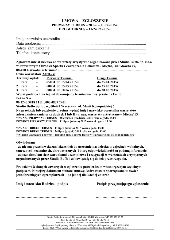 UMOWA – ZGŁOSZENIE PIERWSZY TURNUS – 28.06. – 11.07.2015r. DRUGI TURNUS – 11-24.07.2015r. Imię i nazwisko uczestnika ...................................................................................... Data urodzenia ......................................................................................................... Adres zamieszkania ................................................................................................ Telefon kontaktowy ................................................................................................ Zgłaszam udział dziecka na warsztaty artystyczne organizowane przez Studio Buffo Sp. z o.o. w Powiatowym Ośrodku Sportu i Zarządzania Lokalami - Miętne, ul. Główna 49, 08-400 Garwolin w terminie …………………………………………………………………… Cena warsztatów 2.050,- zł Terminy wpłat: Pierwszy Turnus: Drugi Turnus 1 rata 850 zł do 15.04.2015r. do 25.04.2015r. 2 rata 600 zł do 15.05.2015r. do 25.05.2015r. 3 rata 600 zł do 10.06.2015r. do 20.06.2015r. Wpłat podanych wyżej rat dokonujemy terminowo i wyłącznie na konto: Pekao S.A 80 1240 5918 1111 0000 4909 2901 Studio Buffo Sp. z o.o., 00-491 Warszawa, ul. Marii Konopnickiej 6 Na przekazie lub przelewie prosimy wpisać imię i nazwisko uczestnika warsztatów, adres zamieszkania oraz dopisek I lub II turnus, warsztaty artystyczne – Miętne’15. WYJAZD PIERWSZY TURNUS: 28 czerwca (niedziela) 2015 roku o godz. 15.00 POWRÓT PIERWSZY TURNUS: 11 lipca (sobota) 2015 roku ok. godz. 13.00 WYJAZD DRUGI TURNUS: 11 lipca (sobota) 2015 roku o godz. 15.00 POWRÓT DRUGI TURNUS: 24 lipca (piątek) 2015 roku ok. godz. 13.00 Wyjazd z Warszawy i powrót – parking przy Teatrze Buffo w Warszawie, ul. M. Konopnickiej 6 Oświadczam - że nie ma przeciwwskazań lekarskich do uczestnictwa dziecka w zajęciach wokalnych, tanecznych, teatralnych, akrobatycznych i biorę odpowiedzialność za podaną informację, - zapoznałem/łam się z warunkami uczestnictwa i rezygnacji w warsztatach artystycznych organizowanych przez Studio Buffo i zobowiązuję się do ich przestrzegania. Prawdziwość danych zawartych w zgłoszeniu potwierdzam własnoręcznym czytelnym podpisem. Niniejszy dokument stanowi umowę, która została sporządzona w dwóch jednobrzmiących egzemplarzach – po jednej dla każdej ze stron. Imię i nazwisko Rodzica i podpis Podpis przyjmującego zgłoszenie ............................................................. ………………………………………….. Studio Buffo Sp. z o.o., ul. Konopnickiej 6, 00-491 Warszawa, NIP 526 030 16 23 tel.: 22 622 63 93, 22 622 64 22 fax: 22 622 90 11 Pekao S.A. w Warszawie: 80 1240 5918 1111 0000 4909 2901 sąd rejestrowy: Sąd Rejonowy dla m.st. Warszawy XII Wydział Gospodarczy, KRS 0000188041 Regon 012619977; Zarząd jednoosobowy: Janusz Stokłosa; kapitał zakładowy: 100170 zł. Warunki uczestnictwa w warsztatach artystycznych: 1. Zawarcie umowy o udziale w warsztatach następuje w chwili podpisania zgłoszenia przez rodzica i wpłacenia pierwszej raty. 2. Bagaż na wyjazd : 1 szt. bagażu głównego (maks. 20 kg) i 1 szt. bagażu podręcznego (5 kg). 3. Studio Buffo zastrzega sobie prawo odwołania warsztatów w przypadkach: a/ znacznego wzrostu ceny warsztatów niezawinionych przez Studio, b/ zbyt małej liczby uczestników. 4. Studio Buffo zwraca całą wpłatę za warsztaty w przypadku: a/ odwołania warsztatów, b/ nie wzięcia udziału uczestnika w imprezie z winy Studia. 5. Studio Buffo nie dokonuje zwrotu wartości świadczeń, które nie zostały w pełni lub tylko częściowo wykorzystane przez uczestnika z jego woli lub winy np. spóźnienia na miejsce zbiórki, awarii własnego środka transportu, skrócenia pobytu, dobrowolnej rezygnacji z części świadczeń, a także przyczyn niezależnych tj. warunków atmosferycznych, decyzji administracyjnych władz i instytucji lokalnych, działania siły wyższej. 6. Uczestnik odpowiada materialnie za wyrządzone przez siebie szkody, za które ma obowiązek zapłacić na miejscu z własnych środków. 7. Jeżeli uczestnik nie weźmie udziału w warsztatach, Studio potrąca z dokonanej wpłaty koszty rezygnacji wyszczególnione niżej. Studio ma obowiązek dokonania zwrotu części lub całości wpłat w ciągu 30 dni od daty rezygnacji uczestnika lub daty uznania reklamacji. Od zwracanych kwot nie ma odsetek. 8. Wszelkie spory mogące wynikać z tytułu niniejszej umowy będą rozstrzygane przez sądy powszechne właściwe dla siedziby Studio Buffo. 9. Wszelkie zmiany niniejszej umowy wymagają formy pisemnej pod rygorem nieważności. Warunki rezygnacji z warsztatów artystycznych 1. W terminie do 30 dni przed rozpoczęciem imprezy potrąca się opłatę manipulacyjną w wysokości 250 zł. 2. W terminie 29 do 10 dni przed rozpoczęciem potrąca się 40% ceny warsztatów. 3. W terminie 9 do 4 dni przed rozpoczęciem imprezy potrąca się 70% ceny warsztatów. 4. W terminie krótszym niż 3 dni przed rozpoczęciem imprezy potrąca się 100% ceny warsztatów. 5. W przypadku konieczności rezygnacji z warsztatów, uczestnik ma prawo (bez ponoszenia kosztów), przekazać swoje miejsce innej osobie wraz z prawami i obowiązkami wynikającymi z treści niniejszej umowy. UWAGA! Podpisaną w dwóch egzemplarzach UMOWĘ - ZGŁOSZENIE dostarczamy: • w miejscu zajęć Studia tj. ul. Hoża 11/15 i Teatr Studio Buffo ul. M. Konopnickiej 6, • do sekretariatu Teatru Studio Buffo, 00-491 Warszawa, ul. M. Konopnickiej 6 (pocztą, mailem lub osobiście). Po otrzymaniu od Państwa Umów, Teatr Studio Buffo zwróci jeden podpisany egzemplarz. Podpis Rodzica ............................................................. Studio Buffo Sp. z o.o., ul. Konopnickiej 6, 00-491 Warszawa, NIP 526 030 16 23 tel.: 22 622 63 93, 22 622 64 22 fax: 22 622 90 11 Pekao S.A. w Warszawie: 80 1240 5918 1111 0000 4909 2901 sąd rejestrowy: Sąd Rejonowy dla m.st. Warszawy XI
