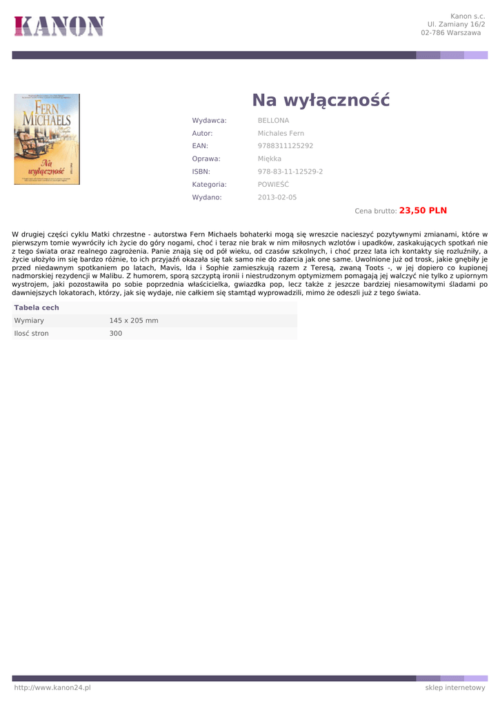 Kanon s.c. Ul. Zamiany 16/2 02-786 Warszawa Na wyłączność Wydawca: BELLONA Autor: Michales Fern EAN: 9788311125292 Oprawa: Miękka ISBN: 978-83-11-12529-2 Kategoria: POWIEŚĆ Wydano: 2013-02-05 Cena brutto: 23,50 PLN W drugiej części cyklu Matki chrzestne - autorstwa Fern Michaels bohaterki mogą się wreszcie nacieszyć pozytywnymi zmianami, które w pierwszym tomie wywróciły ich życie do góry nogami, choć i teraz nie brak w nim miłosnych wzlotów i upadków, zaskakujących spotkań nie z tego świata oraz realnego zagrożenia. Panie znają się od pół wieku, od czasów szkolnych, i choć przez lata ich kontakty się rozluźniły, a życie ułożyło im się bardzo różnie, to ich przyjaźń okazała się tak samo nie do zdarcia jak one same. Uwolnione już od trosk, jakie gnębiły je przed niedawnym spotkaniem po latach, Mavis, Ida i Sophie zamieszkują razem z Teresą, zwaną Toots -, w jej dopiero co kupionej nadmorskiej rezydencji w Malibu. Z humorem, sporą szczyptą ironii i niestrudzonym optymizmem pomagają jej walczyć nie tylko z upiornym wystrojem, jaki pozostawiła po sobie poprzednia właścicielka, gwiazdka pop, lecz także z jeszcze bardziej niesamowitymi śladami po dawniejszych lokatorach, którzy, jak się wydaje, nie całkiem się stamtąd wyprowadzili, mimo że odeszli już z tego świata. Tabela cech Wymiary 145 x 205 mm Ilosć stron 300 http://www.kanon24.pl sklep internetowy