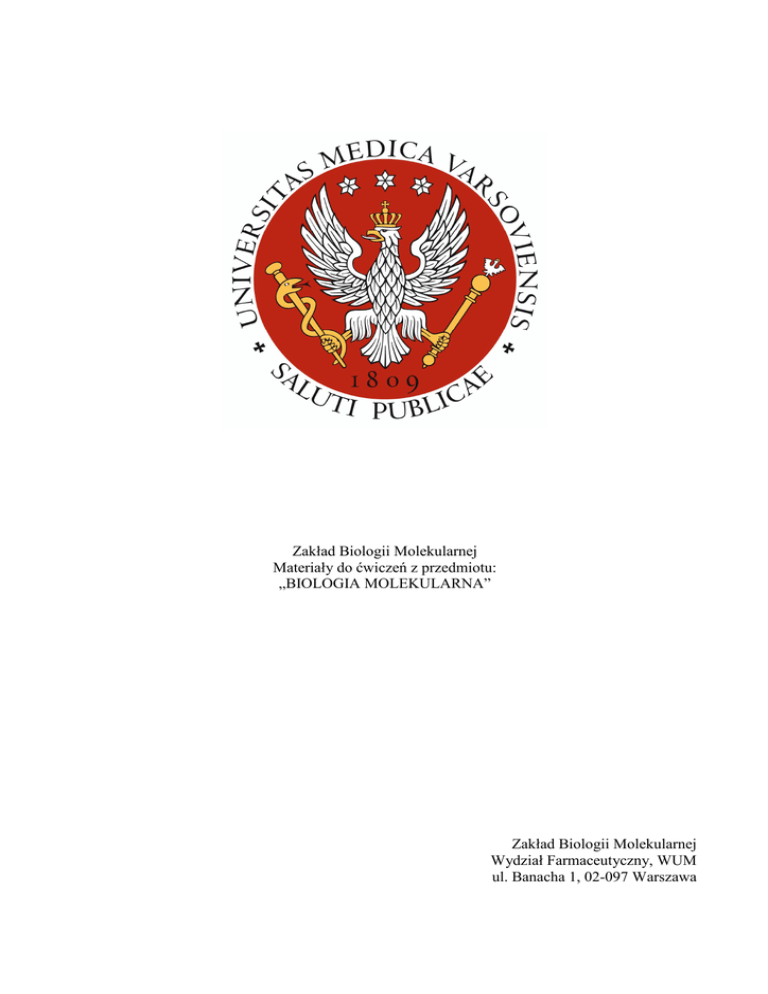 Zakład Biologii Molekularnej Materiały do ćwiczeń z przedmiotu: „BIOLOGIA MOLEKULARNA” Zakład Biologii Molekularnej Wydział Farmaceutyczny, WUM ul. Banacha 1, 02-097 Warszawa Zakład Biologii Molekularnej, Wydział Farmaceutyczny, WUM. IZOLACJA DNA Z HODOWLI KOMÓRKOWEJ. REAKCJA PCR. ELEKTROFOREZA W ŻELU AGAROZOWYM Uwagi wstępne: Praca z kwasami nukleinowymi wymaga zachowania szczególnej czystości, ponieważ kwasy nukleinowe łatwo ulegają degradacji. Miejsce do izolacji kwasów nukleinowych przemywamy 70% etanolem Wszystkie czynności wykonujemy w czystych rękawiczkach, które przemywamy 70% etanolem 1. Izolacja DNA z hodowli komórkowej Przygotowanie materiału i protokół izolacji DNA Pelet z komórek (ok. 1x106 komórek) dokładnie zawiesić (przepipetować) w 100µl buforu Tris Dodać 200µl uniwersalnego buforu lizującego LT Dodać 20µl roztworu Proteinazy K Całość wymieszać i inkubować w temp. 37oC (20 min) Przenieść próbkę do 75oC i inkubować 5 min. Próbkę intensywnie worteksować 20 s Wirować 3 min przy 12tyś. RPM Pobrać supernatant i nanieść na minikolumnę do oczyszczania genomowego DNA Wirować 1 min. przy 10-15 tyś. RPM Wyjąć minikolumnę usunąć przesącz z dolnej probówki. Kolumnę umieścić ponownie w tej samej dolnej probówce. Do kolumny dodać 500µl roztworu płuczącego A1 (DNA znajduje się na minikolumnie) Wirować 1 min. przy 12 tyś. RPM Usunąć przesącz z dolnej probówki i dodać do minikolumny 400µl roztworu płuczącego A1 (DNA znajduje się na minikolumnie) Wirować 2 min. przy 12 tyś. RPM Osuszoną minikolumnę umieścić w nowej probówce 2 ml (probówka bez wieczka) i do złoża znajdującego się na dnie kolumny dodać 200µl buforu Tris uprzednio ogrzanego do temp.75oC Inkubować próbkę przez 5 min. w temp. pokojowej Wirować 1 min. przy 12 tyś. RPM 2 Zakład Biologii Molekularnej, Wydział Farmaceutyczny, WUM. Minikolumnę usunąć, a oczyszczone DNA znajdujące się w probówce przenieść do eppendorfa przetrzymywać w lodówce do czasu dalszych analiz lub użyć od razu do reakcji PCR. 2.Wykonanie reakcji PCR 1.2.Przygotowanie mieszaniny reakcyjnej Należy wykonać tzw. mix reakcyjny na 4 reakcje (1 miks na 4 osoby) Skład mieszaniny reakcyjnej Bufor 10x dNTP starter F starter R polimeraza matryca H2O 1 reakcja 2µl 2µl 1µl 1µl 0,5µl ---uzupełnić do 18µl 4 reakcje Miks rozdzielić na 4 opisane probówki (0,2 ml).Do probówki, każda osoba indywidualnie dodaje 2 µl swojej matrycy (DNA). Zworteksować lub prze pipetować kilkukrotnie. 2.2. Po przygotowaniu mieszaniny reakcyjnej i po dodaniu do niej matrycy w odpowiedniej ilości jak zamieszczono powyżej należy wykonać reakcję PCR. PCR wykonujemy w termocyklerze, który umożliwia płynną zmianę temperatury. Etapy reakcji PCR 1. Denaturacja.- pierwszym etapem jest rozplecenie podwójnej helisy matrycowego DNA. W wysokiej temperaturze (zwykle około 95 °C) pękają wiązania wodorowe i podwójna helisa DNA rozdziela się na dwa pojedyncze łańcuchy. W celu uzyskania tego efektu podnosi się temperaturę mieszaniny reakcyjnej do wymaganych 95° na 15 sekund. 2. Annealing – hybrydyzacja odcinków starterowych. Polega na tworzeniu odcinków dwuniciowych, składających się z przygotowanych starterów - cząsteczek DNA komplementarnych do sekwencji DNA oskrzydlających gen mający ulec namnożeniu - z 3 Zakład Biologii Molekularnej, Wydział Farmaceutyczny, WUM. matrycową cząsteczką DNA. Etap ten zachodzi w temperaturze niższej, ściśle określonej dla danej pary starterów (pomiędzy 45-60 °C), przyłączają się one do matrycy.. 3. Elongacja – Na tym etapie zachodzi właściwa synteza DNA i tym samym amplifikacja pożądanego genu. Podwyższenie temperatury do około 72 °C powoduje utworzenie się na matrycy, z przyłączonymi do niej starterami, kompleksu z polimerazą DNA, wskutek czego rozpoczyna się synteza nici komplementarnej do matrycy. Reakcja ta trwa zwykle 30 sekund. Próbki po wyjęciu z termocyklera należy wymieszać, krótko zworteksować a następnie Po zakończonej reakcji nanieść próbkę na żel agarozowy 3. Elektroforeza produktów reakcji PCR Produkt reakcji identyfikujemy rozdzielając uzyskany materiał w żelu agarozowym. Równocześnie z badanym genem nanosimy na żel standardy masowe - fragmenty DNA o znanych masach cząsteczkowych wyrażonych w ilości par zasad. Na podstawie położenia badanego genu w stosunku do standardów masowych określamy jego wielkość. Potrzebne materiały i odczynniki: Bufor do elektroforezy TAE 1x (10x TAE: 40mM Tris, 0,12 % kwas octowy, 1mM EDTA pH 8,0, ) Agaroza Bromek etydyny Obciążnik (10x obciążnik: 0,25% bromophenol blue, 0,25% xylene cyanol, 20% ficoll typ 400) Saneczki, grzebienie i komora elektroforetyczna Wzmacniacz prądu Kuchenka mikrofalowa UWAGA!!! Bromek etydyny jest silnym kancerogenem! Należy bezwzględnie pracować w rękawiczkach! Przygotowanie 1,5 % żelu agarozowego 1. Saneczki włożyć w formę i wyważyć jej równowagę 2. W saneczki włożyć grzebień 3. Przygotować żel agarozowy 1,5% w objętości 70 ml Miejsce na obliczenia 4 Zakład Biologii Molekularnej, Wydział Farmaceutyczny, WUM. 1. 2. 3. 4. 5. Odpowiednią naważkę agarozy rozpuścić na gorąco w buforze TAE 1x Klarowny roztwór agarozy ochłodzić do temp ok 50ºC Pod wyciągiem, do roztworu agarozy dodać 4 µl bromku etydyny, zamieszać Wylać żel na sanaczki, uważając by nie pojawiły się bąble powietrza Żel zastyga ok 20 min Elektroforeza RNA w żelu agarozowym 1. Z żelu wyciągnąć grzebień i przenieść saneczki do komory elektroforetycznej 2. Napełnić komorę buforem TAE 1x, w ilości, która zapewni pokrycie żelu 3. Próby RNA należy inkubować w temp 70ºC przez 1 min, a następnie umieścić na lodzie 4. nałożyć na żel: 3 µl markera wielkości 5. Przygotować próby do nałożenia na żel: 10 µl próby + 3 µl obciążnika, wymieszać i nałoży