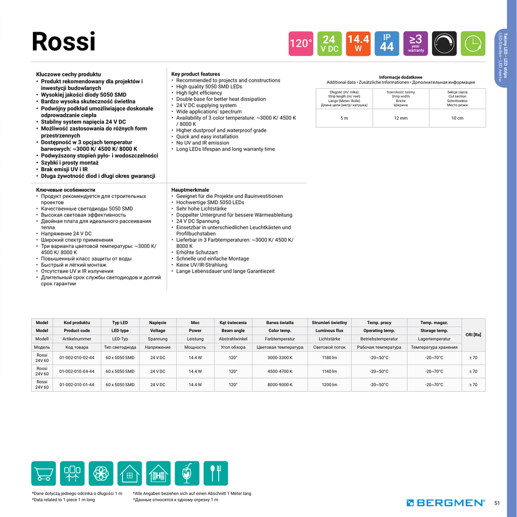 ≥3 14.4 IP 160° 120° V24 44 W DC Kluczowe cechy produktu • Produkt rekomendowany dla projektów i inwestycji budowlanych • Wysokiej jakości diody 5050 SMD • Bardzo wysoka skuteczność świetlna • Podwójny podkład umożliwiające doskonałe odprowadzanie ciepła • Stabilny system napięcia 24 V DC • Możliwość zastosowania do różnych form przestrzennych • Dostępność w 3 opcjach temperatur barwowych: ~3000 K/ 4500 K/ 8000 K • Podwyższony stopień pyło- i wodoszczelności • Szybki i prosty montaż • Brak emisji UV i IR • Długa żywotność diod i długi okres gwarancji Key product features • Recommended to projects and constructions • High quality 5050 SMD LEDs • High light efficiency • Double base for better heat dissipation • 24 V DC supplying system • Wide applications' spectrum • Availability of 3 color temperature: ~3000 K/ 4500 K / 8000 K • Higher dustproof and waterproof grade • Quick and easy installation • No UV and IR emission • Long LEDs lifespan and long warranty time Ключевые особенности • Продукт рекомендуется для строительных проектов • Качественные светодиоды 5050 SMD • Высокая световая эффективность • Двойная плата для идеального рассеивания тепла • Напряжение 24 V DC • Широкий спектр применения • Три варианта цветовой температуры: ~3000 K/ 4500 K/ 8000 K • Повышенный класс защиты от воды • Быстрый и лёгкий монтаж • Отсутствие UV и IR излучения • Длительный срок службы светодиодов и долгий срок гарантии Hauptmerkmale • Geeignet für die Projekte und Bauinvestitionen • Hochwertige SMD 5050 LEDs • Sehr hohe Lichtstärke • Doppelter Untergrund für bessere Wärmeableitung • 24 V DC Spannung • Einsetzbar in unterschiedlichen Leuchtkästen und Profilbuchstaben • Lieferbar in 3 Farbtemperaturen: ~3000 K/ 4500 K/ 8000 K • Erhöhte Schutzart • Schnelle und einfache Montage • Keine UV/IR-Strahlung • Lange Lebensdauer und lange Garantiezeit year warranty Informacje dodatkowe Additional data • Zusätzliche Informationen • Дополнительная информация Długość (m/ rolka) Strip length (m/ reel) Länge (Meter/ Rolle) Длина цепи (метр/ катушка) Szerokość taśmy Strip width Breite Ширина Sekcje cięcia Cut section Schnittsektor Место резки 5m 12 mm 10 cm Model Kod produktu Typ LED Napięcie Moc Kąt świecenia Barwa światła Strumień świetlny Temp. pracy Model Product code LED type Voltage Power Beam angle Color temp. Luminous flux Operating temp. Storage temp. Modell Artikelnummer LED-Typ Spannung Leistung Abstrahlwinkel Farbtemperatur Lichtstärke Betriebstemperatur Lagertemperatur Модель Код товара Тип светодиода Напряжение Мощность Угол обзора Цветовая температура Световой поток Рабочая температура Температура хранения Rossi 24V 60 01-002-010-02-44 60 x 5050 SMD 24 V DC 14.4 W 120° 3000-3300 K 1180 lm -20~50°C -20~70°C ≥ 70 Rossi 24V 60 01-002-010-04-44 60 x 5050 SMD 24 V DC 14.4 W 120° 4500-4700 K 1140 lm -20~50°C -20~70°C ≥ 70 Rossi 24V 60 01-002-010-01-44 60 x 5050 SMD 24 V DC 14.4 W 120° 8000-9000 K 1200 lm -20~50°C -20~70°C ≥ 70 Taśmy LED • LED strips LED-Streifen • LED ленты Rossi Temp. magaz. CRI [Ra] H *Dane dotyczą jednego odcinka o długości 1 m *Data related to 1 piece 1 m long *Alle Angaben beziehen sich auf einen Abschnitt 1 Meter lang *Данные относятся к одному отрезку 1 m 51