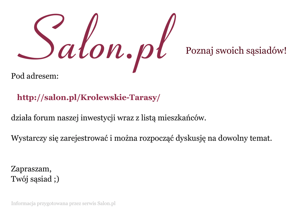 Salon.pl Poznaj swoich sąsiadów! Pod adresem: http://salon.pl/Krolewskie-Tarasy/ działa forum naszej inwestycji wraz z listą mieszkańców. Wystarczy się zarejestrować i można rozpocząć dyskusję na dowolny temat. Zapraszam, Twój sąsiad ;) Informacja przygotowana przez serwis Salon.pl