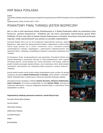 KMP BIAŁA PODLASKA Źródło: http://biala-podlaska.lubelska.policja.gov.pl/lbp/informacje/aktualnosci/57873,Powiatowy-final-turnieju-JESTEM-BEZPIECZNY.h tml Wygenerowano: Środa, 8 marca 2017, 14:07 POWIATOWY FINAŁ TURNIEJU JESTEM BEZPIECZNY Jak co roku w hali sportowej Szkoły Podstawowej nr 5 Białej Podlaskiej odbył się powiatowy finał konkursu „Jestem bezpieczny”. Podobnie jak rok temu zwyciężyła reprezentacja gminy Biała Podlaska. W tym roku była to jednak Szkoła Podstawowa w Hrudzie. Zwycięzcy otrzymali atrakcyjne nagrody i będą reprezentowali nasz powiat na szczeblu wojewódzkim. Komenda Miejska Policji już od 16 lat głównym organizatorem konkursu „Jestem Bezpieczny”. Jego celem jest upowszechnienie wiedzy o zagrożeniach z jakimi młodzi ludzie mogą spotkać się w swoim codziennym życiu, rozwijanie postaw umożliwiających unikanie, zapobieganie i pokonywanie niebezpieczeństw oraz zapoznanie dzieci i młodzieży z prawidłowymi reakcjami w sytuacjach zagrożenia życia i zdrowia. W dzisiejszym finale, przeprowadzonym pod patronatem Prezydenta Miasta oraz Starosty Bialskiego o zwycięstwo walczyło 17 szkół podstawowych, które wygrały eliminacje gminne. Turniej składał się z trzech konkurencji: test wiedzy, graficzny projekt koszulki promującej bezpieczeństwo, oraz inscenizacja, która miała wskazać zachowania alternatywne dla niebezpieczeństw grożących naszym dzieciom i młodzieży. Jurorzy bardzo wysoko ocenili poziom wiedzy prezentowany przez uczniów. Po zaciętej rywalizacji zwyciężyła Szkoła Podstawowa w Hrudzie, przed szkołami z Sosnówki i Szóstki. Wszystkie dzieci uczestniczące w konkursie otrzymały atrakcyjne nagrody. Zwycięska drużyna wystąpiła w składzie Szymon Kucewicz, Martyna Chałstowska, Anita Prokopiuk. Do turnieju przygotowała ich pani Jolanta Madej. Zwycięzcom serdecznie gratulujemy i życzymy osiągnięcia wysokiej lokaty w czerwcowym finale wojewódzkim w Lublinie. Organizatorzy dziękują sponsorom konkursu, wśród których byli: Prezydent Miasta Biała Podlaska Starosta Bialski KRUS Biała Podlaska WORD Biała Podlaska ALUTEAM POLSKA MIREX JB MULIMEDIA BIALCON GARDEN SERVICE GREINPLAST GEOINVEST Market MRÓWKA KOSMET-HURT PIECHOCKA TRAVEL CARREFOUR BIURO PROJEKTÓW PIOTR DAWIDZIUK FIRMA PEGAZ PIOTR RUDZKI ART STAL TOMASZ TROJAN CENTRUM HANDLOWE "RYWAL" Powiatowy finał turnieju JESTEM BEZPIECZNY Jak co roku w hali sportowej Szkoły Podstawowej nr 5 Białej Podlaskiej odbył się powiatowy finał konkursu „Jestem bezpieczny”. Podobnie jak rok temu zwyciężyła reprezentacja gminy Biała Podlaska. W tym roku była to jednak Szkoła Podstawowa w Hrudzie. Zwycięzcy otrzymali atrakcyjne nagrody i będą reprezentowali nasz powiat na szczeblu wojewódzkim. Komenda Miejska Policji już od 16 lat głównym organizatorem konkursu „Jestem Bezpieczny”. Jego celem jest upowszechnienie wiedzy o zagrożeniach z jakimi młodzi ludzie mogą spotkać się w swoim codziennym życiu, rozwijanie postaw umożliwiających unikanie, zapobieganie i pokonywanie niebezpieczeństw oraz zapoznanie dzieci i młodzieży z prawidłowymi reakcjami w sytuacjach zagrożenia życia i zdrowia. W dzisiejszym finale, przeprowadzonym pod patronatem Prezydenta Miasta oraz Starosty Bialskiego o zwycięstwo walczyło 17 szkół podstawowych, które wygrały eliminacje gminne. Turniej składał się z trzech konkurencji: test wiedzy, graficzny projekt koszulki promującej bezpieczeństwo, oraz inscenizacja, która miała wskazać zachowania alternatywne dla niebezpieczeństw grożących naszym dzieciom i młodzieży. Jurorzy bardzo wysoko ocenili poziom wiedzy prezentowany przez uczniów. Po zaciętej rywalizacji zwyciężyła Szkoła Podstawowa w Hrudzie, przed szkołami z Sosnówki i Szóstki. Wszystkie dzieci uczestniczące w konkursie otrzymały atrakcyjne nagrody. Zwycięska drużyna wystąpiła w składzie Szymon Kucewicz, Martyna Chałstowska, Anita Prokopiuk. Do turnieju przygotowała ich pani Jolanta Madej. Zwycięzcom serdecznie gratulujemy i życzymy osiągnięcia wysokiej lokaty w czerwcowym finale wojewódzkim w Lublinie. Organizatorzy dziękują sponsorom konkursu, wśród których byli: Prezydent Miasta Biała Podlaska Starosta Bialski KRUS Biała Podlaska WORD Biała Podlaska ALUTEAM POLSKA MIREX JB MULIMEDIA BIALCON GARDEN SERVICE GREINPLAST GEOINVEST Market MRÓWKA KOSMET-HURT PIECHOCKA TRAVEL CARREFOUR BIURO PROJEKTÓW PIOTR DAWIDZIUK FIRMA PEGAZ PIOTR RUDZKI ART STAL TOMASZ TROJAN CENTRUM HANDLOWE "RYWAL" Ocena: 0/5 (0) Tweetnij