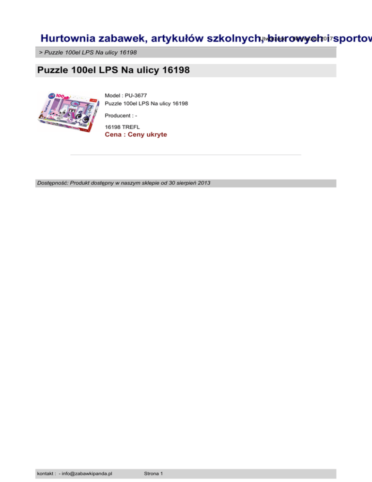 : 08 marzec 2017 Hurtownia zabawek, artykułów szkolnych,Utworzono biurowych i sportow > Puzzle 100el LPS Na ulicy 16198 Puzzle 100el LPS Na ulicy 16198 Model : PU-3677 Puzzle 100el LPS Na ulicy 16198 Producent : 16198 TREFL Cena : Ceny ukryte Dostępność: Produkt dostępny w naszym sklepie od 30 sierpień 2013 kontakt : - [email protected] Strona 1