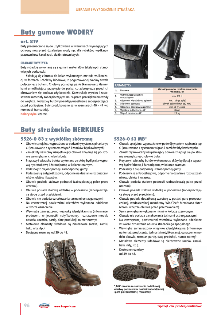 UBRANIE I WYPOSAŻENIE STRAŻAKA Buty gumowe WODERY art. 819 Buty przeznaczone są do użytkowania w warunkach wymagających ochrony nóg przed działaniem wody np. dla rybaków, wędkarzy, pracowników kanalizacji, służb ratowniczych. CHARAKTERYSTYKA Buty rybackie wykonane są z gumy i materiałów tekstylnych stanowiących podszewki. Składają się z butów do kolan wykonanych metodą wulkanizacji w formach i cholewy biodrowej z pogumowanej tkaniny trwale połączonej z butami. Cholewy posiadają paski tkaninowe z klamerkami umożliwiające przypięcie do paska, co zabezpiecza przed ich obsuwaniem się podczas użytkowania. Konstrukcja wyrobu i zastosowane materiały zabezpieczają w 100 % przed przesiąkaniem wody do wnętrza. Podeszwy butów posiadają urzeźbienie zabezpieczające przed poślizgiem. Buty produkowane są w rozmiarach 40 - 47 wg numeracji francuskiej. Kolorystyka: czarne. PARAMETRY Lp. 1. 2. 3. 4. 5. 6. Parametr Wytrzymałość wierzchów na rozciąganie Odporność wierzchów na zginanie Ścieralność podeszew Odporność podeszew na zginanie Wysokość butów /rozm. 43/ Waga 1 pary /rozm. 43/ Wartość parametru i metoda oznaczania wg PN EN 344 min. 180 N min. 125 tys. zgięć ubytek objętości max 250 mm3 min. 30 tys. zgięć 85 cm 2,8 kg Buty strażackie HERKULES 5526-0 83 z wyściółką skórzaną 5526-0 S3 MB* • • • • • • • • • • • • • Obuwie specjalne, wyposażone w podwójny system zapinania typ C (sznurowane z systemem wiązań i zamków błyskawicznych). Zamek błyskawiczny uzupełniający obuwia znajduje się po stronie wewnętrznej cholewki buta. Przyszwy i wierzchy butów wykonano ze skóry bydlęcej z wyprawą hydrofobową i żaroodporną w kolorze czarnym. Podeszwy z olejoodpornej i żaroodpornej gumy. Podeszwy są antypoślizgowe, odporne na działanie rozpuszczalników, olejów i kwasów. Obuwie posiada stalowe podnoski (zabezpieczają palce przed urazami). Obuwie posiada stalową wkładkę w podeszwie (zabezpieczającą stopę przed przebiciem). Obuwie nie posiada oznakowania taśmami ostrzegawczymi Na zewnętrznej powierzchni wierchów wykonano odciskane w skórze oznaczenie. Wewnątrz zamieszczono wszywkę identyfikacyjną (informacje: producent, nr jednostki notyfikowanej, oznaczenie modelu obuwia, rozmiar, partię, datę produkcji, numer normy). Metalowe elementy składowe są nierdzewne (oczka, zamki, haki, nity, itp.). Dostępne rozmiary od 39 do 48. • • • • • • • • • • • • • Obuwie specjalne, wyposażone w podwójny system zapinania typ C (sznurowane z systemem wiązań i zamków błyskawicznych). Zamek błyskawiczny uzupełniający obuwia znajduje się po stronie wewnętrznej cholewki buta. Przyszwy i wierzchy butów wykonano ze skóry bydlęcej z wyprawą hydrofobową i żaroodporną w kolorze czarnym. Podeszwy z olejoodpornej i żaroodpornej gumy. Podeszwy są antypoślizgowe, odporne na działanie rozpuszczalników, olejów i kwasów. Obuwie posiada stalowe podnoski (zabezpieczają palce przed urazami). Obuwie posiada stalową wkładkę w podeszwie (zabezpieczającą stopę przed przebiciem). Obuwie posiada dodatkową warstwę w postaci paro przepuszczalnej, wodoszczelnej membrany WindTex® Membrana futer (chroni wnętrze obuwia przed przemakaniem). Szwy zewnętrzne wykonano nićmi w kolorze czerwonym. Obuwie nie posiada oznakowania taśmami ostrzegawczymi. Na zewnętrznej powierzchni wierchów wykonano odciskane w skórze oznaczenie obuwia strażackiego specjalnego. Wewnątrz zamieszczono wszywkę identyfikacyjną (informacje na temat: producenta, jednostki notyfikowanej, oznaczenie modelu obuwia, rozmiar, partię, datę produkcji, numer normy) Metalowe elementy składowe są nierdzewne (oczka, zamki, haki, nity, itp.). Dostępne rozmiary od 39 do 48. *„MB” oznacza zastosowanie dodatkowej warstwy podszewki w postaci wodoodpornej i paro-przepuszczalnej membrany. 96