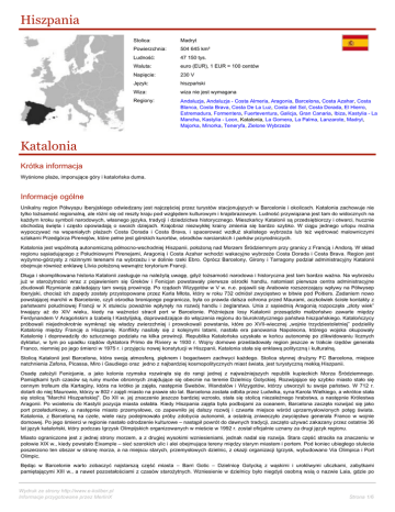 Hiszpania Stolica: Madryt Powierzchnia: 504 645 km² Ludność: 47 150 tys. Waluta: euro (EUR), 1 EUR = 100 centów Napięcie: 230 V Język: hiszpański Wiza: wiza nie jest wymagana Regiony: Andaluzja, Andaluzja - Costa Almeria, Aragonia, Barcelona, Costa Azahar, Costa Blanca, Costa Brava, Costa De La Luz, Costa del Sol, Costa Dorada, El Hierro, Estremadura, Formentera, Fuerteventura, Galicja, Gran Canaria, Ibiza, Kastylia - La Mancha, Kastylia - Leon, Katalonia, La Gomera, La Palma, Lanzarote, Madryt, Majorka, Minorka, Teneryfa, Zielone Wybrzeże Katalonia Krótka informacja Wyśnione plaże, imponujące góry i katalońska duma. Informacje ogólne Unikalny region Półwyspu Iberyjskiego odwiedzany jest najczęściej przez turystów stacjonujących w Barcelonie i okolicach. Katalonia zachowuje nie tylko tożsamość regionalną, ale różni się od reszty kraju pod względem kulturowym i krajobrazowym. Ludność przywiązana jest tam do widocznych na każdym kroku symboli narodowych, własnego języka, tradycji i dziedzictwa historycznego. Mieszkańcy Katalonii są przedsiębiorczy i otwarci, hucznie obchodzą święta i często opowiadają o swoich dziejach. Krajobraz niezwykłej krainy zmienia się bardzo szybko. W ciągu jednego urlopu można wypoczywać na wspaniałych plażach Costa Dorada i Costa Brava, i spacerować wzdłuż skalistego wybrzeża lub też wędrować malowniczymi szlakami Przedgórza Pirenejów, które pełne jest górskich kurortów, ośrodków narciarskich i parków przyrodniczych. Katalonia jest wspólnotą autonomiczną północno-wschodniej Hiszpanii, położoną nad Morzem Śródziemnym przy granicy z Francją i Andorą. W skład regionu sąsiadującego z Południowymi Pirenejami, Aragonią i Costa Azahar wchodzi wakacyjne wybrzeże Costa Dorada i Costa Brava. Region jest wyżynno-górzysty z nizinnymi terenami na wybrzeżu i w dolinie rzeki Ebro. Oprócz Barcelony, Girony i Tarragony podział administracyjny Katalonii obejmuje również enklawę Llivia położoną wewnątrz terytorium Francji. Długa i skomplikowana historia Katalonii zasługuje na należytą uwagę, gdyż tożsamość narodowa i historyczna jest tam bardzo ważna. Na wybrzeżu już w starożytności wraz z pojawieniem się Greków i Fenicjan powstawały pierwsze ośrodki handlu, natomiast pierwsze centra administracyjne zbudowali Rzymianie zakładający tam swoją prowincję. Po rządach Wizygotów w V w. n.e. pojawili się Arabowie rozszerzający wpływy na Półwysep Iberyjski, chociaż ich zapędy zostały przystopowane przez Karla Młota, który w roku 732 odniósł zwycięstwo w bitwie pod Poitiers. Zadaniem nowo powstającej marchii w Barcelonie, czyli ośrodka broniącego pogranicza, była co prawda dalsza ochrona przed Maurami, aczkolwiek ścisłe kontakty z państwami południowej Francji w X stuleciu poważnie wpłynęły na rozwój handlu i żeglarstwa. Unia z sąsiednią Aragonią rozpoczęła „złoty wiek” trwający aż do XIV wieku, kiedy na ważności stracił port w Barcelonie. Późniejsze losy Katalonii przesądziło małżeństwo zawarte między Ferdynandem V Aragońskim a Izabelą I Kastylijską, doprowadzające do włączenia regionu do biurokratycznego państwa hiszpańskiego. Katalończycy próbowali niejednokrotnie wymknąć się władzy zwierzchniej i prowokowali powstania, które po XVII-wiecznej „wojnie trzydziestoletniej” podzieliły Katalonię między Francję a Hiszpanię. Konflikty nasilały się z kolejnymi latami, nastała era panowania Napoleona, którego wojska okupowały Katalonię i doprowadziły do sztucznego podziału na kilka prowincji. Republika Katalońska uzyskała w końcu autonomię po zlikwidowaniu licznych dyktatur, w tym po upadku rządów dyktatora Primo de Riviery w 1930 r. Wojny domowe prześladowały region jeszcze w trakcie rzędów generała Franco, niemniej po jego śmierci w 1975 r. i przyjęciu nowej konstytucji w Hiszpanii, Katalonia stała się enklawą polityczną i kulturalną. Stolicą Katalonii jest Barcelona, która swoją atmosferą, pięknem i bogactwem zachwyci każdego. Stolica słynnej drużyny FC Barcelona, miejsce natchnienia Zafona, Picassa, Miro i Gaudiego oraz jedno z najbardziej kosmopolitycznych miast świata, jest turystyczną mekką Hiszpanii. Osadę założyli Fenicjanie, a jako kolonia rzymska rozwinęła się do rangi jednej z najważniejszych republik kupieckich Morza Śródziemnego. Pamiątkami tych czasów są ruiny murów obronnych znajdujące się obecnie na terenie Dzielnicy Gotyckiej. Rozwijające się szybko miasto stało się cennym trofeum dla Kartaginy, która na krótko je zajęła, następnie Swebów, Wandalów i Wizygotów, którzy utworzyli tu swoje państwo. W 712 r. dotarli do niej Maurowie, którzy w 802 r zajęli miasto na prawie sto lat. Barcelona została odbita przez Ludwika, syna Karola Wielkiego, a wkrótce stała się stolicą "Marchii Hiszpańskiej". Do XII w. jej znaczenie jeszcze bardziej wzrosło, stała się stolicą niezależnego hrabstwa, a następnie Królestwa Aragonii. Po wcieleniu do Kastylii pozycja miasta osłabła. Kiedy Hiszpania zajęta była podbojami za oceanem, Barcelona zaczęła rozwijać się jako port przeładunkowy, a następnie miasto przemysłowe, co zapewniło jej dalszy rozwój i czwarte miejsce wśród uprzemysłowionych potęg świata. Katalonia, z Barceloną na czele, wiele razy podejmowała próby zdobycia autonomii, a ostatnią zniweczyło zwycięstwo generała Franco w wojnie domowej. Po jego śmierci w regionie nastało odrodzenie kulturowe – nastąpił powrót do dawnych tradycji, zaczęto używać zakazany przez ostatnie 36 lat język kataloński, który podczas Igrzysk Olimpijskich organizowanych w mieście w 1992 r. został oficjalnie uznany za drugi język regionu. Miasto ograniczone jest z jednej strony morzem, a z drugiej wysokimi wzniesieniami, jednak nadal się rozwija. Stara część straciła na znaczeniu w połowie XIX w., kiedy p
