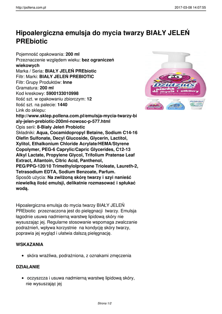 http://pollena.com.pl 2017-03-08 14:07:55 Hipoalergiczna emulsja do mycia twarzy BIAŁY JELEŃ PREbiotic Pojemność opakowania: 200 ml Przeznaczenie względem wieku: bez ograniczeń wiekowych Marka / Seria: BIAŁY JELEŃ PREbiotic Filtr: Marki: BIAŁY JELEŃ PREBIOTIC Filtr: Grupy Produktów: Inne Gramatura: 200 ml Kod kreskowy: 5900133010998 Ilość szt. w opakowaniu zbiorczym: 12 Ilość szt. na palecie: 1440 Link do sklepu: http://www.sklep.pollena.com.pl/emulsja-mycia-twarzy-bi aly-jelen-prebiotic-200ml-nowosc-p-577.html Opis serii: 8-Biały Jeleń Probiotic Składniki: Aqua, Cocamidopropyl Betaine, Sodium C14-16 Olefin Sulfonate, Decyl Glucoside, Glycerin, Lactitol, Xylitol, Ethalkonium Chloride Acrylate/HEMA/Styrene Copolymer, PEG-6 Caprylic/Capric Glycerides, C12-13 Alkyl Lactate, Propylene Glycol, Trifolium Pratense Leaf Extract, Allantoin, Citric Acid, Panthenol, PEG/PPG-120/10 Trimethylolpropane Trioleate, Laureth-2, Tetrasodium EDTA, Sodium Benzoate, Parfum. Sposób użycia: Na zwilżoną skórę twarzy i szyi nanieść niewielką ilość emulsji, delikatnie rozmasować i spłukać wodą. Hipoalergiczna emulsja do mycia twarzy BIAŁY JELEŃ PREbiotic przeznaczona jest do pielęgnacji twarzy. Emulsja łagodnie usuwa nadmierną warstwę lipidową skóry nie wysuszając jej. Regularne stosowanie wspomaga zwalczanie podrażnień, wpływa korzystnie na kondycję skóry twarzy, poprawia jej wygląd i ułatwia dalszą pielęgnację. WSKAZANIA skóra wrażliwa, podrażniona, z oznakami zmęczenia DZIAŁANIE oczyszcza i usuwa nadmierną warstwę lipidową skóry, nie wysuszając jej Strona 1/2 http://pollena.com.pl 2017-03-08 14:07:56 przygotowuje skórę do dalszej pielęgnacji wpływa korzystnie na kondycję skóry twarzy, poprawia jej wygląd chroni przed negatywnym wpływem środowiska SKŁADNIKI AKTYWNE ksylitol i laktitol - naturalne prebiotyki utrzymują prawidłową równowagę ekosystemu mikroflory skóry ekstrakt z czerwonej koniczyny - działa przeciwutleniająco i ujędrniająco alantoina - działa łagodząco na skórę Strona 2/2