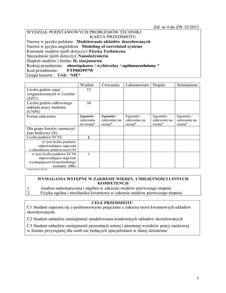 Zał. nr 4 do ZW 33/2012 WYDZIAŁ PODSTAWOWYCH PROBLEMÓW TECHNIKI KARTA PRZEDMIOTU Nazwa w języku polskim Modelowanie układów skorelowanych Nazwa w języku angielskim Modeling of correlated systems Kierunek studiów (jeśli dotyczy): Fizyka Techniczna Specjalność (jeśli dotyczy): Nanoinżynieria Stopień studiów i forma: II, stacjonarna Rodzaj przedmiotu: obowiązkowy / wybieralny / ogólnouczelniany * Kod przedmiotu: FTP002997W Grupa kursów: TAK / NIE* Liczba godzin zajęć zorganizowanych w Uczelni (ZZU) Liczba godzin całkowitego nakładu pracy studenta (CNPS) Forma zaliczenia Wykład 15 Ćwiczenia Laboratorium Projekt Seminarium Egzamin / zaliczenie na ocenę* Egzamin / zaliczenie na ocenę* Egzamin / zaliczenie na ocenę* 30 Egzamin / zaliczenie na ocenę* Egzamin / zaliczenie na ocenę* Dla grupy kursów zaznaczyć kurs końcowy (X) Liczba punktów ECTS w tym liczba punktów odpowiadająca zajęciom o charakterze praktycznym (P) w tym liczba punktów ECTS odpowiadająca zajęciom wymagającym bezpośredniego kontaktu (BK) 1 1 *niepotrzebne skreślić WYMAGANIA WSTĘPNE W ZAKRESIE WIEDZY, UMIEJĘTNOŚCI I INNYCH KOMPETENCJI 1. 2. Analiza matematyczna i algebra w zakresie studiów pierwszego stopnia Fizyka ogólna i mechanika kwantowa w zakresie studiów pierwszego stopnia CELE PRZEDMIOTU C1 Student zapozna się z podstawowymi pojęciami z zakresu teorii kwantowych układów skorelowanych. C2 Student nabędzie umiejętność modelowania konkretnych układów skorelowanych C3 Student nabędzie umiejętność prezentacji ustnej i pisemnej wyników pracy naukowej w formie przystępnej dla osób nie będących specjalistami w danej dziedzinie 1 PRZEDMIOTOWE EFEKTY KSZTAŁCENIA Z zakresu wiedzy: PEK_W01 Posiada wiedzę dotyczącą mechaniki kwantowej układów wielu ciał PEK_W02 Posiada wiedzę dotyczącą wybranych zagadnień i zjawisk w układach skorelowanych Z zakresu umiejętności: PEK_U01 Posiada umiejętność rozpoznania i analizy kwantowych efektów wielociałowych PEK_U02 Posiada umiejętność dyskusji i przekazania swej wiedzy w formie pisemnej i ustnej w sposób przystępny dla osób nie będących specjalistami w danej dziedzinie Z zakresu kompetencji społecznych: PEK_K01 Jest świadomy roli współpracy interdyscyplinarnej TREŚCI PROGRAMOWE Wy1 Wy2 Wy3 Wy4 Wy5 Wy6 Wy7 Wy8 Wy9 Wy10 Wy11 Wy12 Forma zajęć – wykład Powtórzenie elementów formalizmu mechaniki kwantowej Kwantowe układy wielu ciał; formalizm drugiego kwantowania Modele oddziaływania w układach wielu ciał Przykłady układów skorelowanych: 1. nadprzewodnictwo Przykłady układów skorelowanych: 2. kwantowy efekt Halla Przykłady układów skorelowanych: 3. wieloelektronowe kropki kwant. Dokładna diagonalizacja; algorytm Lanczosa Baza konfiguracji; elementy macierzowe Przykłady diagonalizacji dla układów skończonych Przykłady diagonalizacji dla układów nieskończonych Inne metody: kwantowe Monte Carlo Inne metody: DMRG Suma godzin Liczba godzin 2 1 1 1 1 1 1 1 2 2 1 1 15 STOSOWANE NARZĘDZIA DYDAKTYCZNE N1.wykład tradycyjny, prezentacja multimedialna N2. zadania domowe N3. konsultacje OCENA OSIĄGNIĘCIA PRZEDMIOTOWYCH EFEKTÓW KSZTAŁCENIA Oceny (F – formująca (w trakcie semestru), P – podsumowująca (na koniec semestru) F1 F2 F3 Numer efektu kształcenia Sposób oceny osiągnięcia efektu kształcenia PEK_U01, PEK_U02 PEK_W01, PEK_W02, PEK_U01, PEK_U02, PEK_K01 PEK_W01, PEK_W02, PEK_U01, PEK_U02, PEK_K01 Dyskusje Eseje Prezentacje P=0.25*F1+0.25*F2+0.5*F3 2 LITERATURA PODSTAWOWA I UZUPEŁNIAJĄCA LITERATURA PODSTAWOWA: [1] G. D. Mahan “Many-Particle Physics (Physics of Solids and Liquids)”, Plenum (2000) [2] W. Nolting “Fundamentals of Many-body Physics”, Springer (2009) LITERATURA UZUPEŁNIAJĄCA: [3] P. Coleman “Introduction to Many-Body Physics” Cambridge (2015) OPIEKUN PRZEDMIOTU (IMIĘ, NAZWISKO, ADRES E-MAIL) Prof. dr hab. inż. Arkadiusz Wójs, [email protected] 3 MACIERZ POWIĄZANIA EFEKTÓW KSZTAŁCENIA DLA PRZEDMIOTU Wybrane działy mechaniki kwantowej Z EFEKTAMI KSZTAŁCENIA NA KIERUNKU Fizyka Techniczna I SPECJALNOŚCI Nanoinżynieria Przedmiotowy efekt kształcenia Odniesienie przedmiotowego efektu do efektów kształcenia zdefiniowanych dla kierunku studiów i specjalności (o ile dotyczy)** PEK_W01 PEK_W02 PEK_U01 PEK_U02 PEK_K01 K2FTE_W08_S1NIN K2FTE_W09_S1NIN K2FTE_U06 K2FTE_U04 K2FTE_K01 Cele przedmiotu*** Treści programowe*** Numer narzędzia dydaktycznego*** C1,C2 C1,C2 C2 C2,C3 C3 Wy1-12 Wy1-12 Wy1-12 Wy1-12 Wy1-12 N1,N2,N3 N1,N2,N3 N2,N3 N2,N3 N2,N3 ** - wpisać symbole kierunkowych/specjalnościowych efektów kształcenia *** - z tabeli powyżej