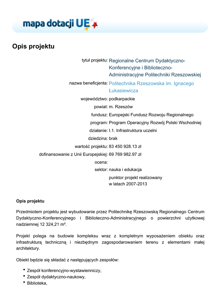 Opis projektu tytuł projektu: Regionalne Centrum Dydaktyczno- Konferencyjne i BibliotecznoAdministracyjne Politechniki Rzeszowskiej nazwa beneficjenta: Politechnika Rzeszowska im. Ignacego Łukasiewicza województwo: podkarpackie powiat: m. Rzeszów fundusz: Europejski Fundusz Rozwoju Regionalnego program: Program Operacyjny Rozwój Polski Wschodniej działanie: I.1. Infrastruktura uczelni dziedzina: brak wartość projektu: 83 450 928.13 zł dofinansowanie z Unii Europejskiej: 69 769 982.97 zł ocena: sektor: nauka i edukacja punktor projekt realizowany w latach 2007-2013 Opis projektu Przedmiotem projektu jest wybudowanie przez Politechnikę Rzeszowską Regionalnego Centrum Dydaktyczno-Konferencyjnego i Biblioteczno-Administracyjnego o powierzchni użytkowej nadziemnej 12 324,21 m². Projekt polega na budowie kompleksu wraz z kompletnym wyposażeniem obiektu oraz infrastrukturą techniczną i niezbędnym zagospodarowaniem terenu z elementami małej architektury. Obiekt będzie się składać z następujących zespołów: Zespół konferencyjno-wystawienniczy, Zespół dydaktyczno-naukowy, Biblioteka, Część administracyjno-biurowa. Zgodnie z projektem budynek ma czytelny układ funkcjonalny, w którym wszystkie podstawowe funkcje dostępne są z głównego hallu ጀ pasażu. Zapewniono odrębne wejścia z wewnętrznego pasażu do każdej części budynku stanowiącej wydzielony zespół pomieszczeń. Część dydaktyczna: Po lewej stronie od wejścia głównego zlokalizowano kompleks dydaktyczny z amfiteatralną aulą dla 400 studentów, z dużą sceną i stosownym zapleczem. Aula przystosowana jest również do pełnienia funkcji konferencyjnych, organizacji kongresów naukowych itp. W części dydaktycznej znajduje się również sala dla 220 osób (także mająca układ amfiteatralny) oraz dwie mniejsze sale dla 170 i 150 osób, mogące stanowić po rozsunięciu składanej ściany, jedną salę do celów ekspozycyjnych. Nad salą dla 220 osób przewidziano trzy sale o charakterze pracowni, każda dla 49 osób. W sąsiedztwie auli na dwóch kondygnacjach będą zespoły sal w układzie amfiladowym, które po zsunięciu dzielących je ścian składanych mogą stanowić przestrzenie ekspozycyjne. Na parterze znajdą się pomieszczenia przeznaczone na laboratoria. Na I piętrze pomieszczenia dla Laboratorium Zastosowania Czujników Światłowodowych w Nauce i Technice oraz pokoje laboratoryjne dla kierunku Architektura i Urbanistyka. II piętro w całości zostanie przeznaczone dla Architektury i Urbanistyki. Od strony południowej przewidziano dwie kondygnacje o charakterze dydaktyczno-biurowym, wydzielone funkcjonalnie od pozostałych pomieszczeń. Mogą one pełnić dodatkowo funkcje związane z informacją patentową, normalizacyjną lub gromadzeniem zbiorów elektronicznych. Część biblioteczna: Biblioteka, będąca częścią projektowanego obiektu, pełnić będzie funkcję regionalnej biblioteki technicznej, środowiskowej województwa podkarpackiego o ukierunkowaniu naukowotechnicznym, zwłaszcza lotniczym. Część administracyjna: W centralnej części pasażu zlokalizowano główną klatkę schodową, prowadzącą do części administracyjnej górującej nad kompleksem budynków. W tej części, na dwóch kondygnacjach (III i IV piętro) znajdują się pomieszczenia rektoratu, sala dydaktyczna przystosowana do obrony prac doktorskich – wykorzystywana w czasie wolnym od zajęć przez Senat Uczelni. Funkcje towarzyszące: W podpiwniczeniu obiektu zaprojektowano pomieszczenia techniczne związane z eksploatacją budynku. Pod pomieszczeniem pasażu i biblioteką przewidziano parking podziemny dla 100 samochodów, który ma częściowo zadaszony wjazd prowadzący z drogi okalającej budynek. Cel i planowane rezultaty Utworzenie i wyposażenie obiektu w nowoczesną aparaturę badawczo-naukową służącą zarówno do celów dydaktycznych, jak i do badań umożliwi podniesienie jakości kształcenia na Uczelni i pozyskanie wykwalifikowanej kadry atrakcyjnej dla przedsiębiorstw, odpowiadającej na potrzeby gospodarki i rynku pracy oraz w przyszłości umożliwi wprowadzenie nowych kierunków nauczania, rozszerzenie praktyk studenckich, staży absolwenckich i otrzymanie gwarancji zatrudnienia ze strony przemysłu. Realizacja uskuteczni tym samym transfer wiedzy, pomiędzy nauką a przemysłem. Ze względu na charakter kształcenia na Politechnice Rzeszowskiej są to przede wszystkim kierunki kształcenia i badań o charakterze priorytetowym dla gospodarki. Zaangażowanie podmiotów gospodarczych i innych jednostek zainteresowanych korzystaniem z wyników badań, które Politechnika Rzeszowska będzie nieodpłatnie udostępniać i rozpowszechniać na organizowanych konferencjach i sympozjach również ma na celu transfer wiedzy do przemysłu. Transfer ten będzie przebiegał również w drugą stronę. Dzięki nawiązaniu ściślejszej współpracy z zainteresowanymi podmiotami Uczelnia na bieżąco będzie mogła reagować na potrzeby przedsiębiorstw zarówno w zakresie prowadzonych badań, jak i zapotrzebowania na rynku pracy. Kto skorzysta dzięki projektowi Studenci – środowisko akademickie, pracownicy Politechniki Rzeszowskiej, region Podkarpacia. Źródło zdjęć: Skanska SA