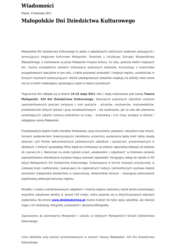 Wiadomości Piątek, 15 kwietnia 2011 Małopolskie Dni Dziedzictwa Kulturowego Małopolskie Dni Dziedzictwa Kulturowego to jedno z największych cyklicznych wydarzeń ukazujących i promujących bogactwo kulturowe Małopolski. Powstały z inicjatywy Zarządu Województwa Małopolskiego, a realizowane są przez Małopolski Instytut Kultury. Co roku, podczas dwóch majowych dni, można nieodpłatnie zwiedzić kilkanaście wybranych obiektów, korzystając z materiałów przygotowanych specjalnie w tym celu, a także poznawać przeszłość i tradycje regionu, uczestnicząc w licznych imprezach towarzyszących. Wśród udostępnianych zabytków znajdują się obiekty mało znane lub na co dzień niedostępne, pozostające często w rękach prywatnych. Tegoroczne Dni odbędą się w dniach 14-15 maja 2011 roku i będą realizowana pod nazwą Twarze Małopolski. XIII Dni Dziedzictwa Kulturowego. Dwanaście wybranych zabytków zostanie zaprezentowanych poprzez związane z nimi postacie – artystów, naukowców, możnowładców, przedstawicieli różnych stanów i grup narodowościowych – lub wydarzenia. Jak co roku dla ułatwienia zwiedzających zabytki zostaną podzielone na trasy – krakowską i trzy trasy wiodące w bliższe i odleglejsze rejony Małopolski. Przedsięwzięcie będzie miało charakter festiwalowy, poza koncertami, pokazami, odczytami oraz innymi, licznymi wydarzeniami towarzyszącymi zwiedzaniu uczestnicy wydarzenia będą mieli także okazję obejrzeć cykl filmów dokumentalnych poświęconych zabytkom i postaciom, prezentowanych w obiektach, o których opowiadają (filmy będą też emitowane na antenie regionalnej telewizji od kwietnia do czerwca br.). Natomiast na około tydzień przed „weekendem z zabytkami” w Krakowie zostanie zaprezentowana interaktywna wystawa mająca stanowić zapowiedź i intrygujący wstęp do udziału w XIII edycji Małopolskich Dni Dziedzictwa Kulturowego. Zrealizowana w formie instalacji artystycznej, w ciekawej bryle rzeźbiarskiej, nawiązująca do regionalnych tradycji rzemieślniczych wystawa będzie promować małopolskie dziedzictwo w nowoczesnej, dizajnerskiej formule – ukazującej jednocześnie współczesny potencjał kulturowy regionu. Ponadto z myślą o zainteresowanych zabytkami i historią regionu stworzony został serwis prezentujący wszystkie zabytkowe obiekty tj. ponad 150 miejsc, które pojawiły się w dotychczasowych edycjach wydarzenia. Na stronie www.dnidziedzictwa.pl można znaleźć nie tylko opisy zabytków, ale również mapy z ich lokalizacją, fotografie, przewodniki i obszerną bibliografię. Zapraszamy do poznawania Małopolski i udziału w kolejnych Małopolskich Dniach Dziedzictwa Kulturowego. Lista obiektów oraz postaci prezentowanych w ramach Twarzy Małopolski. XIII Dni Dziedzictwa Kulturowego: TRASA I: KRAKOWSKA • Kolegiata pw. św. Anny o Józef Tischner • Kino „Kijów” (obecnie KIJÓW.CENTRUM) o Krakowski Festiwal Filmowy • Regionalne Muzeum Młodej Polski „Rydlówka" Oddział Krakowskiego PTTK o Lucjan Rydel TRASA II: OKOLICE OLKUSZA • Poliptyk olkuski – Bazylika Kolegiacka pw. św. Andrzeja w Olkuszu (gmina Olkusz) o Jan Wielki • Pustynia Błędowska (Klucze, gmina Klucze) o Pan Twardowski • Rezerwat Przyrody Dolina Racławki (gmina Krzeszowice) o Stanisław Pagaczewski TRASA III: OKOLICE OŚWIĘCIMIA • Zamek w Oświęcimiu (gmina Oświęcim) o Eufrozyna – księżna oświęcimska • Muzeum im. Aleksandra Kłosińskiego w Kętach (gmina Kęty) o Aleksander Kłosiński • Dwór w Ryczowie (gmina Spytkowice) o gen. Zygmunt Piasecki TRASA IV: POŁUDNIOWA • Klasztor ss. Klarysek w Starym Sączu (gmina Stary Sącz) o św. Kinga • Sanatorium „Patria” w Krynicy-Zdroju (gmina Krynica-Zdrój) o Jan Kiepura • Cerkiew pw. św. Jakuba Młodszego w Powroźniku (gmina Muszyna) o Jan Peregryn