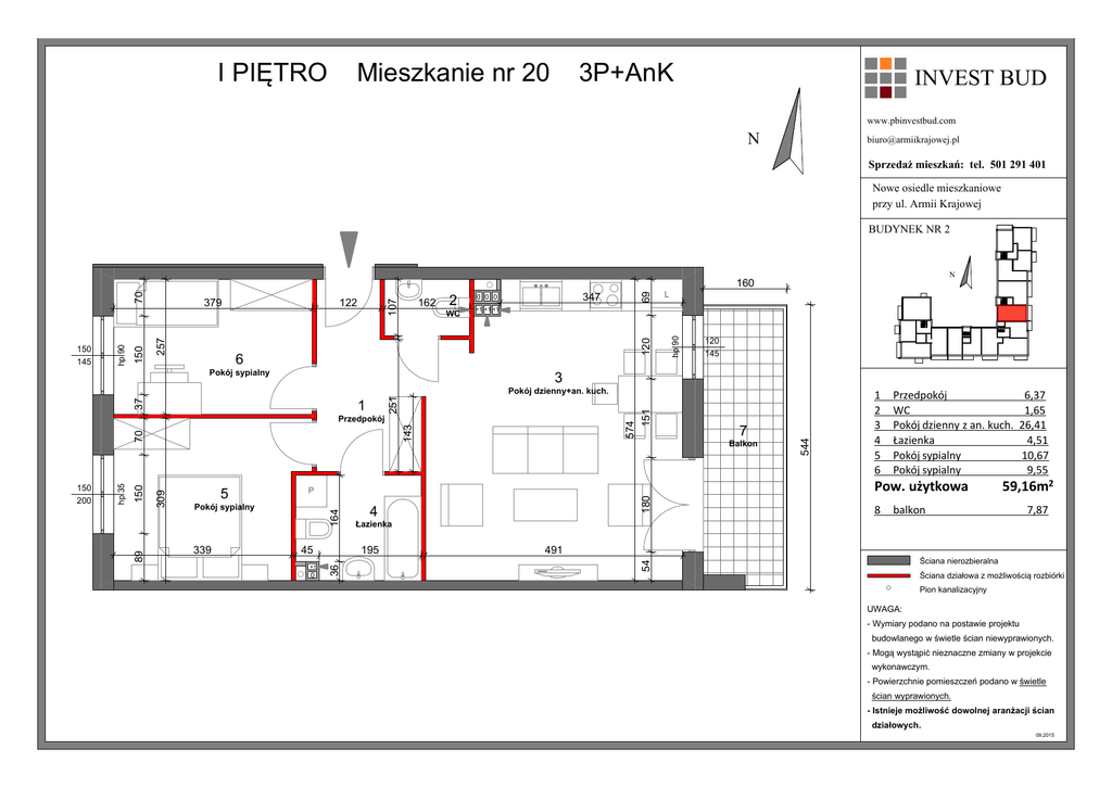 I PIĘTRO Mieszkanie nr 20 3P+AnK INVEST BUD www.pbinvestbud.com N [email protected] Sprzedaż mieszkań: tel. 501 291 401 Nowe osiedle mieszkaniowe przy ul. Armii Krajowej BUDYNEK NR 2 N 2 347 0 0 0 6 Pokój sypialny L +1 +1 +1 120 WC hp 90 162 69 122 107 379 257 150 150 145 hp 90 70 160 120 145 3 339 0 180 164 45 +1 544 Przedpokój WC Pokój dzienny z an. kuch. Łazienka Pokój sypialny Pokój sypialny Pow. użytkowa P Pokój sypialny 7 Balkon 1 2 3 4 5 6 4 8 6,37 1,65 26,41 4,51 10,67 9,55 59,16m2 balkon 7,87 Łazienka 195 491 Ściana nierozbieralna 54 5 36 309 150 89 150 200 hp 35 70 143 Przedpokój 574 151 37 1 251 Pokój dzienny+an. kuch. Ściana działowa z możliwością rozbiórki Pion kanalizacyjny UWAGA: - Wymiary podano na postawie projektu budowlanego w świetle ścian niewyprawionych. - Mogą wystąpić nieznaczne zmiany w projekcie wykonawczym. - Powierzchnie pomieszczeń podano w świetle ścian wyprawionych. - Istnieje możliwość dowolnej aranżacji ścian działowych. 09,2015