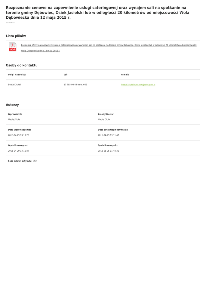 Rozpoznanie cenowe na zapewnienie usługi cateringowej oraz wynajem sali na spotkanie na terenie gminy Dębowiec, Osiek Jasielski lub w odległości 20 kilometrów od miejscowości Wola Dębowiecka dnia 12 maja 2015 r. 2015-04-29 Lista plików Formularz oferty na zapewnienie usługi cateringowej oraz wynajem sali na spotkanie na terenie gminy Dębowiec, Osiek Jasielski lub w odległości 20 kilometrów od miejscowości Wola Dębowiecka dnia 12 maja 2015 r. Osoby do kontaktu Imię i nazwisko: tel.: e-mail: Beata Knutel 17 785 00 44 wew. 666 [email protected] Autorzy Wprowadził: Zmodyfikował: Maciej Ciuła Maciej Ciuła Data wprowadzenia: Data ostatniej modyfikacji: 2015-04-29 13:10:28 2015-04-29 13:11:47 Opublikowany od: Opublikowany do: 2015-04-29 13:11:47 2016-08-25 11:48:31 Ilość odsłon artykułu: 392