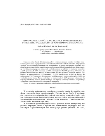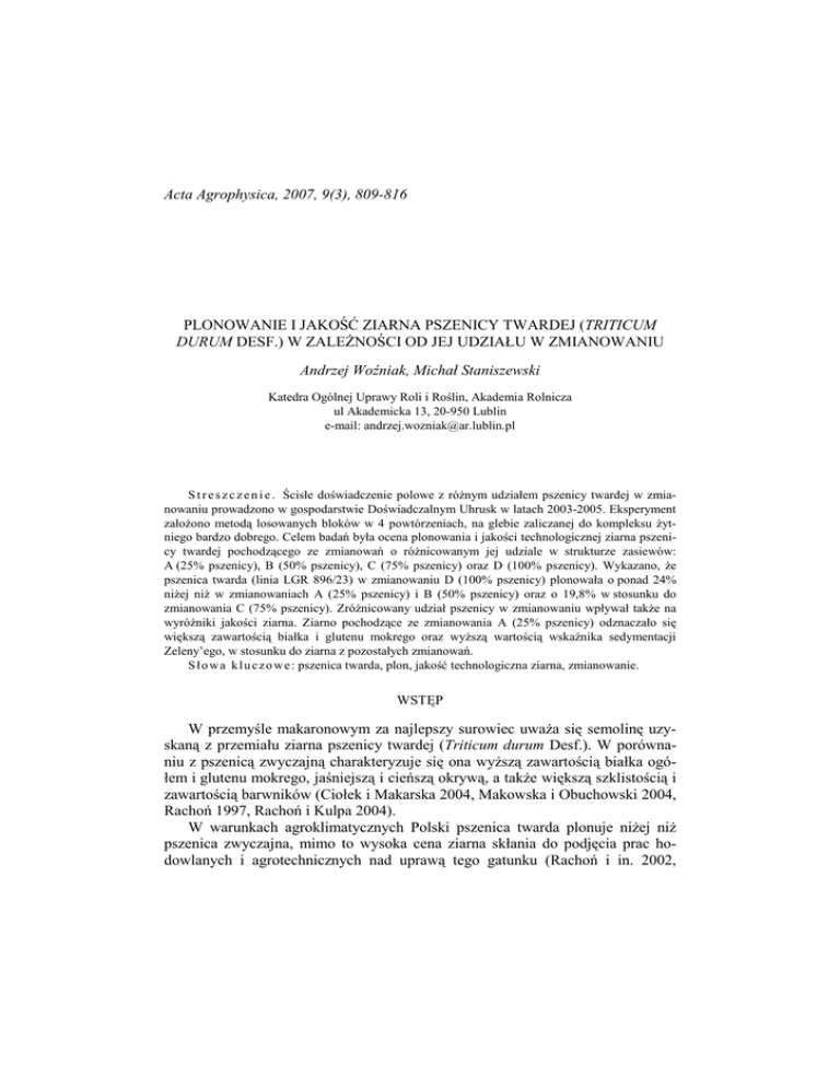 Acta Agrophysica, 2007, 9(3), 809-816 PLONOWANIE I JAKOŚĆ ZIARNA PSZENICY TWARDEJ (TRITICUM DURUM DESF.) W ZALEśNOŚCI OD JEJ UDZIAŁU W ZMIANOWANIU Andrzej Woźniak, Michał Staniszewski Katedra Ogólnej Uprawy Roli i Roślin, Akademia Rolnicza ul Akademicka 13, 20-950 Lublin e-mail: [email protected] S t r e s z c z e n i e . Ścisłe doświadczenie polowe z róŜnym udziałem pszenicy twardej w zmianowaniu prowadzono w gospodarstwie Doświadczalnym Uhrusk w latach 2003-2005. Eksperyment załoŜono metodą losowanych bloków w 4 powtórzeniach, na glebie zaliczanej do kompleksu Ŝytniego bardzo dobrego. Celem badań była ocena plonowania i jakości technologicznej ziarna pszenicy twardej pochodzącego ze zmianowań o róŜnicowanym jej udziale w strukturze zasiewów: A (25% pszenicy), B (50% pszenicy), C (75% pszenicy) oraz D (100% pszenicy). Wykazano, Ŝe pszenica twarda (linia LGR 896/23) w zmianowaniu D (100% pszenicy) plonowała o ponad 24% niŜej niŜ w zmianowaniach A (25% pszenicy) i B (50% pszenicy) oraz o 19,8% w stosunku do zmianowania C (75% pszenicy). ZróŜnicowany udział pszenicy w zmianowaniu wpływał takŜe na wyróŜniki jakości ziarna. Ziarno pochodzące ze zmianowania A (25% pszenicy) odznaczało się większą zawartością białka i glutenu mokrego oraz wyŜszą wartością wskaźnika sedymentacji Zeleny’ego, w stosunku do ziarna z pozostałych zmianowań. S ł o wa k l u c z o w e : pszenica twarda, plon, jakość technologiczna ziarna, zmianowanie. WSTĘP W przemyśle makaronowym za najlepszy surowiec uwaŜa się semolinę uzyskaną z przemiału ziarna pszenicy twardej (Triticum durum Desf.). W porównaniu z pszenicą zwyczajną charakteryzuje się ona wyŜszą zawartością białka ogółem i glutenu mokrego, jaśniejszą i cieńszą okrywą, a takŜe większą szklistością i zawartością barwników (Ciołek i Makarska 2004, Makowska i Obuchowski 2004, Rachoń 1997, Rachoń i Kulpa 2004). W warunkach agroklimatycznych Polski pszenica twarda plonuje niŜej niŜ pszenica zwyczajna, mimo to wysoka cena ziarna skłania do podjęcia prac hodowlanych i agrotechnicznych nad uprawą tego gatunku (Rachoń i in. 2002, 810 A. WOŹNIAK, M. STANISZEWSKI Szwed-Urbaś i Segit 2004). Przemawia za tym równieŜ jakość ziarna, która jest odpowiednia dla przemysłu makaronowego i porównywalna z odmianami importowanymi (Rachoń 1997). Plon i jakość technologiczna ziarna pszenicy zaleŜą od właściwości genetycznych, elementów siedliska oraz stosowanych zabiegów agrotechnicznych (Borkowska i in. 2002, Szwed-Urbaś i Segit 2004, Woźniak 2003, Woźniak 2005). Z czynników agrotechnicznych szczególną rolę przypisuje się nawoŜeniu azotem, które bezpośrednio wpływa na ilość białka i glutenu mokrego w ziarnie oraz wskaźnik sedymentacyjny Zeleny’ego (Borkowska i in. 2002, Ciołek i Makarska 2004, Rachoń i in. 2002, Woźniak 2006). Z badań Gontarza (2006) oraz Woźniaka (2003, 2005) wynika, Ŝe na wartość wyróŜników jakości ziarna pszenicy duŜy wpływ ma równieŜ przedplon, a takŜe udział pszenicy w strukturze płodozmianu. Celem prowadzonych badań była ocena wpływu zróŜnicowanego udziału pszenicy twardej (linii LGR 896/23 wyselekcjonowanej w Instytucie Genetyki i Hodowli Roślin AR w Lublinie) w zmianowaniu na plon ziarna i jego jakość technologiczną. MATERIAŁ I METODY W latach 2003-005, w ścisłym doświadczeniu polowym prowadzonym w Gospodarstwie Doświadczalnym Uhrusk, badano wpływ udziału pszenicy twardej w zmianowaniu na plon i jakość technologiczną ziarna. Gleba pod doświadczeniem była rędziną mieszaną o składzie granulometrycznym gliny lekkiej słabo spiaszczonej, zaliczoną do kompleksu Ŝytniego bardzo dobrego. Doświadczenie prowadzono metodą losowanych bloków, w 4 powtórzeniach, o powierzchni poletek do zbioru 10 m2. Czynnikiem doświadczenia były zmianowania z róŜnym udziałem pszenicy twardej: A – 25% pszenicy twardej (ziemniak – owies siewny – groch siewny – pszenica), B – 50% pszenicy twardej (ziemniak – pszenica – groch siewny – pszenica), C – 75% pszenicy twardej (ziemniak – pszenica – pszenica – pszenica) D – 100% pszenicy twardej (monokultura). Uprawa roli pod pszenicę twardą była typowa dla systemu płuŜnego. Siew pszenicy twardej (linia LGR 896/23) przeprowadzono w kaŜdym roku w pierwszej dekadzie kwietnia, gęstość siewu wynosiła 450 nasion na 1 m2. Nawozy fosforowe (34,0 kg P·ha-1) i potasowe (83,0 kg K·ha-1) stosowano jesienią przed wykonaniem orki przedzimowej. NawoŜenie azotem pszenicy twardej wynosiło 140 kg·ha-1 i przeprowadzano je w trzech terminach: przed siewem (60 kg·ha-1), w fazie strzelania w źdźbło (40 kg·ha-1) oraz w fazie kłoszenia (40 kg·ha-1). Zabiegi pielęgnacyjne polegały na chemicznym niszczeniu chwastów oraz chemicznej ochronie przed chorobami, szkodnikami i wy- PLONOWANIE I JAKOŚĆ ZIARNA PSZENICY TWARDEJ 811 leganiem. Do niszczenia chwastów uŜyto herbicydów Puma Super 069 EW i Aminopielik M 450 (1+3 l·ha-1) w fazie krzewienia pszenicy. Do ochrony przed wyleganiem zastosowano na początku strzelania w źdźbło Cycocel 460 SL w ilości 1,5 l·ha-1. Przeciw chorobom podsuszkowym wykorzystano Alert 375 SC – 1,0 l·ha-1, zaś przeciw chorobom liści i kłosa, w fazie kłoszenia Tilt CB 37,5 WP – 1 kg·ha-1. Oceniano cechy wynikowe: plon ziarna i elementy jego struktury, wyróŜniki jakości: zawartość białka ogółem i glutenu mokrego (%), wskaźnik sedymentacyjny Zeleny’ego (ml), wyrównanie ziarna (%), gęstość ziarna kg⋅hl-1), liczbę opadania (s) oraz zawartość popiołu całkowitego (%). Oznaczenie zawartości białka, glutenu oraz wskaźnik sedymentacji wykonano metodą NIR (bliskiej podczerwieni) na urządzeniu Inframatic 8100, gęstość ziarna zgodnie z normą PN73R-74007, wyrównanie ziarna BN-69/9131-02, liczbę opadania PN-ISO3093, natomiast popiół całkowity PN-76R-64795. Uzyskane wyniki op