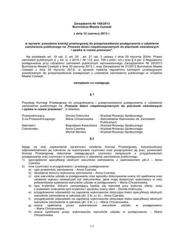 Zarządzenie Nr 168/2013 Burmistrza Miasta Czeladź z dnia 12 czerwca 2013 r. w sprawie: powołania komisji przetargowej do przeprowadzenia postępowania o udzielenie zamówienia publicznego na „Przewóz dzieci niepełnosprawnych do placówek oświatowych i opieka w czasie przewozu”. Na podstawie art. 19 ust. 2, art. 20 , art. 21 ust. 3 ustawy z dnia 29 stycznia 2004r. Prawo zamówień publicznych (t. j. Dz. U. z 2010 r. Nr 113, poz. 759 z późn. zm.) oraz § 4 pkt. 2 Regulaminu postępowania przy udzielaniu zamówień publicznych wprowadzonego Zarządzeniem Nr 20/2013 Burmistrza Miasta Czeladź z dnia 30 stycznia 2013 r. oraz Zarządzenia Nr 21/2013 Burmistrza Miasta Czeladź z dnia 30 stycznia 2013r. w sprawie nadania regulaminu komisjom przetargowym powoływanym do przeprowadzania postępowań o udzielenie zamówienia publicznego w Urzędzie Miasta Czeladź. zarządzam co następuje: §1 Powołuję Komisję Przetargową do przygotowania i przeprowadzenia postępowania o udzielenie zamówienia publicznego na „Przewóz dzieci niepełnosprawnych do placówek oświatowych i opieka w czasie przewozu”. w składzie: Przewodniczący: Z-ca Przewodniczącego: Sekretarz: Członkowie: Dorota Dobrucka Maria Chrzanowska - Wydział Rozwoju Społecznego - Samodzielne Stanowisko ds. Zamówień Publicznych Bogusława Karecińska - Wydział Rozwoju Społecznego Anna Czerska - Wydział Rozwoju Społecznego Michał Słomka - Wydział Rozwoju Społecznego §2 Mając na celu zapewnienie sprawności działania Komisji Przetargowej, indywidualizacji odpowiedzialności jej członków za wykonywane czynności oraz przejrzystości jej prac, powierzam Komisji Przetargowej dokonanie następujących czynności związanych z przygotowaniem postępowania oraz czynności w postępowaniu o udzielenie zamówienia publicznego: 1) sporządzenie specyfikacji istotnych warunków zamówienia, z zastrzeżeniem pkt.2 – Anna Czerska 2) inne czynności w przygotowaniu i przebiegu postępowania : a) opis przedmiotu zamówienia - Anna Czerska b) określenie terminu wykonania zamówienia – Anna Czerska c) opis warunków udziału w postępowaniu oraz sposobu dokonywania oceny ich spełniania oraz ustalenie wykazu oświadczeń lub dokumentów, jakie mają dostarczyć wykonawcy w celu potwierdzenia spełniania warunków udziału w postępowaniu – Maria Chrzanowska, d) opis kryteriów, którymi zamawiający będzie się kierował przy wyborze oferty, wraz z podaniem znaczenia tych kryteriów i sposobu oceny ofert – Dorota Dobrucka, e) przygotowanie odpowiedzi na zapytania wykonawców dotyczące treści specyfikacji istotnych warunków zamówienia w zakresie pkt. 2 lit. a i b) – Anna Czerska, f) przygotowanie odpowiedzi na zapytania wykonawców dotyczące treści specyfikacji istotnych warunków zamówienia w zakresie pkt. 2 lit. c ) – Maria Chrzanowska, g) ocena spełniania przez wykonawców warunków udziału w postępowaniu – Maria Chrzanowska, h) ocena spełniania przez wykonawców warunków udziału w postępowaniu – Maria Chrzanowska, 1/2 3) i) badanie ofert i ocena ofert – wszyscy członkowie Komisji Przetargowej, prowadzenie protokołu postępowania – Bogusława Karecińska. §3 W sprawach nieuregulowanych w niniejszym zarządzeniu mają zastosowanie przepisy: 1) ustawy z dnia 29 stycznia 2004 r. – Prawo zamówień publicznych (t.j. Dz.U. z 2010 r. Nr 113, poz. 759 z późn. zm.) 2) Regulaminu postępowania przy udzielaniu zamówień publicznych wprowadzonego Zarządzeniem Nr 20/2013 Burmistrza Miasta Czeladź z dnia 30 stycznia 2013 r. 3) Regulaminu pracy komisji przetargowych powoływanych do przeprowadzania postępowań o udzielenie zamówienia publicznego w Urzędzie Miasta Czeladź wprowadzonego Zarządzeniem Nr 21/2013 Burmistrza Miasta Czeladź z dnia 30 stycznia 2013 r. §4 Zobowiązuję Komisję do sporządzenia protokołu z przebiegu postępowania i przedstawienia go do zatwierdzenia Burmistrzowi Miasta Czeladź. §5 Wykonanie zarządzenia powierzam Kierownikowi Wydziału Rozwoju Społecznego. §6 Zarządzenie wchodzi w życie z dniem podpisania. BURMSITRZ mgr Teresa Kosmala 2/2