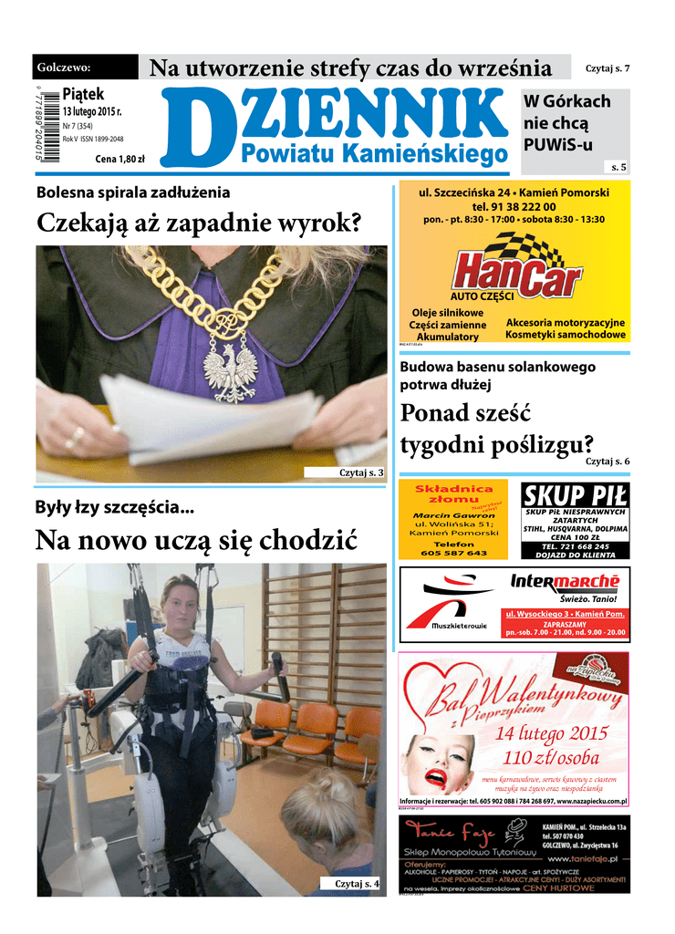Golczewo: Piątek Na utworzenie strefy czas do września Czytaj s. 7 W Górkach nie chcą PUWiS-u 13 lutego 2015 r. Nr 7 (354) Rok V ISSN 1899-2048 Cena 1,80 zł s. 5 Bolesna spirala zadłużenia Czekają aż zapadnie wyrok? ul. Szczecińska 24 • Kamień Pomorski tel. 91 38 222 00 pon. - pt. 8:30 - 17:00 • sobota 8:30 - 13:30 AUTO CZĘŚCI Oleje silnikowe Akcesoria motoryzacyjne Części zamienne Kosmetyki samochodowe Akumulatory W42.4.P.7.03.d/o Budowa basenu solankowego potrwa dłużej Ponad sześć tygodni poślizgu? Czytaj s. 6 Czytaj s. 3 Składnica złomu yższe Były łzy szczęścia... ! Najw ceny Na nowo uczą się chodzić Marcin Gawron ul. Wolińska 51; Kamień Pomorski Telefon 605 587 643 Świeżo. Tanio! 2015 r. ul. Wysockiego 3 • Kamień Pom. ZAPRASZAMY pn.-sob. 7.00 - 21.00, nd. 9.00 - 20.00 14 lutego 2015 110 zł/osoba menu karnawałowe, serwis kawowy z ciastem muzyka na żywo oraz niespodzianka Informacje i rezerwacje: tel. 605 902 088 i 784 268 697, www.nazapiecku.com.pl W258 4 P 06-27.02 Czytaj s. 4 W43.2.P.07.03.d/o 2 Nr 6 (354) Ujęcia z Powiatu NASZA SONDA Zasadnicza służba wojskowa w Polsce została zlikwidowana w 2008 r. Od tamtej pory trwają zagorzałe dyskusje na temat tego, czy obowiązek pełnienia tej służby powinien powrócić czy też lepiej decyzję o poddaniu się szkoleniu wojskowemu pozostawić każdemu z osobna. Tym razem, w ramach cotygodniowej sondy ulicznej, zapytaliśmy naszych respondentów, jakie jest ich zdanie na ten temat. Pani Bożena: Moim zdaniem, obowiązek służby wojskowej powinien powrócić. Powiem tak – kiedyś chłop to był chłop. Jak wyszedł z wojska, to chociaż coś tam potrafił. A teraz? Co któryś to ciamajda. Nie twierdzę oczywiście, że odbywanie takiej służby powinno trwać nie wiadomo ile czasu, bo 3 czy 2 lata to może rzeczywiście za dużo. No ale 9 miesięcy szkolenia byłoby jak najbardziej wskazane. Wojsko uczy, i nie mam na myśli tylko i wyłącznie dyscypliny. We wtorek, 10 lutego, w starostwie powiatowym obradowała Powiatowa Rada Kombatantów. Celem spotkania było ustalenie obchodów 70-lecia polskości w Kamieniu Pomorskim. Pierwszym punktem będzie Msza św. upamiętniająca 75 rocznicy wywózki Polaków z Kresów Wschodnich na Sybir. Msza odbędzie się w niedzielę, 15 lutego, o godz. 10, w kamieńskiej katedrze. Dopiero połowa lutego, a w Kamieniu Pomorskim, przy ul. Dworcowej, vis à vis stacji PKS, zakwitły przebiśniegi. Te urocze kwiaty, rozpoznawalne jako symbol przedwiośnia, pojawiają się zazwyczaj dopiero na początku marca. Niemniej przy ciepłej zimie, a taką w tym roku mieliśmy, mogą dać o sobie znać dużo wcześniej. To znak, że wiosna już tuż, tuż. W Jarszewie mają dwa place zabaw. W Miłachowie na razie ani jednego. W sprawie przeniesienia placu sołectwa są już dogadane. Jednak, aby sfinalizować operację, potrzebna jest pomoc urzędu. Czy prace uda się przeprowadzić już tej wiosny? Ukazuje się w każdy piątek na terenie powiatu kamieńskiego Adres redakcji: ul. Spółdzielcza 1, pok. nr 5, 72-400 Kamień Pomorski dyżur we wtorek w godz. 10.00-15.30 Przemysław Saja - redaktor naczelny, 692 153 166; 501 294 118 Karolina Klonowska - dziennikarz Karolina Anna Sałaga - redaktor techniczny, Wioletta Dziedzic - reklama, Jerzy Salwa - kolportaż e-mail: [email protected]; Wydawnictwo, skład i druk „Dom Judy” Sp. z o.o., 72-200 Nowogard, ul. Boh. Warszawy 7a. Redakcja nie odpowiada za treść reklam i ogłoszeń, zastrzega sobie prawo adiustacji tekstów. Pan Andrzej: Musiałaby pani porozmawiać przede wszystkim z młodymi, którzy powinni iść do wojska. Myślę, że oni mieliby w tym temacie dużo więcej do powiedzenia. Ja byłem w wojsku ponad 30 lat temu. Wtedy służba była obowiązkowa. Wydaje mi się, że teraz wojsko jest lepiej usprzętowiono niż dawniej. A mimo wszystko nie każdy musi odbyć taką służbę. Jestem ciekaw, jakie zdanie na ten temat mają chłopcy w wieku 18 i 19 lat. Trudno mi się wypowiadać w tej kwestii, ale myślę, że gdyby przyszło co do czego, to w razie zagrożenia byłoby ciężko, ponieważ jak młodzi ludzie nie zaznają, co to wojsko, mogliby sobie nie poradzić. Tak że mówię – to ma swoje plusy i minusy. Pani Maria: Trudno mi cokolwiek powiedzieć, ponieważ mnie ten temat nigdy bezpośrednio nie dotyczył. Niemniej myślę, że gdyby żaden młody chłopak nie chciał pójść do wojska, byłoby bardzo niedobrze. Jakaś służba wojskowa w kraju musi istnieć. Z drugiej strony wydaje mi się, że nikt nie chciałby, by siłą wciągano go do wojska, tak jak to było kiedyś, gdy służba była obowiązkowa. Teraz wielu, którzy decydują się na wojsko, robi to dla pieniędzy, a nie z zamiłowania. Mimo wszystko jednak uważam, że dobrze by było, aby obowiązek służby powrócił. Może nie powinna ona trwać 2 lat, ale kilka miesięcy owszem. Pani Ewa z wnuczką Hanią: Według mnie, powinno być tak, że facet musi być facetem, a nie odbębni trzy miesiące służby wojskowej i zadowolony z siebie. Dawniej to było tak, że mężczyzna przebywał w wojsku 2 lata, nie miał innego wyjścia. Wtedy chłopak przynajmniej wiedział, co to dyscyplina. A teraz? Lepiej przesiadywać na ulicach, pić i używać sobie wszystkiego po trochu. No i rozrabiać – to najchętniej robiłaby dzisiejsza młodzież. Kiedyś tego nie było. Podsumowując, moim zdaniem, obowiązek służby wojskowej powinien powrócić. Pan Waldemar: Oczywiście, że wojsko powinno być obowiązkowe. Może głupoty by się nie trzymały tych małolatów. Jakby im w wojsku kota popędzili za każdym razem, gdy zachciałoby im się rozrabiać, to by się od razu oduczyli. Tam dowiedzieliby się, co to życie i dyscyplina. Teraz tylko szaleją po ulicach, nic więcej. Nie mówię oczywiście, że taka służba powinna trwać długo, np. 2 lata, tak jak to było kiedyś, ale rok przeszkolenia takim młodym chłopakom na pewno by 