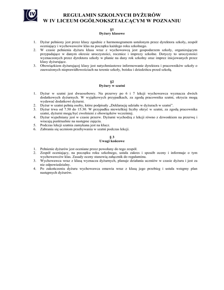 REGULAMIN SZKOLNYCH DYśURÓW W IV LICEUM OGÓŁNOKSZTAŁCĄCYM W POZNANIU §1 DyŜury klasowe 1. 2. 3. DyŜur pełniony jest przez klasy zgodnie z harmonogramem ustalonym przez dyrektora szkoły, zespół oceniający i wychowawców klas na początku kaŜdego roku szkolnego. W czasie pełnienia dyŜuru klasa wraz z wychowawcą jest gospodarzem szkoły, organizującym przypadające w danym okresie uroczystości, rocznice i imprezy szkolne. Dotyczy to uroczystości wyznaczonych przez dyrektora szkoły w planie na dany rok szkolny oraz imprez inicjowanych przez klasy dyŜurujące. Obowiązkiem dyŜurującej klasy jest natychmiastowe informowanie dyrektora i pracowników szkoły o zauwaŜonych nieprawidłowościach na terenie szkoły, boisku i dziedzińcu przed szkołą. §2 DyŜury w szatni 1. 2. 3. 4. 5. 6. DyŜur w szatni jest dwuosobowy. Na przerwy po 6 i 7 lekcji wychowawca wyznacza dwóch dodatkowych dyŜurnych. W wyjątkowych przypadkach, za zgodą pracownika szatni, okrycia mogą wydawać dodatkowi dyŜurni. DyŜur w szatni pełnią osoby, które podpisały „Deklarację udziału w dyŜurach w szatni”. DyŜur trwa od 7.50 do 15.30. W przypadku niewielkiej liczby okryć w szatni, za zgodą pracownika szatni, dyŜurni mogą być zwolnieni z obowiązków wcześniej. DyŜur wypełniany jest w czasie przerw. DyŜurni wychodzą z lekcji równo z dzwonkiem na przerwę i wracają punktualnie na następne zajęcia. Podczas lekcji szatnia zamykana jest na klucz. Zabrania się uczniom przebywania w szatni podczas lekcji. §3 Uwagi końcowe 1. 2. 3. 4. Pełnienie dyŜurów jest oceniane przez powołany do tego zespół. Zespół oceniający, na początku roku szkolnego, ustala zakres i sposób oceny i informuje o tym wychowawców klas. Zasady oceny stanowią załącznik do regulaminu. Wychowawca wraz z klasą wyznacza dyŜurnych, planuje działania uczniów w czasie dyŜuru i jest za nie odpowiedzialny. Po zakończeniu dyŜuru wychowawca omawia wraz z klasą jego przebieg i ustala wstępny plan następnych dyŜurów. Zał. 1. Terminy dyŜurów klas w roku szkolnym 2015/ 2016 Lp. Klasa 1 IA Termin dyŜuru 02-06.11.2015 25-29.04.2016 01-05.02.2016 2 IB 04-08.04.2016 3 IC 09-13.05.2016 13- 17.06 2016 4 ID 23-27.11.2015 29.02-04.03.2016 5 IE 21.03-01.04.2016 23.05-03.06.2016 6 IF 16-20.11.2015 20- 24.06 2016 09-13.11.2015 7 IG 16-20.05.2016 8 IIA 21.12.2015-08.01.2016 22-26.02.2016 07-11.12.2015 9 IIB 06-10.06.2016 10 IIC 26-30.10.2015 18.04-22.04.2016 08-12.02.2016 11 IID 14-18.03.2016 30.11-04.12.2015 12 IIE 11-15.01.2016 14-18.12.2015 13 IIF 11-15.04.2016 15-19.02.2016 14 IIG 07-11.03.2016 Punkty Suma Miejsce Zał. 2. Ocena dyŜurów klasowych Przekazywanie komunikatów klasa ……… termin ……………………………… Wystawy tematyczne w holu Organiz acja imprez Porządek w trakcie dyżuru Suma pkt Skala ocen: 0 – 5 pkt Ocena dyŜurujących w szatni Dzień Punktualność klasa ……… termin …………………………….. Kultura osobista dyżurujących Suma pkt 1 2 3 4 5 Suma Skala ocen: bardzo dobra - 3 pkt dobra - 2 pkt dostateczna - 1 pkt dopuszczająca - 0 pkt
