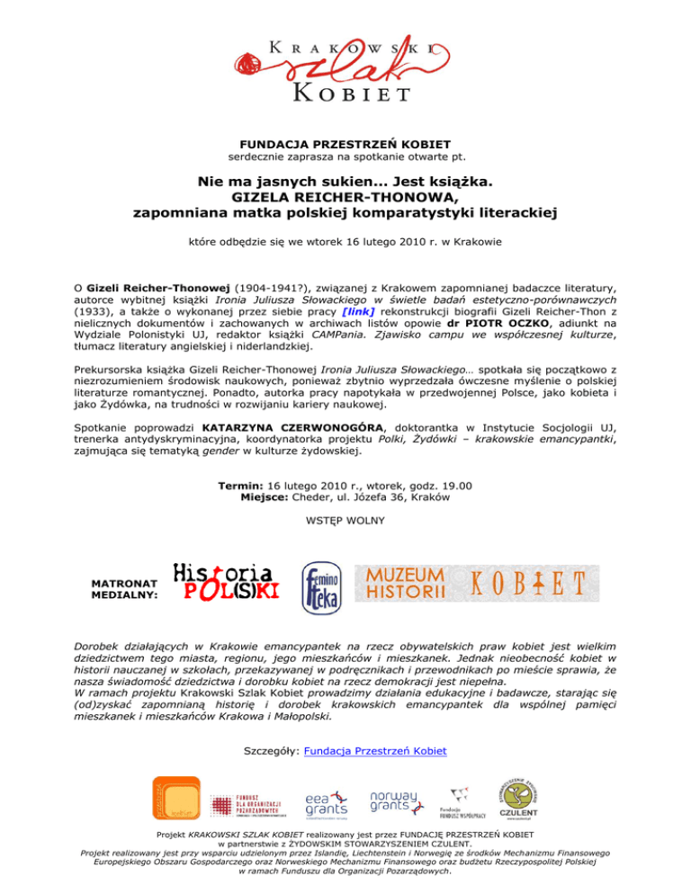FUNDACJA PRZESTRZEŃ KOBIET serdecznie zaprasza na spotkanie otwarte pt. Nie ma jasnych sukien... Jest książka. GIZELA REICHER-THONOWA, zapomniana matka polskiej komparatystyki literackiej które odbędzie się we wtorek 16 lutego 2010 r. w Krakowie O Gizeli Reicher-Thonowej (1904-1941?), związanej z Krakowem zapomnianej badaczce literatury, autorce wybitnej książki Ironia Juliusza Słowackiego w świetle badań estetyczno-porównawczych (1933), a także o wykonanej przez siebie pracy [link] rekonstrukcji biografii Gizeli Reicher-Thon z nielicznych dokumentów i zachowanych w archiwach listów opowie dr PIOTR OCZKO, adiunkt na Wydziale Polonistyki UJ, redaktor książki CAMPania. Zjawisko campu we współczesnej kulturze, tłumacz literatury angielskiej i niderlandzkiej. Prekursorska książka Gizeli Reicher-Thonowej Ironia Juliusza Słowackiego… spotkała się początkowo z niezrozumieniem środowisk naukowych, ponieważ zbytnio wyprzedzała ówczesne myślenie o polskiej literaturze romantycznej. Ponadto, autorka pracy napotykała w przedwojennej Polsce, jako kobieta i jako Żydówka, na trudności w rozwijaniu kariery naukowej. Spotkanie poprowadzi KATARZYNA CZERWONOGÓRA, doktorantka w Instytucie Socjologii UJ, trenerka antydyskryminacyjna, koordynatorka projektu Polki, Żydówki – krakowskie emancypantki, zajmująca się tematyką gender w kulturze żydowskiej. Termin: 16 lutego 2010 r., wtorek, godz. 19.00 Miejsce: Cheder, ul. Józefa 36, Kraków WSTĘP WOLNY MATRONAT MEDIALNY: Dorobek działających w Krakowie emancypantek na rzecz obywatelskich praw kobiet jest wielkim dziedzictwem tego miasta, regionu, jego mieszkańców i mieszkanek. Jednak nieobecność kobiet w historii nauczanej w szkołach, przekazywanej w podręcznikach i przewodnikach po mieście sprawia, że nasza świadomość dziedzictwa i dorobku kobiet na rzecz demokracji jest niepełna. W ramach projektu Krakowski Szlak Kobiet prowadzimy działania edukacyjne i badawcze, starając się (od)zyskać zapomnianą historię i dorobek krakowskich emancypantek dla wspólnej pamięci mieszkanek i mieszkańców Krakowa i Małopolski. Szczegóły: Fundacja Przestrzeń Kobiet Projekt KRAKOWSKI SZLAK KOBIET realizowany jest przez FUNDACJĘ PRZESTRZEŃ KOBIET w partnerstwie z ŻYDOWSKIM STOWARZYSZENIEM CZULENT. Projekt realizowany jest przy wsparciu udzielonym przez Islandię, Liechtenstein i Norwegię ze środków Mechanizmu Finansowego Europejskiego Obszaru Gospodarczego oraz Norweskiego Mechanizmu Finansowego oraz budżetu Rzeczypospolitej Polskiej w ramach Funduszu dla Organizacji Pozarządowych.