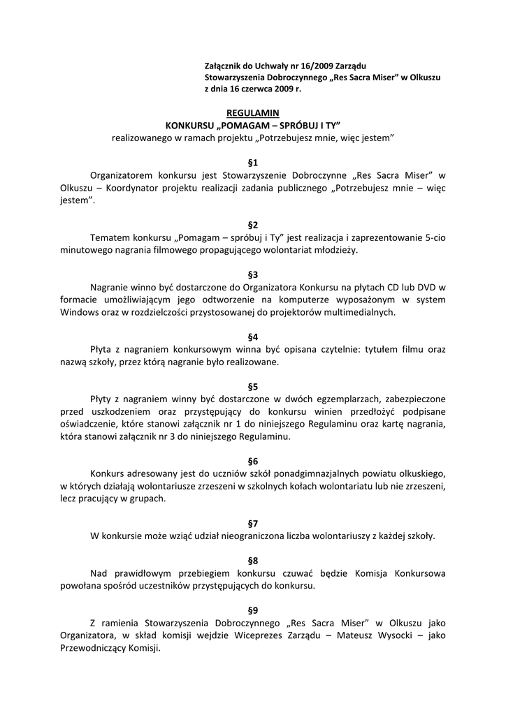 Załącznik do Uchwały nr 16/2009 Zarządu Stowarzyszenia Dobroczynnego „Res Sacra Miser” w Olkuszu z dnia 16 czerwca 2009 r. REGULAMIN KONKURSU „POMAGAM – SPRÓBUJ I TY” realizowanego w ramach projektu „Potrzebujesz mnie, więc jestem” §1 Organizatorem konkursu jest Stowarzyszenie Dobroczynne „Res Sacra Miser” w Olkuszu – Koordynator projektu realizacji zadania publicznego „Potrzebujesz mnie – więc jestem”. §2 Tematem konkursu „Pomagam – spróbuj i Ty” jest realizacja i zaprezentowanie 5-cio minutowego nagrania filmowego propagującego wolontariat młodzieży. §3 Nagranie winno być dostarczone do Organizatora Konkursu na płytach CD lub DVD w formacie umożliwiającym jego odtworzenie na komputerze wyposażonym w system Windows oraz w rozdzielczości przystosowanej do projektorów multimedialnych. §4 Płyta z nagraniem konkursowym winna być opisana czytelnie: tytułem filmu oraz nazwą szkoły, przez którą nagranie było realizowane. §5 Płyty z nagraniem winny być dostarczone w dwóch egzemplarzach, zabezpieczone przed uszkodzeniem oraz przystępujący do konkursu winien przedłożyć podpisane oświadczenie, które stanowi załącznik nr 1 do niniejszego Regulaminu oraz kartę nagrania, która stanowi załącznik nr 3 do niniejszego Regulaminu. §6 Konkurs adresowany jest do uczniów szkół ponadgimnazjalnych powiatu olkuskiego, w których działają wolontariusze zrzeszeni w szkolnych kołach wolontariatu lub nie zrzeszeni, lecz pracujący w grupach. §7 W konkursie może wziąć udział nieograniczona liczba wolontariuszy z każdej szkoły. §8 Nad prawidłowym przebiegiem konkursu czuwać będzie Komisja Konkursowa powołana spośród uczestników przystępujących do konkursu. §9 Z ramienia Stowarzyszenia Dobroczynnego „Res Sacra Miser” w Olkuszu jako Organizatora, w skład komisji wejdzie Wiceprezes Zarządu – Mateusz Wysocki – jako Przewodniczący Komisji. §10 Prace konkursowe oceniać będzie Komisja Konkursowa w składzie: a. Przewodniczący Komisji – Mateusz Wysocki b. Członkowie – uczniowie wytypowani przez szkoły uczestniczące w konkursie (1 przedstawiciel z każdej szkoły). §11 Spośród ofert Komisja Konkursowa wytypuje jako zwycięzcę konkursu jedną przedstawioną projekcję. Każdy Członek Komisji może oddać 1 głos na przedstawione projekcje (z pominięciem swojej własnej). Zwycięzcą zostanie projekcja, która otrzyma największą ilość głosów. §12 W przypadku równej ilości głosów decyduje głos Przewodniczącego Komisji. §13 Konkurs odbędzie się w podczas Targów Wolontariatu 2009. Prace należy składać do koordynatora projektu – Janiny Lenarczyk do siedziby Stowarzyszenia (budynek PSS Społem w Olkuszu przy ul. Króla Kazimierza Wielkiego 12, II piętro, pokój Nr 20) - do dnia 30 października 2009 roku. §14 Dostarczone prace nie będą zwracane autorom. §15 Autorzy prac wyrażają zgodę na odtwarzanie lub wykorzystywanie w całości lub we fragmentach przedstawionych nagrań, wg. oświadczenia stanowiącego załącznik nr 2 do niniejszego regulaminu. §16 Nagrodą w konkursie jest kamera multimedialna. §17 Od werdyktu Komisji Konkursowej nie przysługują środki odwoławcze. §18 Niniejszy regulamin może być zmieniony w formie Aneksu, zatwierdzonego Uchwałą Zarządu Stowarzyszenia Dobroczynnego „Res Sacra Miser” w Olkuszu. §19 Przystąpienie do Konkursu jest jednoznaczne z akceptacją niniejszego Regulaminu. Załącznik nr 1 do Regulaminu …………………...…………………. (pieczęć szkoły) …………………...…………………. …………………...…………………. …………………...…………………. …………………...…………………. …………………...…………………. …………………...…………………. …………………...…………………. (imiona i nazwiska autorów) OŚWIADCZENIE Niniejszym oświadczamy, iż nagranie pt. ………………………………………………………..…………. przedstawione do Konkursu „Pomagam – spróbuj i Ty” jest samodzielnym i oryginalnym utworem w rozumieniu Ustawy z dnia 4 lutego 1994 r. o prawie autorskim i prawach pokrewnych (j. t. Dz. U. z 2006 r. nr 90 poz. 631 z późn. zm.). Nadto oświadczamy, iż przysługują nam jako Twórcom autorskie prawa majątkowe do utworu oraz przedstawione nagranie nie narusza praw majątkowych ani osobistych osób trzecich. Czytelne podpisy autorów: ……………………………………… ……………………………………… ……………………………………… ……………………………………… ……………………………………… ……………………………………… ……………………………………… ………………………………………………..………….. (miejscowość, data) W przypadku osób niepełnoletnich oświadczenie podpisują jednocześnie rodzice lub opiekunowie prawni Autorów! Załącznik nr 2 do Regulaminu …………………...…………………. (pieczęć szkoły) …………………...…………………. …………………...…………………. …………………...…………………. …………………...…………………. …………………...…………………. …………………...…………………. …………………...…………………. (imiona i nazwiska autorów) OŚWIADCZENIE Tytuł nagrania: ……………………………………………………………………………………………………….. Niniejszym oświadczamy, iż wyrażamy zgodę Stowarzyszeniu Dobroczynnemu „Res Sacra Miser” w Olkuszu na utrwalanie, zwielokrotnianie, wprowadzanie do obrotu (użyczanie) oryginałem lub egzemplarzami na których utrwalono utwór, wprowadzanie do pamięci komputera i Internetu, wystawianie, wyświetlanie, odtwarzanie i wykon