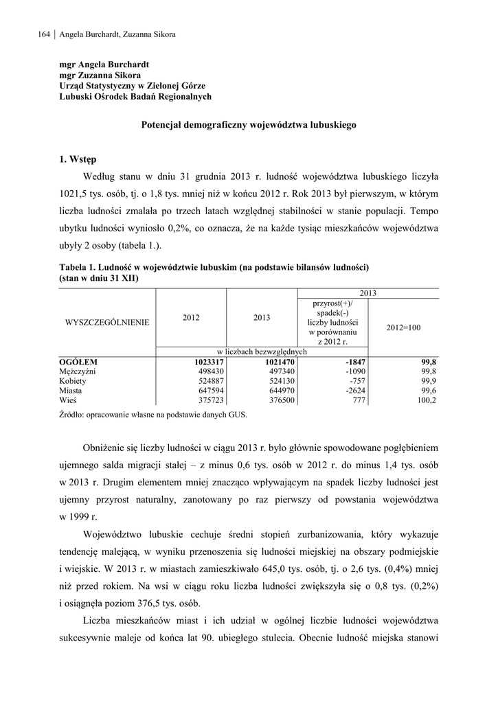 164 Angela Burchardt, Zuzanna Sikora mgr Angela Burchardt mgr Zuzanna Sikora Urząd Statystyczny w Zielonej Górze Lubuski Ośrodek Badań Regionalnych Potencjał demograficzny województwa lubuskiego 1. Wstęp Według stanu w dniu 31 grudnia 2013 r. ludność województwa lubuskiego liczyła 1021,5 tys. osób, tj. o 1,8 tys. mniej niż w końcu 2012 r. Rok 2013 był pierwszym, w którym liczba ludności zmalała po trzech latach względnej stabilności w stanie populacji. Tempo ubytku ludności wyniosło 0,2%, co oznacza, że na każde tysiąc mieszkańców województwa ubyły 2 osoby (tabela 1.). Tabela 1. Ludność w województwie lubuskim (na podstawie bilansów ludności) (stan w dniu 31 XII) 2013 WYSZCZEGÓLNIENIE OGÓŁEM Mężczyźni Kobiety Miasta Wieś 2012 2013 w liczbach bezwzględnych 1023317 1021470 498430 497340 524887 524130 647594 644970 375723 376500 przyrost(+)/ spadek(-) liczby ludności w porównaniu z 2012 r. -1847 -1090 -757 -2624 777 2012=100 99,8 99,8 99,9 99,6 100,2 Źródło: opracowanie własne na podstawie danych GUS. Obniżenie się liczby ludności w ciągu 2013 r. było głównie spowodowane pogłębieniem ujemnego salda migracji stałej – z minus 0,6 tys. osób w 2012 r. do minus 1,4 tys. osób w 2013 r. Drugim elementem mniej znacząco wpływającym na spadek liczby ludności jest ujemny przyrost naturalny, zanotowany po raz pierwszy od powstania województwa w 1999 r. Województwo lubuskie cechuje średni stopień zurbanizowania, który wykazuje tendencję malejącą, w wyniku przenoszenia się ludności miejskiej na obszary podmiejskie i wiejskie. W 2013 r. w miastach zamieszkiwało 645,0 tys. osób, tj. o 2,6 tys. (0,4%) mniej niż przed rokiem. Na wsi w ciągu roku liczba ludności zwiększyła się o 0,8 tys. (0,2%) i osiągnęła poziom 376,5 tys. osób. Liczba mieszkańców miast i ich udział w ogólnej liczbie ludności województwa sukcesywnie maleje od końca lat 90. ubiegłego stulecia. Obecnie ludność miejska stanowi Potencjał demograficzny województwa lubuskiego 63,1% populacji (w 2010 r.– 63,5%, 2000 r. – 64,7%); wskaźnik urbanizacji wyższy niż średnio w kraju (60,4%) lokuje województwo na 7 miejscu, za województwem łódzkim (63,4%), a przed województwem podlaskim (60,4%). Mieszkańcy miast zasiedlający gminy wiejskie okalające większe ośrodki miejskie często nie rezygnują ze swoich miejsc pracy w miastach. Narodowy Spis Powszechny w 2011 r. wykazał, że w województwie lubuskim łącznie dojeżdżało do pracy blisko 83,0 tys. osób, co stanowiło 32,6% ogólnej liczby zatrudnionych (w 2006 r. – 57,4 tys. osób). Porównując rozmiar przepływów ludności związanych z zatrudnieniem z wynikami ostatniego badania w 2006 r., dostrzega się wyraźny wzrost mobilności pracowników najemnych w województwie. Pod względem liczby ludności województwo lubuskie zajmuje 15 miejsce w kraju. Średnia gęstość zaludnienia, tj. liczba osób przypadających na 1 km2 powierzchni województwa, w 2013 r., podobnie jak w poprzednim roku, wynosiła 73 osoby; w miastach 999, na terenach wiejskich 28. Dla porównania w Polsce średnio na 1 km2 powierzchni mieszkają 123 osoby. W 2013 r. województwo zamieszkiwało 497,3 tys. mężczyzn i 524,1 tys. kobiet. Kobiety stanowiły 51,3% ogólnej liczby ludności, podobnie jak przed rokiem. Współczynnik feminizacji, określający liczbę kobiet przypadającą na 100 mężczyzn, wynosił 105 (w kraju – 107). W miastach na 100 mężczyzn przypadało statystycznie 109 kobiet, natomiast na wsi występowała równowaga płci – współczynnik wynosił 100. Relacja liczebności obu płci zmienia się w zależności od wieku. Wśród ludności w wieku do 49 roku życia występuje przewaga liczebna mężczyzn – na 100 mężczyzn przypada 96 kobiet. Dla grupy osób w wieku 50 lat i więcej współczynnik feminizacji wynosi 125, przy czym w najstarszych rocznikach (70 lat i więcej) na 100 mężczyzn przypada średnio 191 kobiet. Wśród mieszkańców wsi przewaga liczebna kobiet następuje dopiero począwszy od wieku 66 lat, w miastach – już od 42 roku życia. W porównaniu z innymi regionami ludność województwa lubuskiego jest demograficznie stosunkowo młoda, pomimo zwiększającego się corocznie wieku środkowego (mediany). W 2013 r. mediana wyznaczająca granicę wieku, którą połowa ludności już przekroczyła, a druga połowa jeszcze nie osiągnęła, wyniosła 38,6 lat (w 2012 r. – 38,2 lat, w 2000 r. – 34,2 lat) i była dla kobiet o 3,2 lata wyższa niż dla mężczyzn. Biorąc pod uwagę miejsce zamieszkania ludność w miastach jest starsza niż na wsi – o blisko 2,5 roku (kobiety o 3,6 lat, mężczyźni o 1,3 lat). 165 166 Angela Burchardt, Zuzanna Sikora 2. Struktura ludności województwa lubuskiego Rezultatem przemian w procesach demograficznych, przede wszystkim głębokiej depresji urodzeniowej z lat 90-tych oraz z początku tego stulecia, jest gwałtowne zmniejszenie się liczby dzieci i młodzieży (0-17 lat) oraz wzrost liczby osób starszych. W końcu 2013 r. udział dzieci i młodzieży w ogólnej liczbie ludności województwa wynosił 18,4% (w 2012 r. – 18,6%, w 2000 r. – 25,5%), a osób starszych w wieku 65 lat i więcej – 13,4% (w 2012 r. – 12,7%, w 2000 r. – 10,9%). W ostatnich latach liczba osób młodszych maleje wolniej niż wzrasta starszych. Liczebność dzieci w wieku poniżej 15 roku życia zmniejszyła się w 2013 r. do 155,4 tys., tj. o 0,6% w ujęciu rocznym, a ich udział w ogólnej liczbie ludności wyniósł 15,2% (w 2012 r. 15,3%). Natomiast liczba osób starszych w wieku 65 lat i więcej wzrosła z 130,0 tys. do 136,5 tys. osób, tj. o 5,0% w relacji do 2012 r. (tabela 2.). Szybki przyrost ludności starszej powoduje sukcesywne zmniejszanie się różnicy między odsetkiem dzieci i osób starszych w populacji: w 2013 r. różnica wynosiła 1,8 p. proc., w 2012 r. – 2,6 p. proc., w 2011 r. – 3,1 p. proc.; na 100 osó