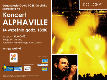 Urząd Miasta Opola i C.H. Karolinka zapraszają na Koncert ALPHAVILLE 14 września godz. 18:00 support - Blue Café miejsce - parking Centrum Handlowego KAROLINKA wstęp wolny! patroni medialni: współorganizator : Centrum Handlowe Karolinka, Opole, ul. Wrocławska 154 www.ch-karolinka.pl, www.opole.pl KONCERT