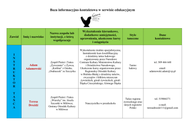 Baza informacyjno-kontaktowa w serwisie edukacyjnym Zawód I N S T R U K T O R T A Ń C A Nazwa zespołu lub instytucji, z którą współpracuje Wykształcenie kierunkowe, dodatkowe umiejętności, uprawnienia, ukończone kursy i osiągnięcia Style taneczne Adam Adamowski Zespół Pieśni i Tańca „Żywczanie” z Żywca, „Kotlina” z Osieka, „Ondraszek” ze Szczyrku Wykształcenie średnie specjalistyczne, Instruktorski kurs kwalifikacyjny z dziedziny tańca ludowego organizowany przez Narodowe Centrum Kultury Ministerstwa Kultury i Dziedzictwa Narodowego, Ukończone kursy organizowane przez Regionalny Ośrodek Kultury w Bielsku-Białej z dziedziny tańców, zwyczajów i folkloru mieszczan żywieckich, górali żywieckich, górali Śląska Cieszyńskiego, Górnego Śląska Taniec ludowy Teresa Drożdż Zespół Pieśni i Tańca „Wierchy” im. Józefa Szczotki w Milówce, Gminny Ośrodek Kultury w Milówce Nauczycielka w przedszkolu Tańce regionu żywieckiego oraz innych regionów Polski Imię i nazwisko Dane kontaktowe tel. 509 466 648 email: [email protected] tel. 519066371 e-mail: [email protected] I N S T R U K T O R T A Ń C A Sabina Gwizdała Enigma, Mała Enigma, Tralaluszki, Dominutki, Kropeczki, Miejski Dom Kultury im. Wiktorii Kubisz w Bielsku-Białej, Forma, Mała Forma, Wicherki, Miejski Dom Kultury, Dom Kultury w Olszówce w Bielsku-Białej Dyplom zawodowego instruktora tańca, Studia wyższe pedagogiczne, specjalizacja: animacja społeczno-kulturalna Taniec współczesny, rytmika email: [email protected] Łukasz Hola Zespół Pieśni i Tańca „Bielsko” Bielskie Centrum Kultury Instruktorski Kurs Kwalifikacyjny w Krakowie Taniec ludowy email: [email protected] Małgorzata Hołdys Szkolny Regionalny Zespół „Klimczok” (grupa dziecięca), Regionalny Zespół „Klimczok”, Stowarzyszenie Kulturalno-Oświatowe „Klimczok” w Szczyrku Średnie artystyczne Taniec ludowy oraz towarzyski Paulina Pasierbek D.G.F. Crew, Semi Sweet Gyals, Dom Kultury w Wapienicy w Bielsku-Białej, Agencja taneczna „7” Gminny Ośrodek Sportu i Rekreacji w Wilkowicach Studia: animacja społeczno-kulturalna z turystyką kulturalną, Ukończone warsztaty i szkolenia taneczne Dancehall, Hip-hop tel. 503 747 533 tel. 661 133 901 email: [email protected] tel. 667 311 806 email: [email protected] I N S T R U K T O R T A Ń C A C H O R E O G R A F Marta Płaska Zespół Pieśni i Tańca „Bielsko” Dom Kultury w Lipniku w Bielsku-Białej Instruktorski kurs kwalifikacyjny z zakresu tańca ludowego, Szkolenie dla instruktorów tańca w przedszkolach Taniec ludowy, klasyczny, współczesny oraz towarzyski Barbara Rybczyk Zespół Pieśni i Tańca „Beskid” Miejski Dom Kultury, Dom Kultury Włókniarzy w Bielsku-Białej Studia magisterskie: animacja społeczno-kulturalna Taniec ludowy Jolanta Witkowska „Impuls” Zespół Tańca Współczesnego, Miejski Dom Kultury, Dom Kultury w Wapienicy w Bielsku-Białej Uniwersytet Wrocławski: animator kultury, Szkoła Choreograficzna w Opolu, Kursy taneczne na Festiwalach Tanecznych w Poznaniu i Warszawie Taniec musicalowy, estradowy, jazz, brodway-jazz Zespół Pieśni i Tańca „Żywczanie” z Żywca, „Kotlina” z Osieka, „Ondraszek” ze Szczyrku Wykształcenie średnie specjalistyczne, Instruktorski kurs kwalifikacyjny z dziedziny tańca ludowego organizowany przez Narodowe Centrum Kultury Ministerstwa Kultury i Dziedzictwa Narodowego, Ukończone kursy organizowane przez Regionalny Ośrodek Kultury w Bielsku-Białej z dziedziny tańców, zwyczajów i folkloru mieszczan żywieckich, górali żywieckich, górali Śląska Cieszyńskiego, Górnego Śląska Adam Adamowski tel. 505 940 063 email: [email protected] tel. 690 215 004 tel. 510 784 595 email: [email protected] tel. 509 466 648 Taniec ludowy email: [email protected] C H O R E O G R A F tel.600 27 40 88 Bożena Bieńczyk Zespół Pieśni i Tańca „Bielsko” Bielskie Centrum Kultury Wykształcenie wyższe, Studium choreograficzne Taniec ludowy Sabina Gwizdała Enigma, Mała Enigma, Tralaluszki, Dominutki, Kropeczki, Miejski Dom Kultury im. Wiktorii Kubisz w Bielsku-Białej, Forma, Mała Forma, Wicherki, Miejski Dom Kultury, Dom Kultury w Olszówce w Bielsku-Białej Dyplom zawodowego instruktora tańca, Studia wyższe pedagogiczne, specjalizacja: animacja społeczno-kulturalna Taniec współczesny, rytmika email: [email protected] Łukasz Hola Zespół Pieśni i Tańca „Bielsko” Bielskie Centrum Kultury Instruktorski Kurs Kwalifikacyjny w Krakowie Taniec ludowy email: [email protected] Małgorzata Hołdys Szkolny Regionalny Zespół „Klimczok” (grupa dziecięca), Regionalny Zespół „Klimczok” Stowarzyszenie Kulturalno-Oświatowe ”Klimczok” w Szczyrku Średnie artystyczne Taniec ludowy oraz towarzyski Katerina Kubičkova „Perfekto” Miejski Dom Kultury Czechowice-Dziedzice Mistrzyni Polski, Czech, Europy HJA Mażoretki, Fitness Bikini (Czechy) Mażoretki, Cheerleading email: [email protected] tel. 503 747 533 tel. 661 133 901 email: [email protected] tel. 889 105 463 email: [email protected] C H O R E O G R A F T A N C E R Z Paulina Pasierbek D.G.F. Crew, Semi Sweet Gyals, Dom Kultury w Wapienicy w Bielsku-Białej, Agencja taneczna „7” Gminny Ośrodek Sportu i Rekreacji w Wilkowicach Romana Polok Zespół Pieśni i Tańca „Beskid” Miejski Dom Kultury, Dom Kultury Włókniarzy w Bielsku-Białej Wykształcenie kierunkowe: weryfikacje kat. „I” od 1982 roku Taniec ludowy Jolanta Witkowska „Impuls” Zespół Tańca Współczesnego, Miejski Dom Kultury, Dom Kultury w Wapienicy w Bielsku-Białej Uniwersytet Wrocławski: animator kultury, Szkoła Choreograficzna w Opolu, Kursy taneczne na Festiwalach Tanecznych w Poznaniu i Warszawie Taniec musicalowy, estradowy, jazz, brodway-jazz Aleksandra Górny Zespół Pieśni i Tańca „Beskid” Miejski Dom Kultury, Dom Kultury Włókniarzy w Bielsku-Białej Taniec ludowy Gabriela Herzyk Zespół Pieśni 