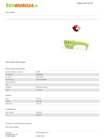 Izabelin 2017-03-08 Karta produktu: Cena 0,01 PLN brutto Basic product parameters Numer produktu w systemie 27049 Nr dostawcy NPBSB0087 Nr Celcen 2487-00205 Kod kreskowy 5908256834408 Nazwa produktu Opis Kategoria PBS Special Offers Brand NO NAME Feature Type Do noży Product Ostrzałka Offer from 2016-02 Certifications New product Standard Hit Standard Serdecznie zapraszamy do współpracy Eko biuro zespół. Eko biuro ul Krasińskiego 23a 05-080 Izabelin NIP: 527-000-75-75 22 864 54 84