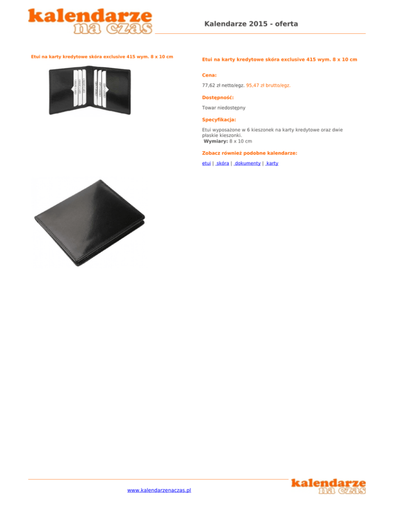 Kalendarze 2015 - oferta Etui na karty kredytowe skóra exclusive 415 wym. 8 x 10 cm Etui na karty kredytowe skóra exclusive 415 wym. 8 x 10 cm Cena: 77,62 zł netto/egz. 95,47 zł brutto/egz. Dostępność: Towar niedostępny Specyfikacja: Etui wyposażone w 6 kieszonek na karty kredytowe oraz dwie płaskie kieszonki. Wymiary: 8 x 10 cm Zobacz również podobne kalendarze: etui | skóra | dokumenty | karty www.kalendarzenaczas.pl