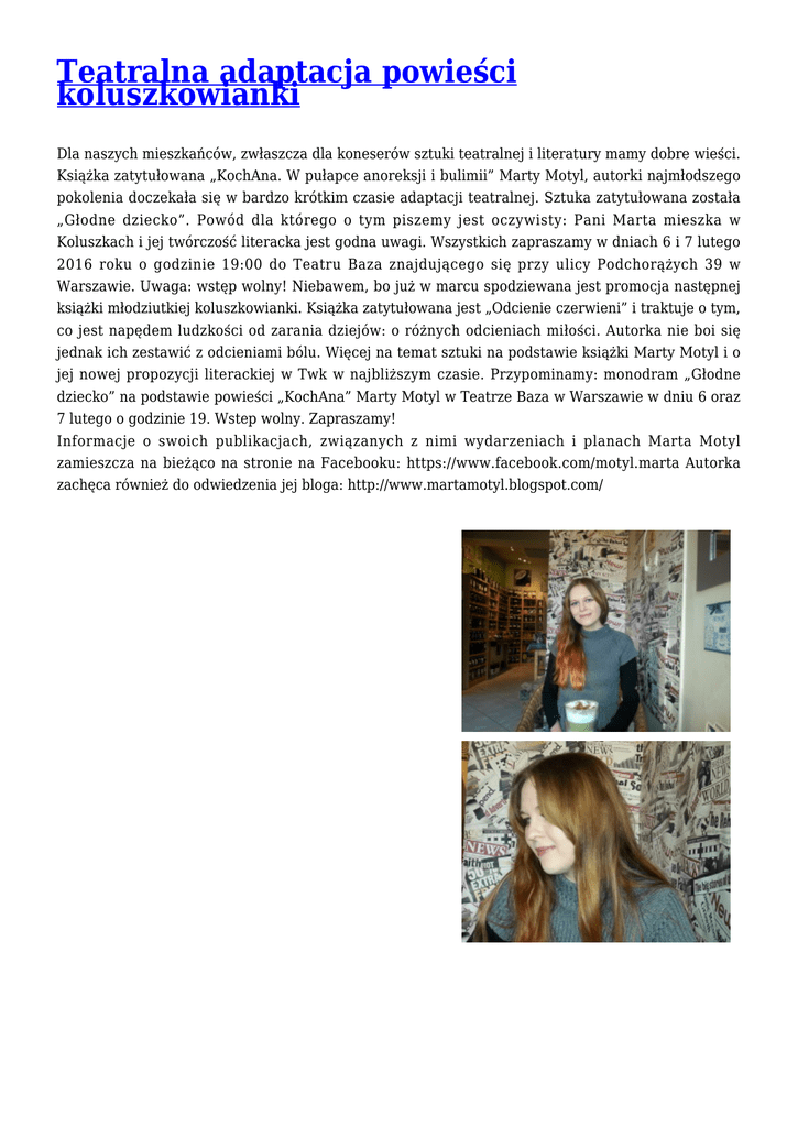 Teatralna adaptacja powieści koluszkowianki Dla naszych mieszkańców, zwłaszcza dla koneserów sztuki teatralnej i literatury mamy dobre wieści. Książka zatytułowana „KochAna. W pułapce anoreksji i bulimii” Marty Motyl, autorki najmłodszego pokolenia doczekała się w bardzo krótkim czasie adaptacji teatralnej. Sztuka zatytułowana została „Głodne dziecko”. Powód dla którego o tym piszemy jest oczywisty: Pani Marta mieszka w Koluszkach i jej twórczość literacka jest godna uwagi. Wszystkich zapraszamy w dniach 6 i 7 lutego 2016 roku o godzinie 19:00 do Teatru Baza znajdującego się przy ulicy Podchorążych 39 w Warszawie. Uwaga: wstęp wolny! Niebawem, bo już w marcu spodziewana jest promocja następnej książki młodziutkiej koluszkowianki. Książka zatytułowana jest „Odcienie czerwieni” i traktuje o tym, co jest napędem ludzkości od zarania dziejów: o różnych odcieniach miłości. Autorka nie boi się jednak ich zestawić z odcieniami bólu. Więcej na temat sztuki na podstawie książki Marty Motyl i o jej nowej propozycji literackiej w Twk w najbliższym czasie. Przypominamy: monodram „Głodne dziecko” na podstawie powieści „KochAna” Marty Motyl w Teatrze Baza w Warszawie w dniu 6 oraz 7 lutego o godzinie 19. Wstep wolny. Zapraszamy! Informacje o swoich publikacjach, związanych z nimi wydarzeniach i planach Marta Motyl zamieszcza na bieżąco na stronie na Facebooku: https://www.facebook.com/motyl.marta Autorka zachęca również do odwiedzenia jej bloga: http://www.martamotyl.blogspot.com/