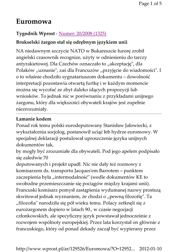 Page 1 of 5 Euromowa Tygodnik Wprost - Numer: 20/2008 (1325) Brukselski żargon stał się odrębnym językiem unii NA niedawnym szczycie NATO w Bukareszcie furorę zrobił angielski czasownik recognize, użyty w odniesieniu do tarczy antyrakietowej. Dla Czechów oznaczało to „akceptację", dla Polaków „uznanie", zaś dla Francuzów „przyjęcie do wiadomości". I o to właśnie chodziło sygnatariuszom dokumentu – dowolność interpretacji pozostawia otwartą furtkę i w każdym momencie można się wycofać ze zbyt daleko idących propozycji lub wniosków. To jednak nic w porównaniu z przykładami unijnego żargonu, który dla większości obywateli krajów jest zupełnie niezrozumiały. Łamanie kodem Ponad rok temu polski eurodeputowany Stanisław Jałowiecki, z wykształcenia socjolog, postanowił uciąć łeb hydrze euromowy. W specjalnej deklaracji postulował uproszczenie języka unijnych dokumentów tak, by mogły być zrozumiałe dla obywateli. Pod jego apelem podpisało się zaledwie 70 deputowanych i projekt upadł. Nic nie dały też rozmowy z komisarzem ds. transportu Jacques'em Barrotem – punktem zaczepienia była „intermodalność" (wedle dokumentów KE to swobodne przemieszczanie się pociągów między krajami unii). Francuski komisarz pomysł zastąpienia wydumanej nazwy prostszą skwitował jednak wyznaniem, że chodzi o „pewną filozofię". Ta „filozofia" narodziła się pół wieku temu. Polacy zetknęli się z eurożargonem dopiero w latach 90., w czasie negocjacji członkowskich, ale specyficzny język powstawał jednocześnie z rozwojem wspólnoty europejskiej. Przez lata korzystał on głównie z francuskiego, który od ponad dekady zaczął być wypierany przez http://www.wprost.pl/ar/129526/Euromowa/?O=12952... 2012-01-10 Page 2 of 5 angielski. Jest to zresztą na tyle specyficzny angielski, że wyspiarze mogliby mieć problemy z jego zrozumieniem. Większość unijnych dokumentów powstaje w języku macierzystym, a potem w angielskim lub francuskim. W przekładzie na inne języki tłumacze używają często kalek językowych, bo sami nie są do końca pewni znaczenia tłumaczonych zwrotów (i działają pod presją czasu). Dzieje się tak nawet wtedy, gdy istnieją np. polskie odpowiedniki angielskich słów. W ten sposób powoli powstaje ujednolicony język unijny, zrozumiały „dla wybranych”. Terminy typu „kohezja” czy „unilateralizm” stają się uniwersalne, wypierając narodowe wersje tych pojęć. Urzędnicy komisji istnienie euromowy tłumaczą próbą zapanowania nad wielością unijnych języków. Słowa kontra myśli Do dziś w Brukseli cytuje się słowa polskiego dyplomaty, który po kolejnej rundzie negocjacji akcesyjnych oznajmił dziennikarzom, iż „w transpozycji i implementacji acquis communautaire mamy mixed record". W wolnym tłumaczeniu oznaczało to, że we wdrażaniu prawa wspólnotowego mamy średnie rezultaty. Równie enigmatycznie zabrzmiała wypowiedź innego polskiego polityka opowiadającego o „inicjatywie prezydencji niemieckiej powołania jakiegoś organu, nazywanego independent body, który miałby za zadanie redukcję kosztów administracyjnych i wprowadzenie zasad better regulation". Te „independent bodies" mają tę przewagę nad prostszymi wyrażeniami, że można je interpretować na wiele sposobów i w zależności od potrzeby wybrać najbardziej pasującą wersję. Pomaga to w osiąganiu kompromisu. Można tu przypomnieć słynną Joaninę, która pojawiła się na szczycie konstytucyjnym w Brukseli w 2007 r. i miała przekonać polską delegację do podpisania dokumentu. A już po szczycie wybuchły spory prawników, o co tak naprawdę chodzi w tej zasadzie. Euromową najczęściej skażeni są eurokraci z krwi i kości, którzy http://www.wprost.pl/ar/129526/Euromowa/?O=12952... 2012-01-10 Page 3 of 5 nawet do rozmów prywatnych wtrącają unijny żargon. Skażeni są nią też brukselscy neofici, którzy często sami nie do końca rozumieją, o czym mówią, i dlatego na wszelki wypadek cytują całe frazy z dokumentów. Gorzej, jeśli dziennikarze proszą ich o wytłumaczenie znaczenia terminów. Pewne jest, że zwykli obywatele, a nawet dziennikarze niespecjalizujący się w tematyce unijnej mieliby wielki problem ze zrozumieniem przekazów większości konferencji w Brukseli, zdominowanych przez europejską nowomowę. – Nie chcę bronić eurokratów, ale często sięgają oni po eurożargon z pośpiechu – mówi Rafał Trzaskowski, ekspert z Centrum Europejskiego w Natolinie. – Pracują głównie na dokumentach oryginalnych angielskich lub francuskich i automatycznie powielają pewne frazy. Inna sprawa to troska o precyzję przekazu. W niektórych wypadkach celowo wolę posługiwać się określeniami rodem z eurożargonu, bo nasze polskie odpowiedniki nie oddają w pełni znaczenia oryginału. Tak jest na przykład, gdy odwołuję się do słów niemieckiego eurodeputowanego Elmara Broka i cytuję jego „dyferencjację". Nasze polskie „rozróżnienie” jest za mało pojemne – mówi Trzaskowski. Inna sprawa, że unijne procedury wręcz nakładają wymóg używania pewnych zwrotów. W oficjalnych dokumentach nie ma np. Holandii, jest za to Królestwo Niderlandów, podobnie Wielka Brytania jest Zjednoczonym Królestwem, zaś Czechy Republiką Czeską – takie bowiem nazwy figurują w unijnych traktatach. I eurokrata musi to uszanować. Szczytowym osiągnięciem euromowy są konstytucja europejska i traktat lizboński, całe naszpikowane unijnym żargonem. – Próbowałem przeczytać tekst traktatu i abstrahując już od jego odniesień do innych traktatów, tego po prostu nie da się czytać – przyznaje Jałowiecki. Mur niezrozumienia Bruksela uwielbia też skróty. A skraca się nazwy instytucji, http://www.wprost.pl/ar/129526/Euromowa/?O=12952... 2012-01-10 Page 4 of 5 departamentów czy nawet dokumentów. Europejska nowomowa to jednak nie tylko poszczególne słowa,