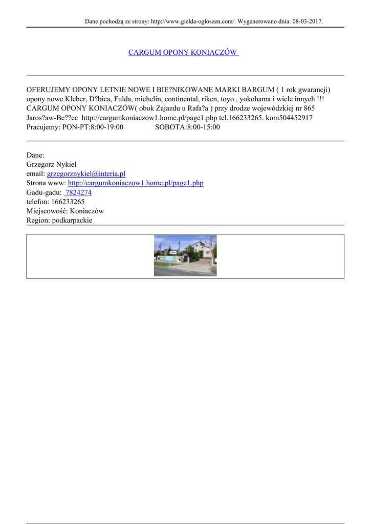 Dane pochodzą ze strony: http://www.gielda-ogloszen.com/. Wygenerowano dnia: 08-03-2017. CARGUM OPONY KONIACZÓW OFERUJEMY OPONY LETNIE NOWE I BIE?NIKOWANE MARKI BARGUM ( 1 rok gwarancji) opony nowe Kleber, D?bica, Fulda, michelin, continental, riken, toyo , yokohama i wiele innych !!! CARGUM OPONY KONIACZÓW( obok Zajazdu u Rafa?a ) przy drodze wojewódzkiej nr 865 Jaros?aw-Be??ec http://cargumkoniaczow1.home.pl/page1.php tel.166233265. kom504452917 Pracujemy: PON-PT:8:00-19:00 SOBOTA:8:00-15:00 Dane: Grzegorz Nykiel email: [email protected] Strona www: http://cargumkoniaczow1.home.pl/page1.php Gadu-gadu: 7824274 telefon: 166233265 Miejscowość: Koniaczów Region: podkarpackie