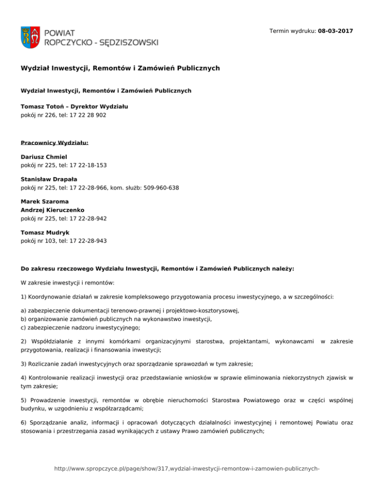 Termin wydruku: 08-03-2017 Wydział Inwestycji, Remontów i Zamówień Publicznych Wydział Inwestycji, Remontów i Zamówień Publicznych Tomasz Totoń – Dyrektor Wydziału pokój nr 226, tel: 17 22 28 902 Pracownicy Wydziału: Dariusz Chmiel pokój nr 225, tel: 17 22-18-153 Stanisław Drapała pokój nr 225, tel: 17 22-28-966, kom. służb: 509-960-638 Marek Szaroma Andrzej Kieruczenko pokój nr 225, tel: 17 22-28-942 Tomasz Mudryk pokój nr 103, tel: 17 22-28-943 Do zakresu rzeczowego Wydziału Inwestycji, Remontów i Zamówień Publicznych należy: W zakresie inwestycji i remontów: 1) Koordynowanie działań w zakresie kompleksowego przygotowania procesu inwestycyjnego, a w szczególności: a) zabezpieczenie dokumentacji terenowo-prawnej i projektowo-kosztorysowej, b) organizowanie zamówień publicznych na wykonawstwo inwestycji, c) zabezpieczenie nadzoru inwestycyjnego; 2) Współdziałanie z innymi komórkami organizacyjnymi starostwa, projektantami, wykonawcami w zakresie przygotowania, realizacji i finansowania inwestycji; 3) Rozliczanie zadań inwestycyjnych oraz sporządzanie sprawozdań w tym zakresie; 4) Kontrolowanie realizacji inwestycji oraz przedstawianie wniosków w sprawie eliminowania niekorzystnych zjawisk w tym zakresie; 5) Prowadzenie inwestycji, remontów w obrębie nieruchomości Starostwa Powiatowego oraz w części wspólnej budynku, w uzgodnieniu z współzarządcami; 6) Sporządzanie analiz, informacji i opracowań dotyczących działalności inwestycyjnej i remontowej Powiatu oraz stosowania i przestrzegania zasad wynikających z ustawy Prawo zamówień publicznych; http://www.spropczyce.pl/page/show/317,wydzial-inwestycji-remontow-i-zamowien-publicznych- 7) Nadzór nad realizacją inwestycji prowadzonych przez Powiat w oparciu o zatwierdzony corocznie plan nakładów finansowych na inwestycje; 8) Przygotowywanie projektów i wniosków o dofinansowanie inwestycji ze źródeł zewnętrznych w zakresie inwestycji i remontów. 9) Nadzór nad realizacją umów o zastępstwo inwestycyjne i przygotowywanie propozycji ich zmian lub rozwiązania; 10) Przygotowywanie okresowych informacji i analiz dla Starosty, Zarządu i Rady o postępie prac w realizacji inwestycji; 11) Udział w postępowaniach dot. udzielania zamówień na realizację inwestycji. W zakresie Zamówień Publicznych. 1) Koordynowanie, doradztwo i pomoc komórkom organizacyjnym Starostwa (z wyłączeniem Wydziału Dróg Powiatowych) w przygotowaniu i prowadzeniu postępowań o udzielenie zamówienia publicznego zgodnie z ustawą Prawo zamówień publicznych (Pzp) oraz wydanymi na jej podstawie przepisami wykonawczymi, w tym w szczególności: a) doradztwo i pomoc w zakresie właściwego i zgodnego z ustawą opisu przedmiotu zamówienia, b) doradztwo i pomoc w zakresie prawidłowego i zgodnego z ustawą szacowania wartości zamówienia, c) akceptacja wyboru przez komórkę organizacyjną trybu postępowania o udzielenie zamówienia publicznego, d) doradztwo i pomoc w zakresie doboru kryteriów oceny ofert, e) opracowywanie w uzgodnieniu z komórkami organizacyjnymi specyfikacji istotnych warunków zamówienia wraz z załącznikami, f) doradztwo i pomoc komórkom organizacyjnym w opracowywaniu projektu umowy w zakresie jej zgodności z ustawą Pzp, g) przygotowanie i zamieszczanie wymaganych przepisami prawa ogłoszeń, dokumentacji i specyfikacji przetargowych do publikacji na stronie internetowej Starostwa, Dzienniku Urzędowym Unii Europejskiej, Biuletynie Zamówień Publicznych, tablicy ogłoszeń Starostwa, a także zawiadamianie o wszczęciu postępowania Prezesa UZP w zależności od przepisów określonych w ustawie Pzp, h) przygotowywanie ewentualnych wyjaśnień lub modyfikacji specyfikacji istotnych warunków zamówienia, a także przygotowywanie i publikacja ewentualnych ogłoszeń o zmianie ogłoszenia, i) udział w pracach Komisji Przetargowych w charakterze Sekretarza Komisji, j) sporządzanie protokołu z postępowania o udzielenie zamówienia publicznego oraz prowadzenie i przechowywanie do czasu zakończenia postępowania dokumentacji związanych z realizacją postępowania, k) przygotowywanie wezwań do uzupełnienia oświadczeń i dokumentów, zawiadomień o poprawieniu omyłek, wezwań do złożenia wyjaśnień, ogłoszenia i zawiadomienia o wyborze najkorzystniejszej oferty oraz innej korespondencji z wykonawcami na etapie badania i oceny ofert przez Komisję Przetargową, l) opracowywanie i publikacja ogłoszeń o udzieleniu zamówienia, ł) przygotowywanie wniosków do Wydziału Finansowego w sprawie zwrotu wadium, m) prowadzenie w uzgodnieniu z Radcą Prawnym spraw związanych z ewentualnymi odwołaniami Wykonawców od rozstrzygnięcia postępowania, n) współpraca z komórkami organizacyjnymi w realizacji umów w zakresie ich zgodności z ustawą Pzp, o) opiniowanie ewentualnych aneksów do umowy pod względem ich zgodności z ustawą Pzp; 2) Prowadzenie zbiorczej sprawozdawczości dotyczącej zamówień publicznych udzielanych w jednostce; 3) Opracowywanie regulaminu dotyczącego zasad udzielania zamówień publicznych w jednostce do zatwierdzenia przez Zarząd Powiatu oraz wnioskowanie ewentualnych zmian; 4) Opracowywanie regulaminu dotyczącego zasad udzielania zamówień publicznych w jednostce, do których nie ma http://www.spropczyce.pl/page/show/317,wydzial-inwestycji-remontow-i-zamowien-publicznych- zastosowania ustawa Pzp, przedkładanie go do zatwierdzenia przez Zarząd Powiatu oraz wnioskowanie ewentualnych zmian; 5) Sprawdzanie wszystkich umów Powiatu pod względem ich zgodności z ustawą Prawo zamówień publicznych oraz Regulaminem udzielania zamówień publicznych, do których nie ma zastosowania ustawa Pzp. W zakresie rozwoju Powiatu: 1) Prowadzenie banku informacji ofert gospodarczych dla potrzeb Powiatu; 2) Opracowywanie analiz w oparciu o materiały statystyczne i zbiorcze opracowania, dotyczące infrastruktury społeczno-gospodarczej Powiatu; 3) Oprac