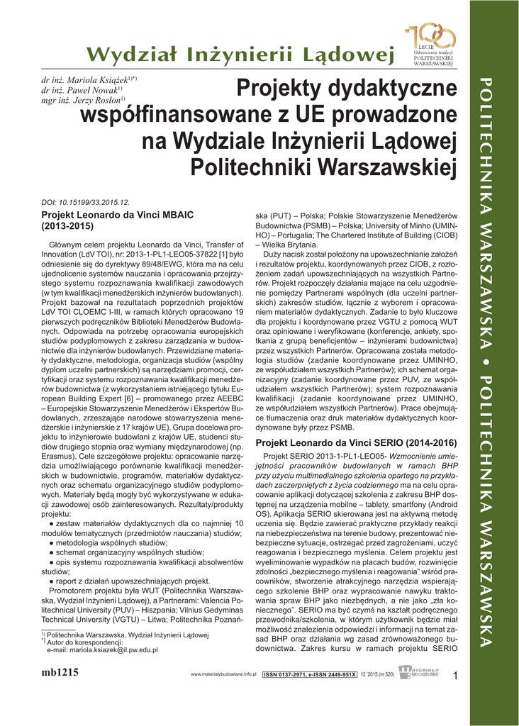 Wydział Inżynierii Lądowej Projekty dydaktyczne współfinansowane z UE prowadzone na Wydziale Inżynierii Lądowej Politechniki Warszawskiej DOI: 10.15199/33.2015.12. Projekt Leonardo da Vinci MBAIC (2013-2015) Głównym celem projektu Leonardo da Vinci, Transfer of Innovation (LdV TOI), nr: 2013-1-PL1-LEO05-37822 [1] było odniesienie się do dyrektywy 89/48/EWG, która ma na celu ujednolicenie systemów nauczania i opracowania przejrzystego systemu rozpoznawania kwalifikacji zawodowych (w tym kwalifikacji menedżerskich inżynierów budowlanych). Projekt bazował na rezultatach poprzednich projektów LdV TOI CLOEMC I-III, w ramach których opracowano 19 pierwszych podręczników Biblioteki Menedżerów Budowlanych. Odpowiada na potrzebę opracowania europejskich studiów podyplomowych z zakresu zarządzania w budownictwie dla inżynierów budowlanych. Przewidziane materiały dydaktyczne, metodologia, organizacja studiów (wspólny dyplom uczelni partnerskich) są narzędziami promocji, certyfikacji oraz systemu rozpoznawania kwalifikacji menedżerów budownictwa (z wykorzystaniem istniejącego tytułu European Building Expert [6] – promowanego przez AEEBC – Europejskie Stowarzyszenie Menedżerów i Ekspertów Budowlanych, zrzeszające narodowe stowarzyszenia menedżerskie i inżynierskie z 17 krajów UE). Grupa docelowa projektu to inżynierowie budowlani z krajów UE, studenci studiów drugiego stopnia oraz wymiany międzynarodowej (np. Erasmus). Cele szczegółowe projektu: opracowanie narzędzia umożliwiającego porównanie kwalifikacji menedżerskich w budownictwie, programów, materiałów dydaktycznych oraz schematu organizacyjnego studiów podyplomowych. Materiały będą mogły być wykorzystywane w edukacji zawodowej osób zainteresowanych. Rezultaty/produkty projektu: ● zestaw materiałów dydaktycznych dla co najmniej 10 modułów tematycznych (przedmiotów nauczania) studiów; ● metodologia wspólnych studiów; ● schemat organizacyjny wspólnych studiów; ● opis systemu rozpoznawania kwalifikacji absolwentów studiów; ● raport z działań upowszechniających projekt. Promotorem projektu była WUT (Politechnika Warszawska, Wydział Inżynierii Lądowej), a Partnerami: Valencia Politechnical University (PUV) – Hiszpania; Vilnius Gedyminas Technical University (VGTU) – Litwa; Politechnika Poznań1) *) Politechnika Warszawska, Wydział Inżynierii Lądowej Autor do korespondencji: e-mail: [email protected] mb1215 ska (PUT) – Polska; Polskie Stowarzyszenie Menedżerów Budownictwa (PSMB) – Polska; University of Minho (UMINHO) – Portugalia; The Chartered Institute of Building (CIOB) – Wielka Brytania. Duży nacisk został położony na upowszechnianie założeń i rezultatów projektu, koordynowanych przez CIOB, z rozłożeniem zadań upowszechniających na wszystkich Partnerów. Projekt rozpoczęły działania mające na celu uzgodnienie pomiędzy Partnerami wspólnych (dla uczelni partnerskich) zakresów studiów, łącznie z wyborem i opracowaniem materiałów dydaktycznych. Zadanie to było kluczowe dla projektu i koordynowane przez VGTU z pomocą WUT oraz opiniowane i weryfikowane (konferencje, ankiety, spotkania z grupą beneficjentów – inżynierami budownictwa) przez wszystkich Partnerów. Opracowana została metodologia studiów (zadanie koordynowane przez UMINHO, ze współudziałem wszystkich Partnerów); ich schemat organizacyjny (zadanie koordynowane przez PUV, ze współudziałem wszystkich Partnerów); system rozpoznawania kwalifikacji (zadanie koordynowane przez UMINHO, ze współudziałem wszystkich Partnerów). Prace obejmujące tłumaczenia oraz druk materiałów dydaktycznych koordynowane były przez PSMB. Projekt Leonardo da Vinci SERIO (2014-2016) Projekt SERIO 2013-1-PL1-LEO05- Wzmocnienie umiejętności pracowników budowlanych w ramach BHP przy użyciu multimedialnego szkolenia opartego na przykładach zaczerpniętych z życia codziennego ma na celu opracowanie aplikacji dotyczącej szkolenia z zakresu BHP dostępnej na urządzenia mobilne – tablety, smartfony (Android OS). Aplikacja SERIO skierowana jest na aktywną metodę uczenia się. Będzie zawierać praktyczne przykłady reakcji na niebezpieczeństwa na terenie budowy, prezentować niebezpieczne sytuacje, ostrzegać przed zagrożeniami, uczyć reagowania i bezpiecznego myślenia. Celem projektu jest wyeliminowanie wypadków na placach budów, rozwinięcie zdolności „bezpiecznego myślenia i reagowania” wśród pracowników, stworzenie atrakcyjnego narzędzia wspierającego szkolenie BHP oraz wypracowanie nawyku traktowania spraw BHP jako niezbędnych, a nie jako „zła koniecznego”. SERIO ma być czymś na kształt podręcznego przewodnika/szkolenia, w którym użytkownik będzie miał możliwość znalezienia odpowiedzi i informacji na temat zasad BHP oraz działania wg zasad zrównoważonego budownictwa. Zakres kursu w ramach projektu SERIO www.materialybudowlane.info.pl ISSN 0137-2971, e-ISSN 2449-951X 12 ’2015 (nr 520) 1 P O L I T E C H N I K A WA R S Z AW S K A • P O L I T E C H N I K A WA R S Z AW S K A dr inż. Mariola Książek1)*) dr inż. Paweł Nowak1) mgr inż. Jerzy Rosłon1) P O L I T E C H N I K A WA R S Z AW S K A • P O L I T E C H N I K A WA R S Z AW S K A Wydział Inżynierii Lądowej obejmuje cztery moduły podzielone na piętnaście lekcji. Dzięki aplikacji użytkownicy będą mogli w „bezpieczny” sposób zmierzyć się z problematycznymi sytuacjami i je rozwiązać. Aby efektywniej oddziaływać na wyobraźnię użytkowników, SERIO wykorzysta zdjęcia, dokumenty, przykłady, opisy zdarzeń etc. zaczerpnięte z życia codziennego. W związku z tym przed przystąpieniem do projektu konsorcjum poprosiło o wsparcie firm z sektora budowlanego oraz organizacji działających na rzecz poprawy bezpieczeństwa pracy. Projekt Leonardo da Vinci ARCW (2013-2015) Celem projektu nr 2013-1-PL1-LEO05-37525: ARCW – Procedury bezpieczeń