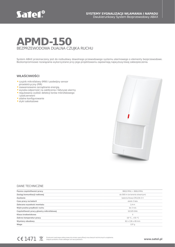 SYSTEMY SYGNALIZACJI WŁAMANIA I NAPADU Dwukierunkowy System Bezprzewodowy ABAX APMD-150 BEZPRZEWODOWA DUALNA CZUJKA RUCHU System ABAX przeznaczony jest do rozbudowy dowolnego przewodowego systemu alarmowego o elementy bezprzewodowe. Bezkompromisowe rozwiązania wykorzystane przy jego projektowaniu zapewniają najwyższą klasę zabezpieczenia. WŁAŚCIWOŚCI ••czujnik mikrofalowy (MW) i podwójny sensor piroelektryczny (PIR) ••zaawansowane zarządzanie energią ••wysoka odporność na zakłócenia i fałszywe alarmy ••regulowana czułość detekcji torów mikrofalowego i podczerwieni ••zdalne konfigurowanie ••styki sabotażowe DANE TECHNICZNE Pasmo częstotliwości pracy 868,0 MHz ÷ 868,6 MHz Zasięg komunikacji radiowej do 500 m (w terenie otwartym) Zasilanie bateria litowa CR123A 3 V Czas pracy na baterii około 3 lata Zalecana wysokość montażu 2,4 m Wykrywalna prędkość ruchu do 3 m/s Częstotliwość pracy głowicy mikrofalowej Klasa środowiskowa 10,525 GHz II Zakres temperatur pracy -10 °C...+55 °C Wymiary obudowy 62 x 136 x 49 mm Waga 137 g 1471 Producent zastrzega sobie prawo do zmiany specyfikacji oraz danych technicznych urządzenia. Zdjęcie produktu może odbiegać od rzeczywistości. www.satel.pl