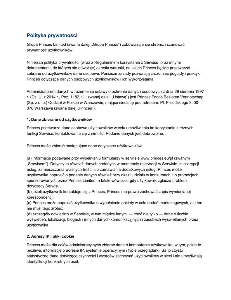 Polityka prywatności Grupa Princes Limited (zwana dalej: „Grupa Princes”) zobowiązuje się chronić i szanować prywatność użytkowników. Niniejsza polityka prywatności (wraz z Regulaminem korzystania z Serwisu oraz innymi dokumentami, do których się odwołuje) określa warunki, na jakich Princes będzie przetwarzał zebrane od użytkowników dane osobowe. Poniższe zasady pozwalają zrozumieć poglądy i praktyki Princes dotyczące danych osobowych użytkowników i ich wykorzystania. Administratorem danych w rozumieniu ustawy o ochronie danych osobowych z dnia 29 sierpnia 1997 r. (Dz. U. z 2014 r., Poz. 1182, t.j.; zwanej dalej: „Ustawą”) jest Princes Foods Besloten Vennotschap (Sp. z o. o.) Oddział w Polsce w Warszawie, mająca siedzibę pod adresem: Pl. Piłsudskiego 3, 00078 Warszawa (zwana dalej „Princes”). 1. Dane zbierane od użytkowników Princes przetwarza dane osobowe użytkowników w celu umożliwienia im korzystania z różnych funkcji Serwisu, kontaktowania się z nimi itd. Podanie danych jest dobrowolne. Princes może zbierać następujące dane dotyczące użytkowników: (a) informacje podawane przy wypełnianiu formularzy w serwisie www.princes.eu/pl (zwanym „Serwisem”). Dotyczy to również danych podanych w momencie rejestracji w Serwisie, subskrypcji usług, zamieszczania własnych treści lub zamawiania dodatkowych usług. Princes może użytkownika poprosić o podanie danych również przy okazji udziału w konkursach lub promocjach sponsorowanych przez Princes Limited, a także wówczas, gdy użytkownik zgłasza problem dotyczący Serwisu; (b) jeżeli użytkownik kontaktuje się z Princes, Princes ma prawo zachować zapis wymienianej korespondencji; (c) Princes może poprosić użytkownika o wypełnienie ankiety w celu badań marketingowych, ale ten nie musi tego zrobić; (d) szczegóły odwiedzin w Serwisie, w tym między innymi — choć nie tylko — dane o liczbie wyświetleń, lokalizacji, blogach i innych danych komunikacyjnych i zasobach wyświetlanych przez użytkownika. 2. Adresy IP i pliki cookie Princes może dla celów administracyjnych zbierać dane o komputerze użytkownika, w tym, gdzie to możliwe, informacje o adresie IP, systemie operacyjnym i typie przeglądarki. Są to czysto statystyczne dane dotyczące czynności i wzorców zachowań użytkowników w sieci i nie umożliwiają identyfikacji konkretnych osób. W tym samym celu Princes może pozyskiwać informacje o ogólnych wzorcach korzystania z Internetu, instalując pliki cookie w komputerach użytkowników. Pliki cookie zawierają informacje przenoszone na twardy dysk komputera. Pozwalają Princes udoskonalać Serwis i dostarczać użytkownikom lepszych i bardziej zindywidualizowanych usług. Umożliwiają: (a) oszacowanie liczby użytkowników i wzorca korzystania z Serwisu; (b) przechowywanie danych o preferencjach użytkowników, a przez to dostosowanie Serwisu do ich indywidualnych zainteresowań; (c) przyspieszanie wyszukiwania; (d) rozpoznawanie użytkowników podczas ponownych odwiedzin. Użytkownik może wyrazić zgodę na instalację plików cookies wybierając w przeglądarce odpowiednie ustawienia. Użytkownik może, również poprzez ustawienia przeglądarki, odmówić zgody na instalację plików cookies. Jeżeli jednak zdecyduje się na ten krok, może utracić dostęp do niektórych części Serwisu. 3. Miejsce przechowywania danych osobowych Dane zbierane przez Princes od użytkowników mogą być przenoszone i przechowywane poza obrębem Europejskiego Obszaru Gospodarczego („EOG”). Mogą być również przetwarzane przez pracujący poza EOG personel. W zakresie, w jakim dane osobowe są przekazywane poza Europejski Obszar Gospodarczy, mogą one być poddane prawom krajów, w których są przechowywane lub przetwarzane, przy czym kraje takie mogą stosować inny system ochrony danych osobowych niż Polska. Princes dokłada niezbędnych starań, aby dane przechowywane były w sposób bezpieczny i zgodny ze stosownymi przepisami dotyczącymi ochrony danych osobowych. Wszelkie dane udostępnione Princes przechowywane są na bezpiecznych serwerach. Jeżeli użytkownik otrzymał (lub samodzielnie wybrał) hasło umożliwiające dostęp do określonych części Serwisu, odpowiada za zachowanie go w tajemnicy. Nie należy się z nikim dzielić swoim hasłem. Niestety przesyłanie danych za pośrednictwem Internetu nie zawsze jest w pełni bezpieczne. Mimo że Princes dokłada wszelkich starań, aby chronić dane osobowe użytkowników, nie może zagwarantować bezpieczeństwa danych przesłanych do Serwisu; przesyłanie takie odbywa się na własne ryzyko użytkownika. Po odebraniu danych Princes stosuje jednak rygorystyczne procedury i środki bezpieczeństwa, aby zapobiec nieautoryzowanemu do nich dostępowi. 4. Wykorzystanie zgromadzonych informacji Princes wykorzystuje dane użytkowników w następujący sposób: (a) aby zaprezentować treści Serwisu w sposób najlepiej dostosowany do potrzeb użytkownika i jego komputera; (b) aby dostarczyć użytkownikowi informacji, produktów lub usług, z prośbą o które zwraca się bezpośrednio do Princes lub które w opinii Princes mogą go zainteresować, o ile użytkownik wyraził zgodę na kontakt w takim celu; (c) aby wywiązać się ze zobowiązań wynikających z umowy zawartej między użytkownikiem a Princes; (d) aby umożliwić użytkownikowi korzystanie z interaktywnych usług, kiedy tylko zechce; (e) aby powiadamiać użytkownika o wprowadzanych zmianach. Princes może również wykorzystać dane osobowe dla swoich celów marketingowych lub przekazać dane osobom trzecim, aby mogły one dostarczyć użytkownikom informacji o swoich towarach i usługach, które mogą zainteresować użytkowników (jeżeli użytkownik wyrazi zgodę na przetwarzanie jego danych osobowych w tym celu). O ile użytkownik wyrazi na to zgodę, Princes może się z nim kontaktować w celach marketingowych środkami komu