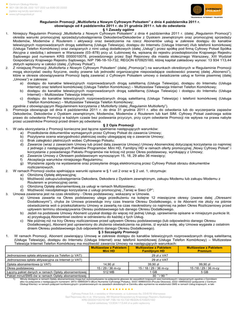 Centrum Obsługi Klienta 801 08 08 08, 222 127 222 lub 699 00 2222 (opłata wg taryfy operatora) www.cyfrowypolsat.pl 1. 2. 3. 1. 2. 3. 1. Regulamin Promocji „Multioferta z Nowym Cyfrowym Polsatem” z dnia 4 października 2011 r. obowiązuje od 4 października 2011 r. do 31 grudnia 2011 r. lub do odwołania § 1 Zasady ogólne Niniejszy Regulamin Promocji „Multioferta z Nowym Cyfrowym Polsatem” z dnia 4 października 2011 r. (dalej „Regulamin Promocji”) określa warunki promocyjnej sprzedaży/udostępnienia Dekoderów/Dekoderów z Dyskiem zewnętrznym oraz promocyjnej sprzedaży Modemów, Modemów z Routerem i aktywacji oraz świadczenia na rzecz Abonentów usług w zakresie dostępu do kanałów telewizyjnych rozprowadzanych drogą satelitarną (Usługa Telewizja), dostępu do Internetu (Usługa Internet) i/lub telefonii komórkowej (Usługa Telefon Komórkowy) oraz związanych z nimi usług dodatkowych (dalej „Usługi”) przez spółkę pod firmą Cyfrowy Polsat Spółka Akcyjna z siedzibą i adresem w Warszawie (03–878) przy ul. Łubinowej 4a, wpisaną do rejestru przedsiębiorców Krajowego Rejestru Sądowego pod numerem KRS 0000010078, prowadzonego przez Sąd Rejonowy dla miasta stołecznego Warszawy, XIII Wydział Gospodarczy Krajowego Rejestru Sądowego, NIP 796-18-10-732, REGON 670925160, której kapitał zakładowy wynosi: 13 934 113,44 złotych wpłacony w całości (dalej „Cyfrowy Polsat”). Z niniejszej Promocji „Multioferta z Nowym Cyfrowym Polsatem” (dalej „Promocja”) na warunkach określonych w Regulaminie Promocji mogą skorzystać osoby fizyczne, osoby prawne lub jednostki organizacyjne nieposiadające osobowości prawnej (dalej „Abonenci”), które w okresie obowiązywania Promocji będą zawierać z Cyfrowym Polsatem umowy o świadczenie usług w formie pisemnej (dalej „Umowa”) w zakresie: a) dostępu do kanałów telewizyjnych rozprowadzanych drogą satelitarną (Usługa Telewizja), dostępu do Internetu (Usługa Internet) oraz telefonii komórkowej (Usługa Telefon Komórkowy) – Multizestaw Telewizja Internet Telefon Komórkowy; b) dostępu do kanałów telewizyjnych rozprowadzanych drogą satelitarną (Usługa Telewizja) i dostępu do Internetu (Usługa Internet) – Multizestaw Telewizja Internet; c) dostępu do kanałów telewizyjnych rozprowadzanych drogą satelitarną (Usługa Telewizja) i telefonii komórkowej (Usługa Telefon Komórkowy) – Multizestaw Telewizja Telefon Komórkowy; zgodnie z obowiązującym Regulaminem korzystania z Multioferty (dalej „Regulamin Multioferty”). Promocja obowiązuje od dnia 4 października 2011 r. do dnia 31 grudnia 2011 r. albo do odwołania lub do wyczerpania zapasów Dekoderów, Dekoderów z Dyskiem zewnętrznym, Modemów, Modemów z Routerem lub kart SIM. Cyfrowy Polsat zastrzega sobie prawo do odwołania Promocji w każdym czasie bez podawania przyczyn, przy czym odwołanie Promocji nie wpływa na prawa nabyte przez uczestników Promocji przed dniem jej odwołania. § 2 Opis Promocji W celu skorzystania z Promocji konieczne jest łączne spełnienie następujących warunków: a) Przedłożenie dokumentów wymaganych przez Cyfrowy Polsat do zawarcia Umowy; b) Pozytywna ocena wiarygodności płatniczej osoby ubiegającej się o zawarcie Umowy; c) Brak zaległości płatniczych wobec Cyfrowego Polsatu; d) Zawarcie (wraz z zawarciem Umowy lub przed datą zawarcia Umowy) Umowy Abonenckiej dotyczącej korzystania co najmniej z jednego z następujących Pakietów Programów: Mini HD, Familijny HD w ramach oferty promocyjnej „Nowy Cyfrowy Polsat” i korzystanie z posiadanego Pakietu Programów nie krócej niż przez Okres podstawowy, wynikający z Umowy; e) Zawarcie Umowy z Okresem podstawowym wynoszącym 15, 18, 29 albo 36 miesięcy; f) Akceptacja warunków niniejszego Regulaminu; g) Wyrażenie zgody na wystawianie oraz przesyłanie drogą elektroniczną przez Cyfrowy Polsat obrazu dokumentów rozliczeniowych. W ramach Promocji osoba spełniająca warunki opisane w § 1 ust 2 oraz w § 2 ust. 1, otrzymuje: a) Obniżoną Opłatę aktywacyjną; b) Możliwość zakupu/udostępnienia Dekodera, Dekodera z Dyskiem zewnętrznym, zakupu Modemu lub zakupu Modemu z Routerem w promocyjnej cenie; c) Obniżoną Opłatę abonamentową za usługi w ramach Multizestawu; d) Możliwość nieodpłatnego korzystania z usługi promocyjnej „Taniej w Sieci CP”; Umowa zawierana jest na czas określony - Okres podstawowy, wskazany w Umowie. a) Umowa zawarta na Okres podstawowy ulega przedłużeniu na kolejne 12 miesięczne okresy (zwane dalej „Okresami Dodatkowymi”), chyba że Umowa przewiduje inny czas trwania Okresu Dodatkowego, o ile Abonent nie złoży na piśmie oświadczenia woli o przekształceniu Umowy w zawartą na czas nieokreślony co najmniej na jeden Okres Rozliczeniowy przed upływem terminu obowiązywania Okresu podstawowego lub danego Okresu Dodatkowego. b) Jeżeli na podstawie Umowy Abonent uzyskał dostęp do więcej niż jednej Usługi, uprawnienia opisane w niniejszym punkcie lit. a) przysługują Abonentowi osobno w odniesieniu do każdej z tych Usług. c) Nie później niż na trzy Okresy rozliczeniowe przed upływem Okresu podstawowego (lub odpowiednio danego Okresu Dodatkowego), Abonent jest uprawniony do złożenia oświadczenia na piśmie, iż wyraża wolę, aby Umowa wygasła z ostatnim dniem Okresu podstawowego (lub odpowiednio danego Okresu Dodatkowego). § 3 Szczegóły Promocji W ramach Promocji, Abonent zawierający Umowę w zakresie dostępu do kanałów telewizyjnych rozprowadzanych drogą satelitarną (Usługa Telewizja), dostępu do Internetu (Usługa Internet) oraz telefonii komórkowej (Usługa Telefon Komórkowy) – Multizestaw Telewizja Internet Telefon Komórkowy ma możliwość zawarcia Umowy na następujących warunkach: Multizestaw z Pakietem Mini HD Jednorazowa opłata aktywacyjna za Telefon (z VAT) Jednorazowa opłata aktywacyjna za Internet (z VAT) Opłata 