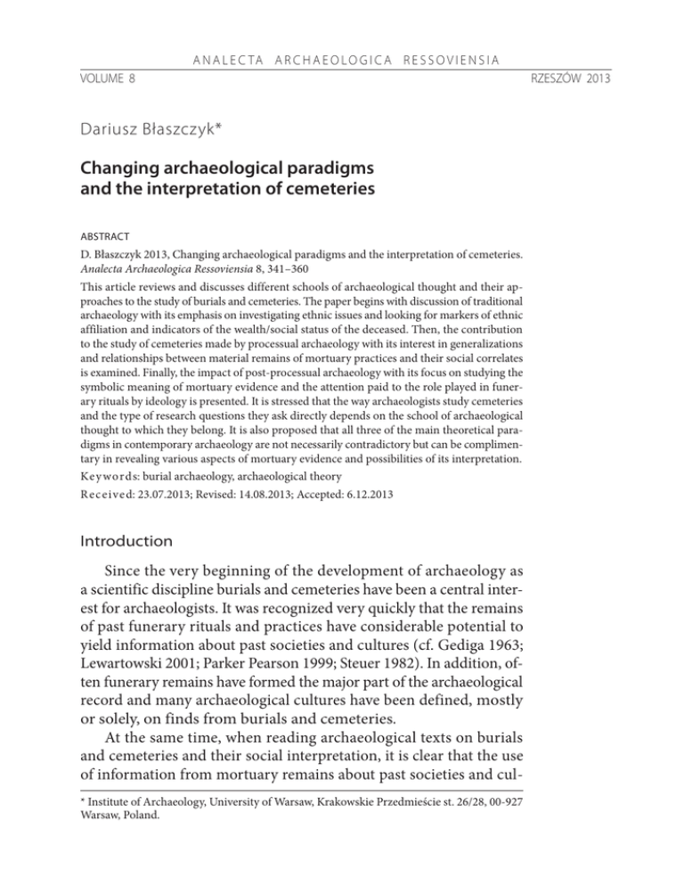 A N A L E C TA A R C H A E O L O G I C A R E S S O V I E N S I A VOLUME 8 Dariusz Błaszczyk* Changing archaeological paradigms and the interpretation of cemeteries ABSTRACT D. Błaszczyk 2013, Changing archaeological paradigms and the interpretation of cemeteries. Analecta Archaeologica Ressoviensia 8, 341–360 This article reviews and discusses different schools of archaeological thought and their approaches to the study of burials and cemeteries. The paper begins with discussion of traditional archaeology with its emphasis on investigating ethnic issues and looking for markers of ethnic affiliation and indicators of the wealth/social status of the deceased. Then, the contribution to the study of cemeteries made by processual archaeology with its interest in generalizations and relationships between material remains of mortuary practices and their social correlates is examined. Finally, the impact of post-processual archaeology with its focus on studying the symbolic meaning of mortuary evidence and the attention paid to the role played in funerary rituals by ideology is presented. It is stressed that the way archaeologists study cemeteries and the type of research questions they ask directly depends on the school of archaeological thought to which they belong. It is also proposed that all three of the main theoretical paradigms in contemporary archaeology are not necessarily contradictory but can be complimentary in revealing various aspects of mortuary evidence and possibilities of its interpretation. Ke y words: burial archaeology, archaeological theory Received: 23.07.2013; Revised: 14.08.2013; Accepted: 6.12.2013 Introduction Since the very beginning of the development of archaeology as a scientific discipline burials and cemeteries have been a central interest for archaeologists. It was recognized very quickly that the remains of past funerary rituals and practices have considerable potential to yield information about past societies and cultures (cf. Gediga 1963; Lewartowski 2001; Parker Pearson 1999; Steuer 1982). In addition, often funerary remains have formed the major part of the archaeological record and many archaeological cultures have been defined, mostly or solely, on finds from burials and cemeteries. At the same time, when reading archaeological texts on burials and cemeteries and their social interpretation, it is clear that the use of information from mortuary remains about past societies and cul* Institute of Archaeology, University of Warsaw, Krakowskie Przedmieście st. 26/28, 00-927 Warsaw, Poland. RZESZÓW 2013 342 | Dariusz Błaszczyk tures to a large extent depends on the way archaeologists think. To put it another way, the attitudes and ways of studying burials and cemeteries are determined by the theoretical and methodological assumptions and frameworks which archaeologists currently accept and work within (Drewett 2011, 8–12). This article reviews and discusses different schools of archaeological thought and their approaches to the study of burials and cemeteries as well as the social analysis and interpretation of mortuary remains (see Marciniak 2012, 29–83). Traditional archaeology (evolutionary and culture-historical approaches) The study of cemeteries in traditional archaeology has focused primarily on the interpretation of ethnic issues. Research procedures have aimed to determine from mortuary remains influences and cultural contacts, as well as identifying material markers for the ethnic affiliation of the dead. Here, various elements of funerary customs have been considered, such as the form of graves, grave constructions and especially grave goods that might be of extraneous origin. This attitude has been underlined by the assumption that a person buried with exotic items is themselves also of foreign origin, belonging to the foreign ethnic group represented by the accompanying grave goods. Consequently, archaeologists working within a culture-historical approach have tended to emphasise the correlation between finds clustered in archaeological cultures and ethnic and linguistic groups. Traditional archaeologists have also tried to identify contacts between peoples through artefacts of supposedly foreign origins, amongst others, which according to them reflect population movements (migrations) or the spread of ideas (diffusion). This simplistic reasoning can be regarded as a simple empiricism and naive realism (in-depth discussion of the limitations of undertaking ethnic interpretations in archaeology can be found, for instance, in Ciesielska 2005; Jones 1998; Mamzer 1999; Urbańczyk 2000). On the one hand, the emphasis on ethnic attribution of funerary finds in the social interpretation of cemeteries within traditional archaeology is related to specific interests and research aims and objectives of this particular archaeological school of thought. On the other hand, it has been connected with the involvement of archaeologists Changing archaeological paradigms and the interpretation of cemeteries | 343 in power relations and supporting state institutions, and especially with the engagement of many archaeologists in building an ideology of a nation state (e.g. the issue of ethnogenesis, the beginnings of the state and the nation, providing land rights, etc.), (Kohl et al. 2007; see also Kohl 1998; Lindstrom 1998). This has been due to both the personal beliefs of individual researchers, as well as the fact that most archaeologists worked and continue to work in institutions or in posts funded by the state or its agencies. The Millennium Project, organized and sponsored by the state from 1949 to 1966, is a good example, as a project that aimed to research early medieval archaeological sites associated with the beginnings of the Polish state (Abramowicz 1991, 155–157; Gąssowski 1970, 256–260, 264–266). As mentioned above, ethnic interpretations in archaeology have usually been deeply involved in politics and have often been connected with