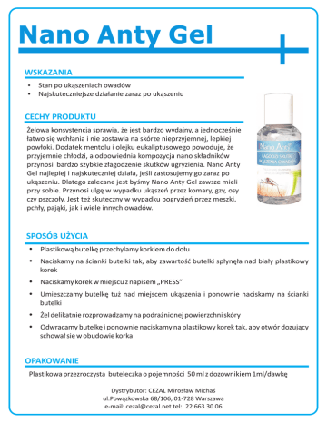 Nano Anty Gel WSKAZANIA ? ? Stan po ukąszeniach owadów Najskuteczniejsze działanie zaraz po ukąszeniu CECHY PRODUKTU Żelowa konsystencja sprawia, że jest bardzo wydajny, a jednocześnie łatwo się wchłania i nie zostawia na skórze nieprzyjemnej, lepkiej powłoki. Dodatek mentolu i olejku eukaliptusowego powoduje, że przyjemnie chłodzi, a odpowiednia kompozycja nano składników przynosi bardzo szybkie złagodzenie skutków ugryzienia. Nano Anty Gel najlepiej i najskuteczniej działa, jeśli zastosujemy go zaraz po ukąszeniu. Dlatego zalecane jest byśmy Nano Anty Gel zawsze mieli przy sobie. Przynosi ulgę w wypadku ukąszeń przez komary, gzy, osy czy pszczoły. Jest też skuteczny w wypadku pogryzień przez meszki, pchły, pająki, jak i wiele innych owadów. SPOSÓB UŻYCIA ? Plastikową butelkę przechylamy korkiem do dołu ? Naciskamy na ścianki butelki tak, aby zawartość butelki spłynęła nad biały plastikowy korek ? Naciskamy korek w miejscu z napisem „PRESS” ? Umieszczamy butelkę tuż nad miejscem ukąszenia i ponownie naciskamy na ścianki butelki ? Żel delikatnie rozprowadzamy na podrażnionej powierzchni skóry ? Odwracamy butelkę i ponownie naciskamy na plastikowy korek tak, aby otwór dozujący schował się w obudowie korka OPAKOWANIE Plastikowa przezroczysta buteleczka o pojemności 50 ml z dozownikiem 1ml/dawkę Dystrybutor: CEZAL Mirosław Michaś ul.Powązkowska 68/106, 01-728 Warszawa e-mail: [email protected] tel:. 22 663 30 06 Nano Anty Gel WSKAZANIA ? ? Stan po ukąszeniach owadów Najskuteczniejsze działanie zaraz po ukąszeniu CECHY PRODUKTU Żelowa konsystencja sprawia, że jest bardzo wydajny, a jednocześnie łatwo się wchłania i nie zostawia na skórze nieprzyjemnej, lepkiej powłoki. Dodatek mentolu i olejku eukaliptusowego powoduje, że przyjemnie chłodzi, a odpowiednia kompozycja nano składników przynosi bardzo szybkie złagodzenie skutków ugryzienia. Nano Anty Gel najlepiej i najskuteczniej działa, jeśli zastosujemy go zaraz po ukąszeniu. Dlatego zalecane jest byśmy Nano Anty Gel zawsze mieli przy sobie. Przynosi ulgę w wypadku ukąszeń przez komary, gzy, osy czy pszczoły. Jest też skuteczny w wypadku pogryzień przez meszki, pchły, pająki jak i wiele innych owadów. SPOSÓB UŻYCIA ? Plastikową butelkę przechylamy korkiem do dołu ? Naciskamy na ścianki butelki tak, aby zawartość butelki spłynęła nad biały plastikowy korek ? Naciskamy korek w miejscu z napisem „PRESS” ? Umieszczamy butelkę tuż nad miejscem ukąszenia i ponownie naciskamy na ścianki butelki ? Żel delikatnie rozprowadzamy na podrażnionej powierzchni skóry ? Odwracamy butelkę i ponownie naciskamy na plastikowy korek tak, aby otwór dozujący schował się w obudowie korka OPAKOWANIE Plastikowa przezroczysta buteleczka o pojemności 50 ml z dozownikiem 1ml/dawkę Dystrybutor: CEZAL Mirosław Michaś ul.Powązkowska 68/106, 01-728 Warszawa e-mail: [email protected] tel:. 22 663 30 06